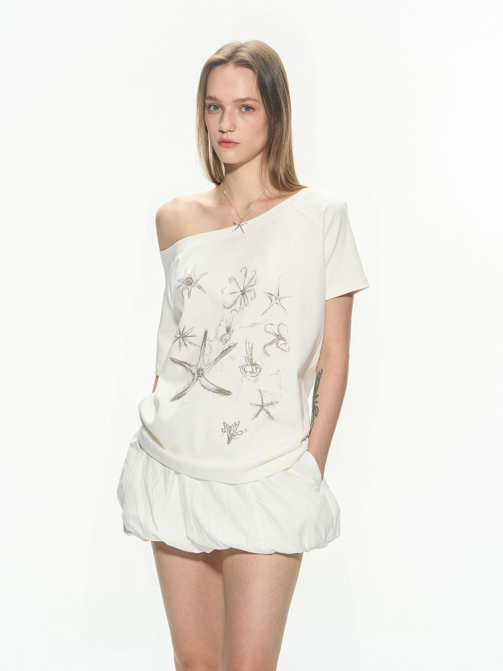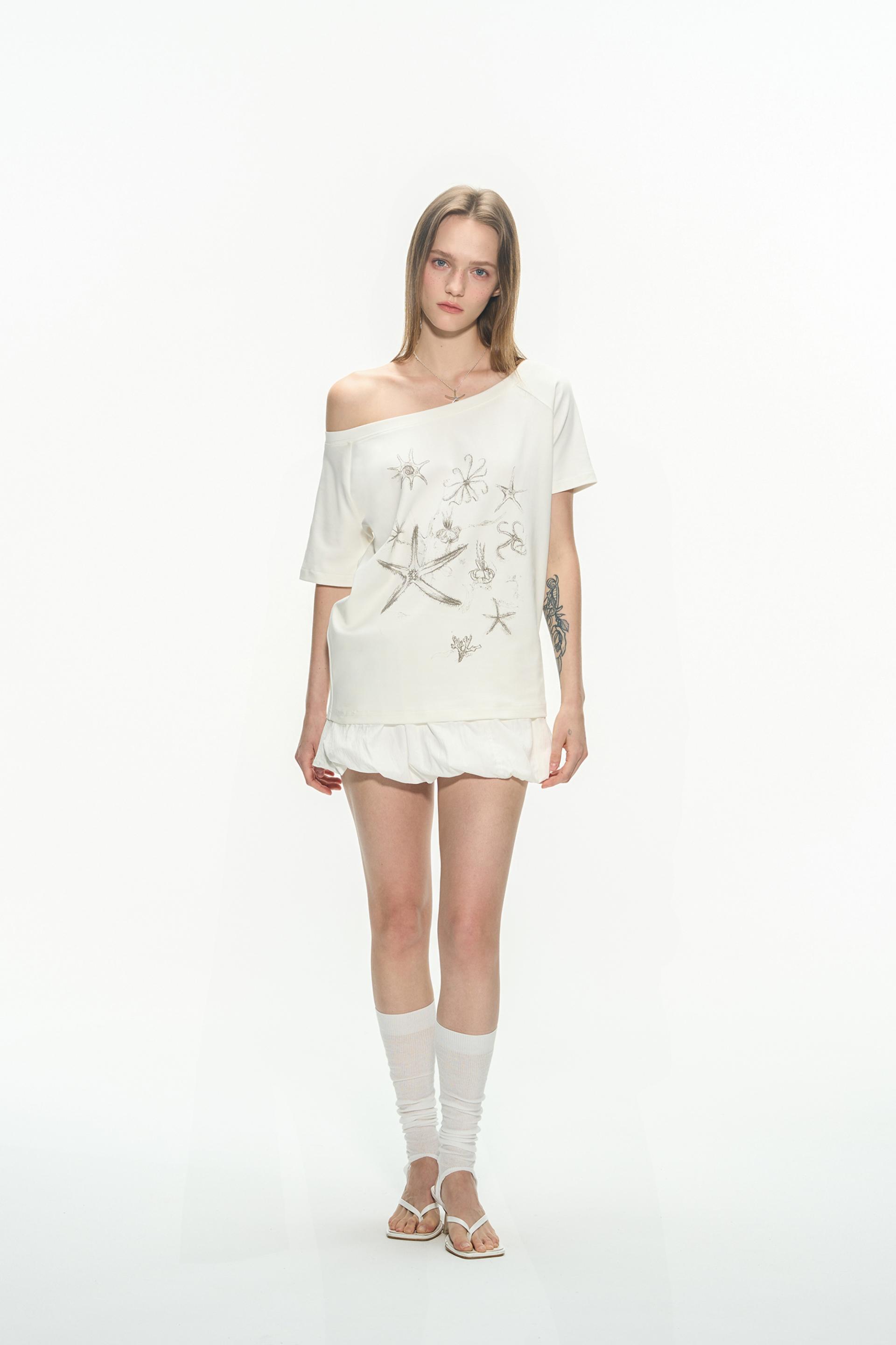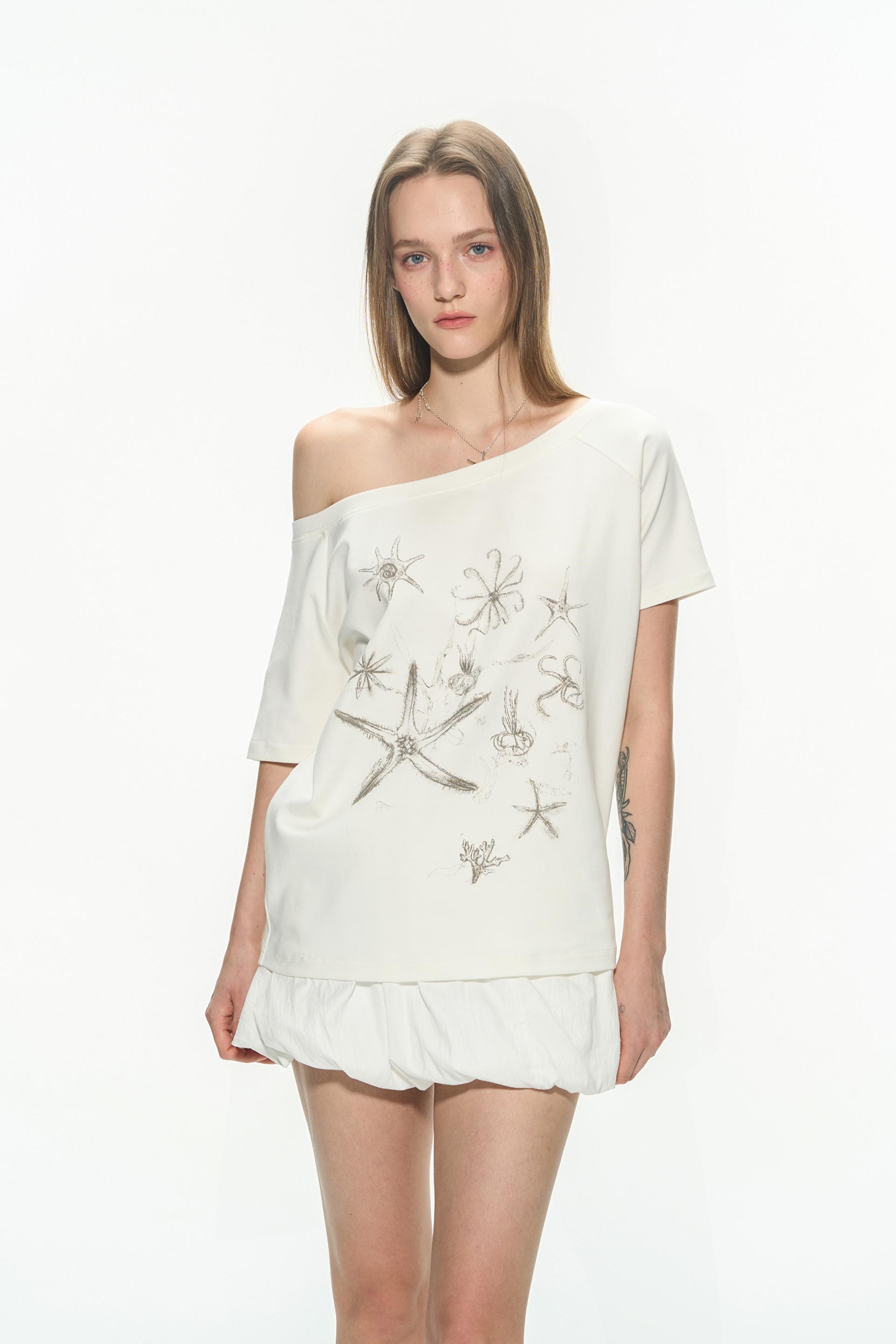 한쪽 어깨가 자연스럽게 드러나는 원숄더 디자인의 티셔츠로 부드럽고 가벼운 소재로 제작되어 여름철 시원하게 착용할 수 있으며, 전면에는 바다 생물을 모티프로 한 프린트를 더해 썸머 시즌 무드를 강조했습니다.