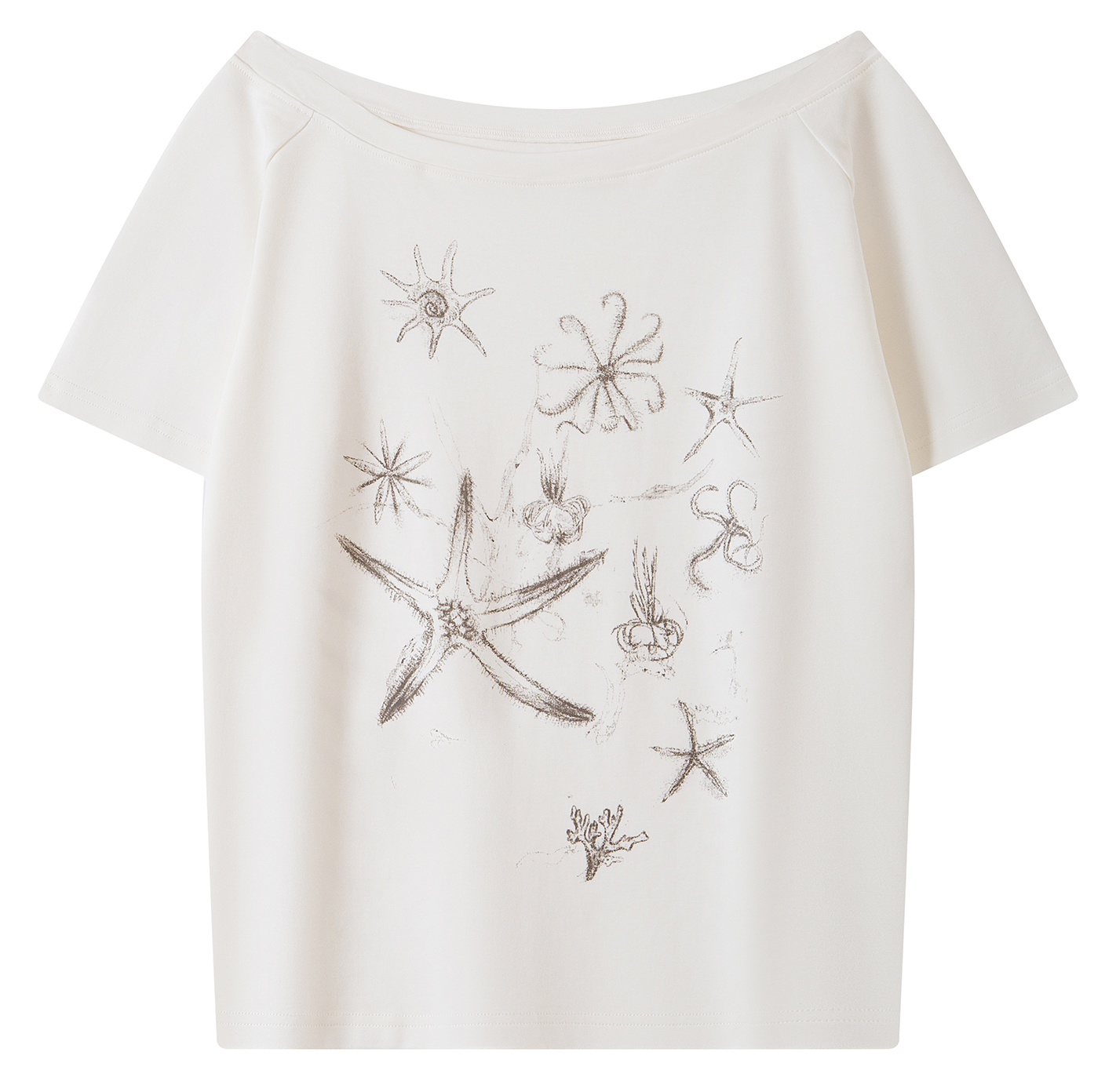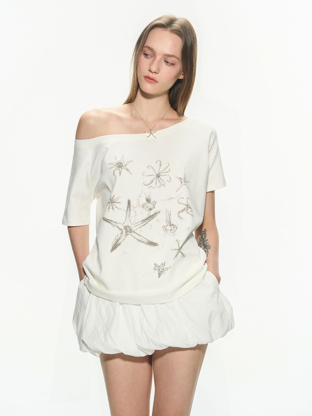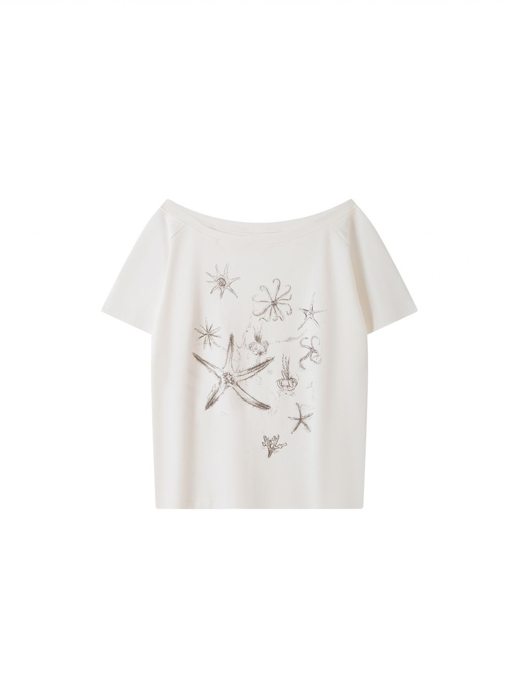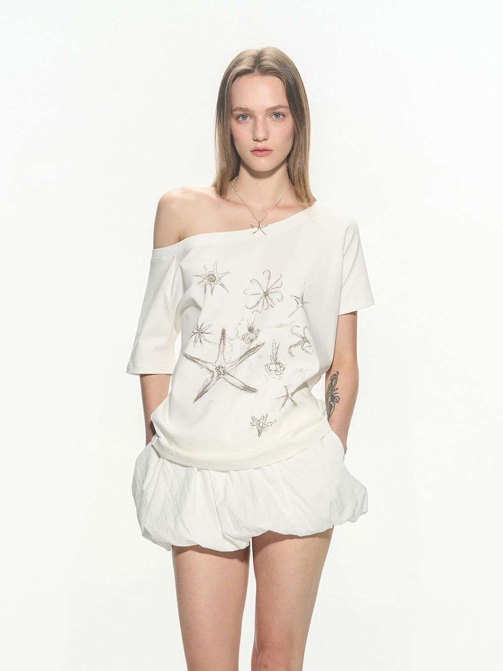 한쪽 어깨가 자연스럽게 드러나는 원숄더 디자인의 티셔츠로 부드럽고 가벼운 소재로 제작되어 여름철 시원하게 착용할 수 있으며, 전면에는 바다 생물을 모티프로 한 프린트를 더해 썸머 시즌 무드를 강조했습니다.