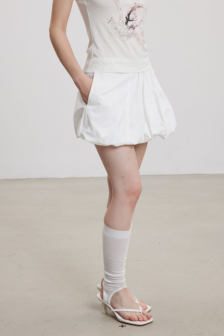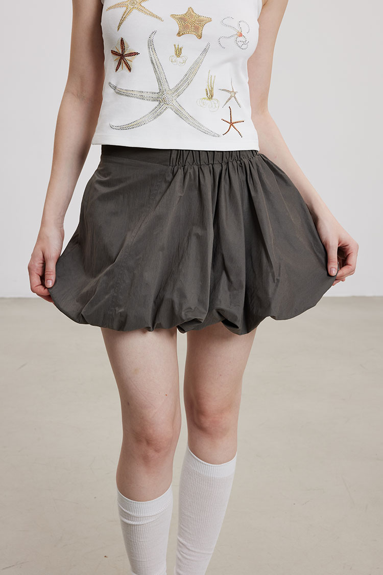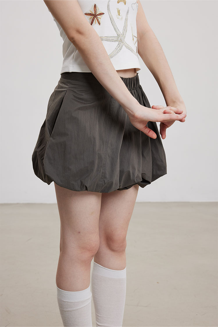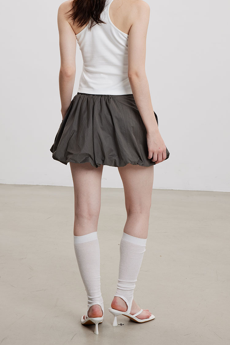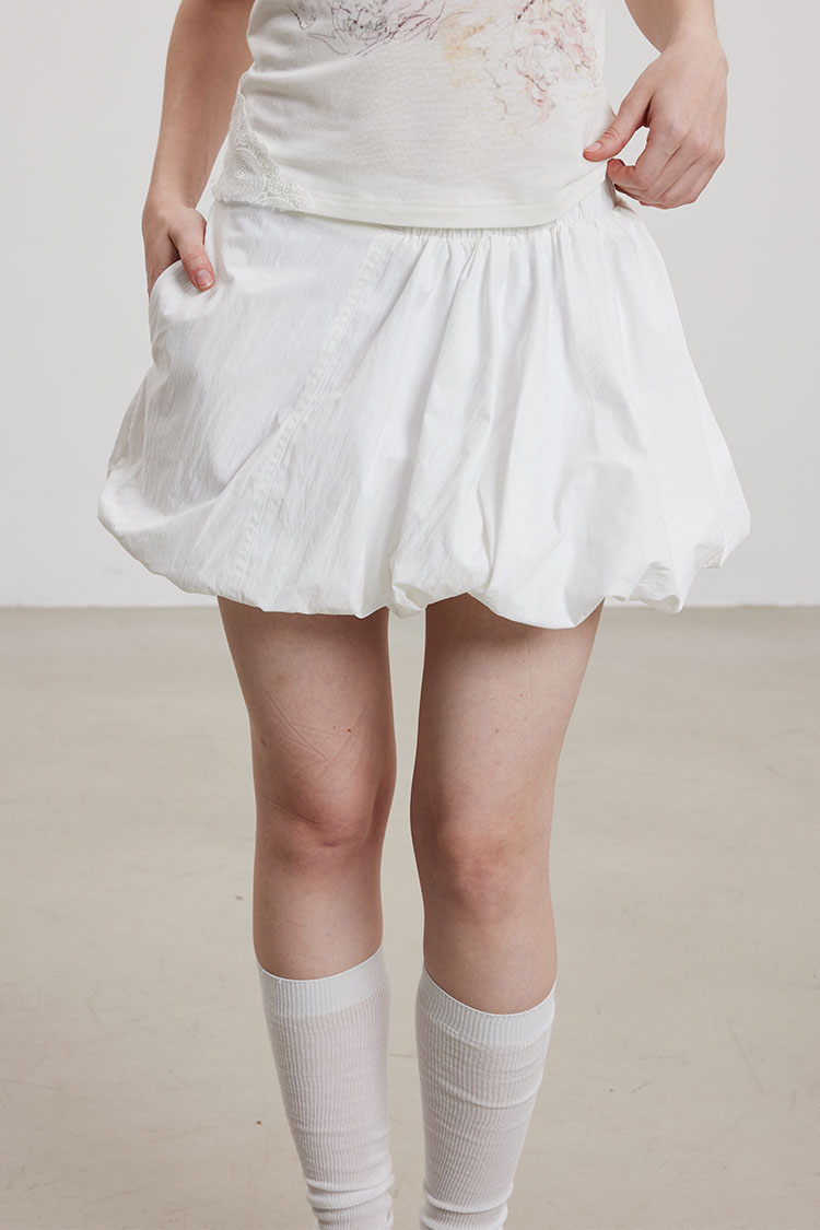 벌룬 실루엣으로 볼륨감 있게 떨어지는 미니 스커트로 가볍고 바스락한 나일론 소재로 제작되어 시원하고 쾌적하게 착용되며, 허리는 전체 밴딩으로 편안한 착용감을 더했습니다.