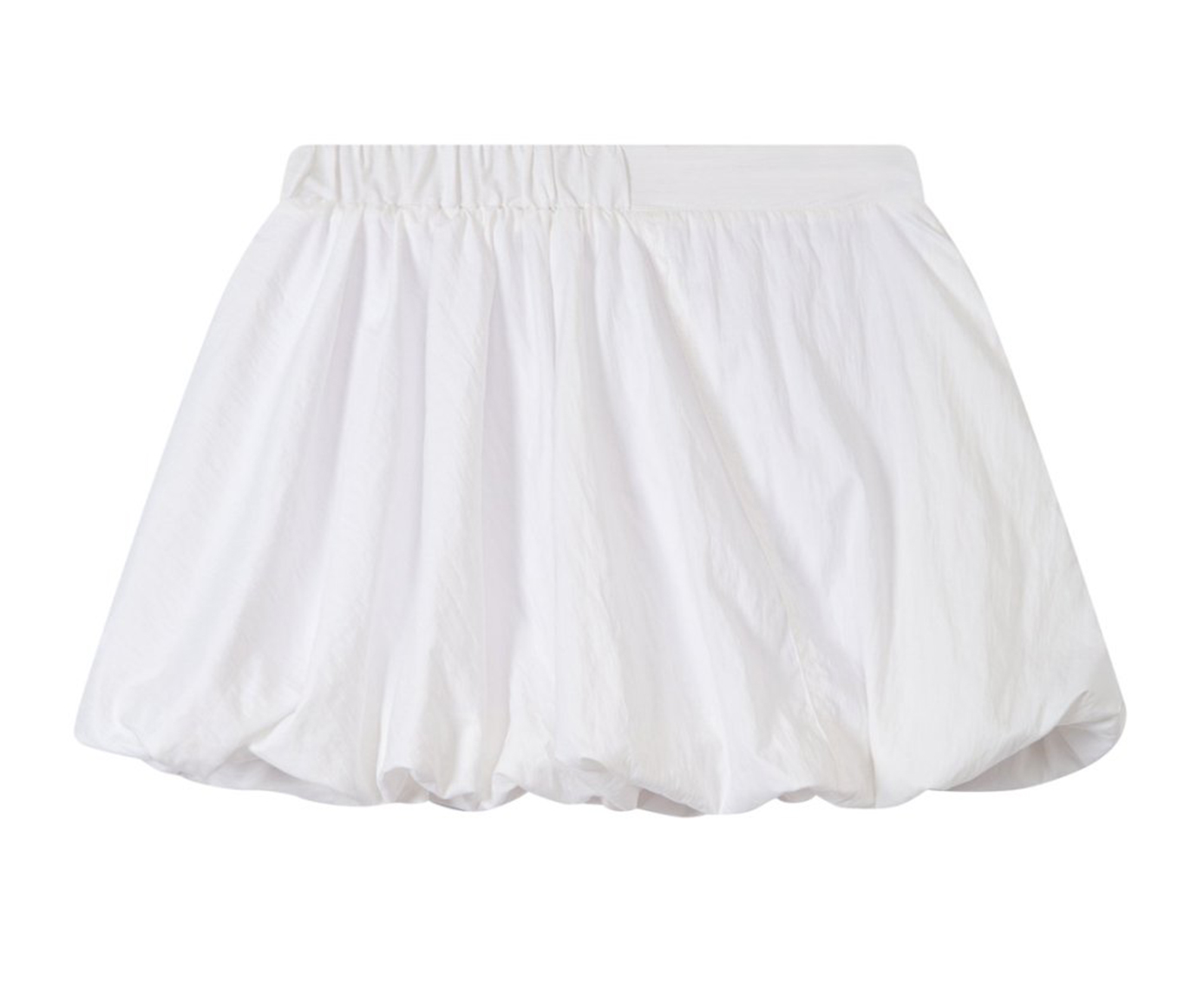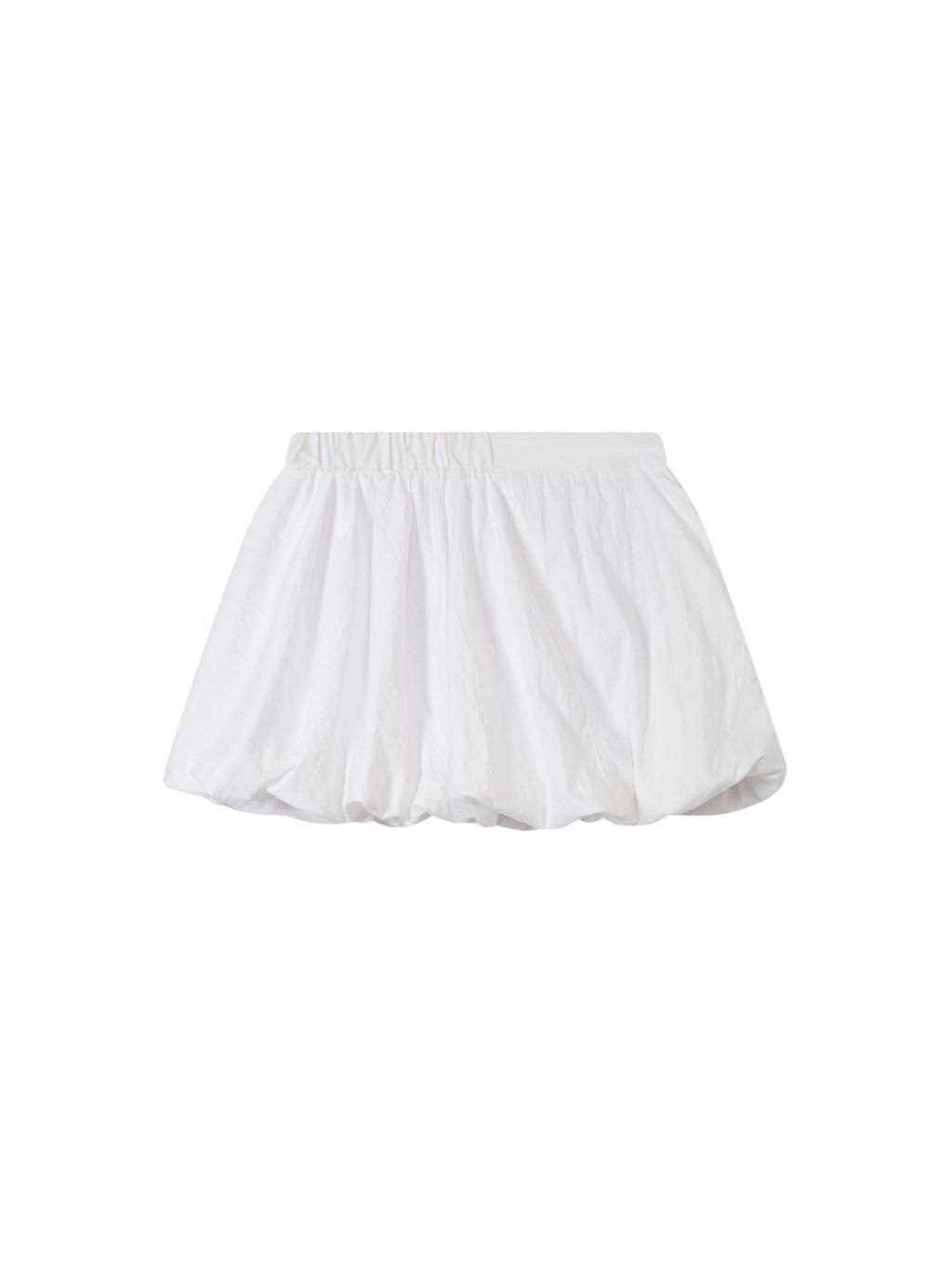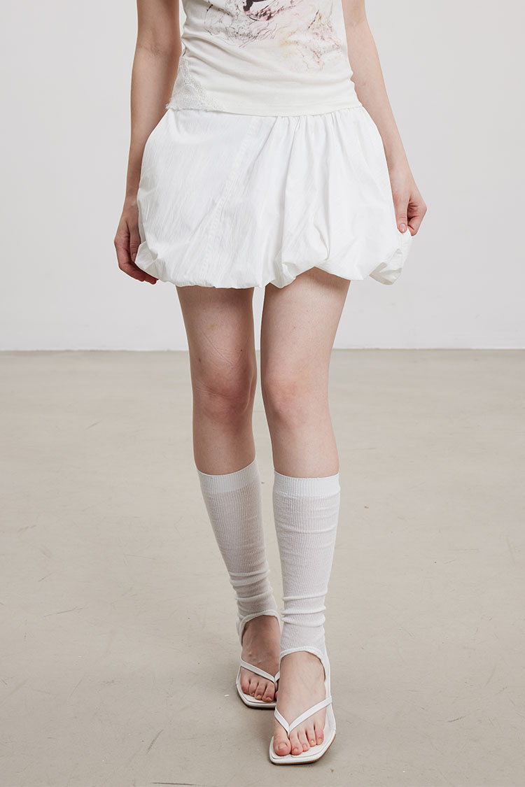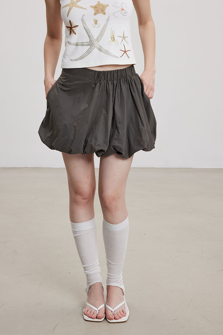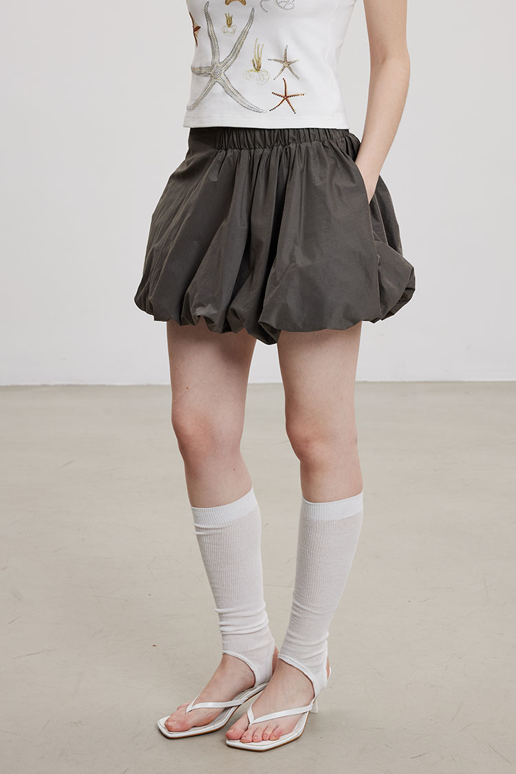 벌룬 실루엣으로 볼륨감 있게 떨어지는 미니 스커트로 가볍고 바스락한 나일론 소재로 제작되어 시원하고 쾌적하게 착용되며, 허리는 전체 밴딩으로 편안한 착용감을 더했습니다.