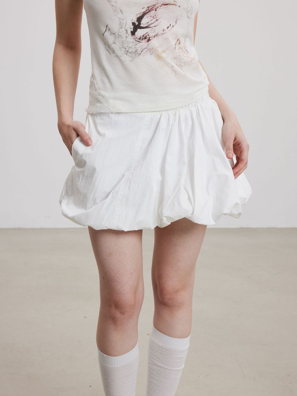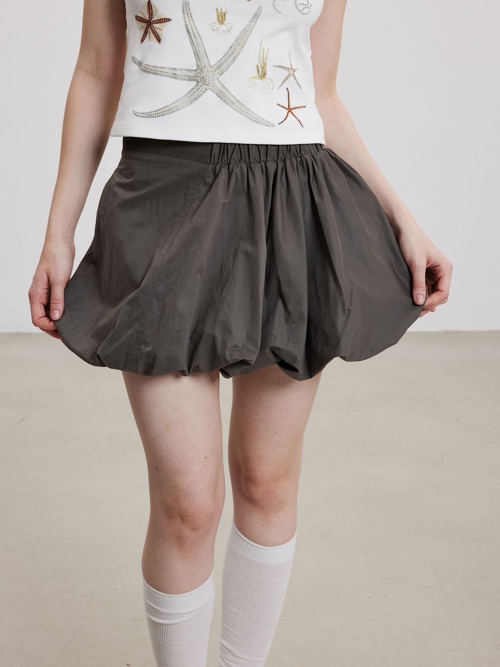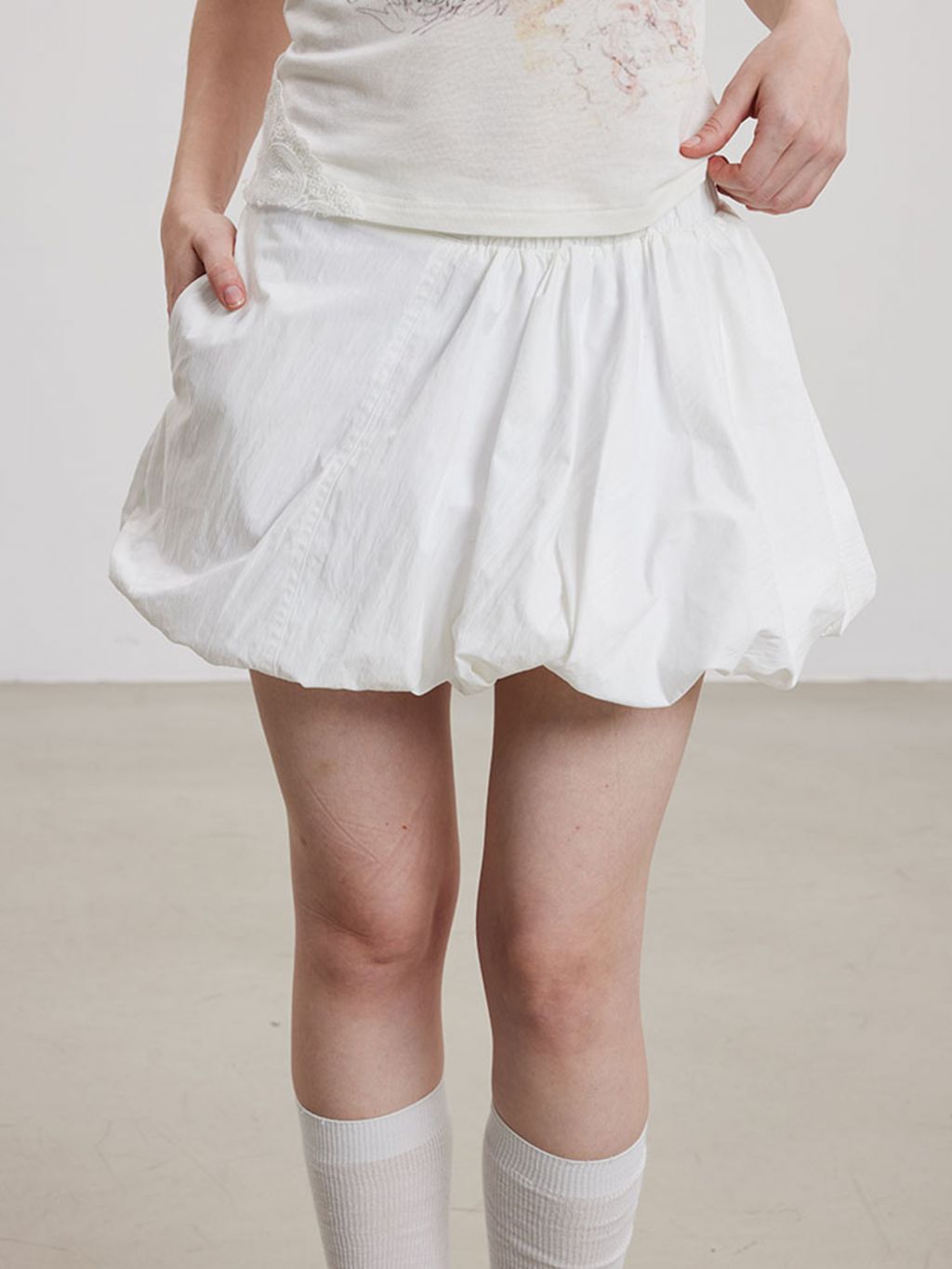- 하단 셔링으로 자연스럽게 풍성한 벌룬 실루엣 연출