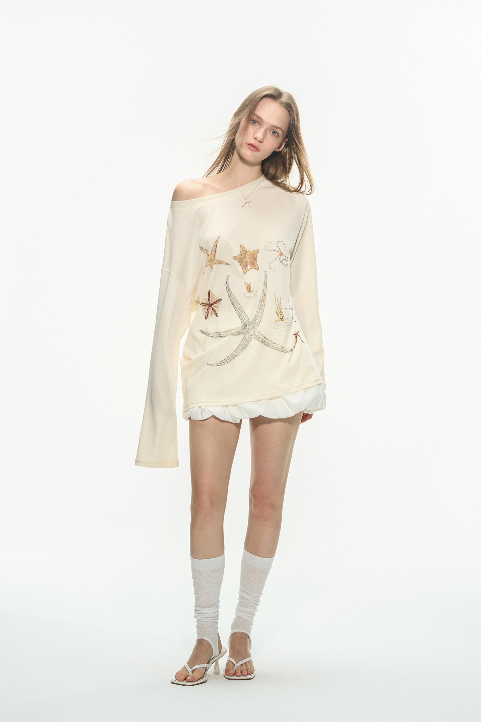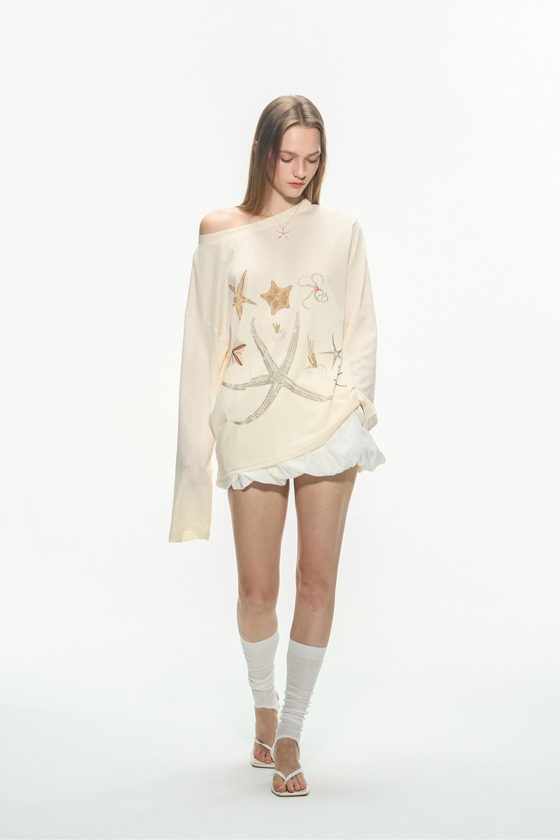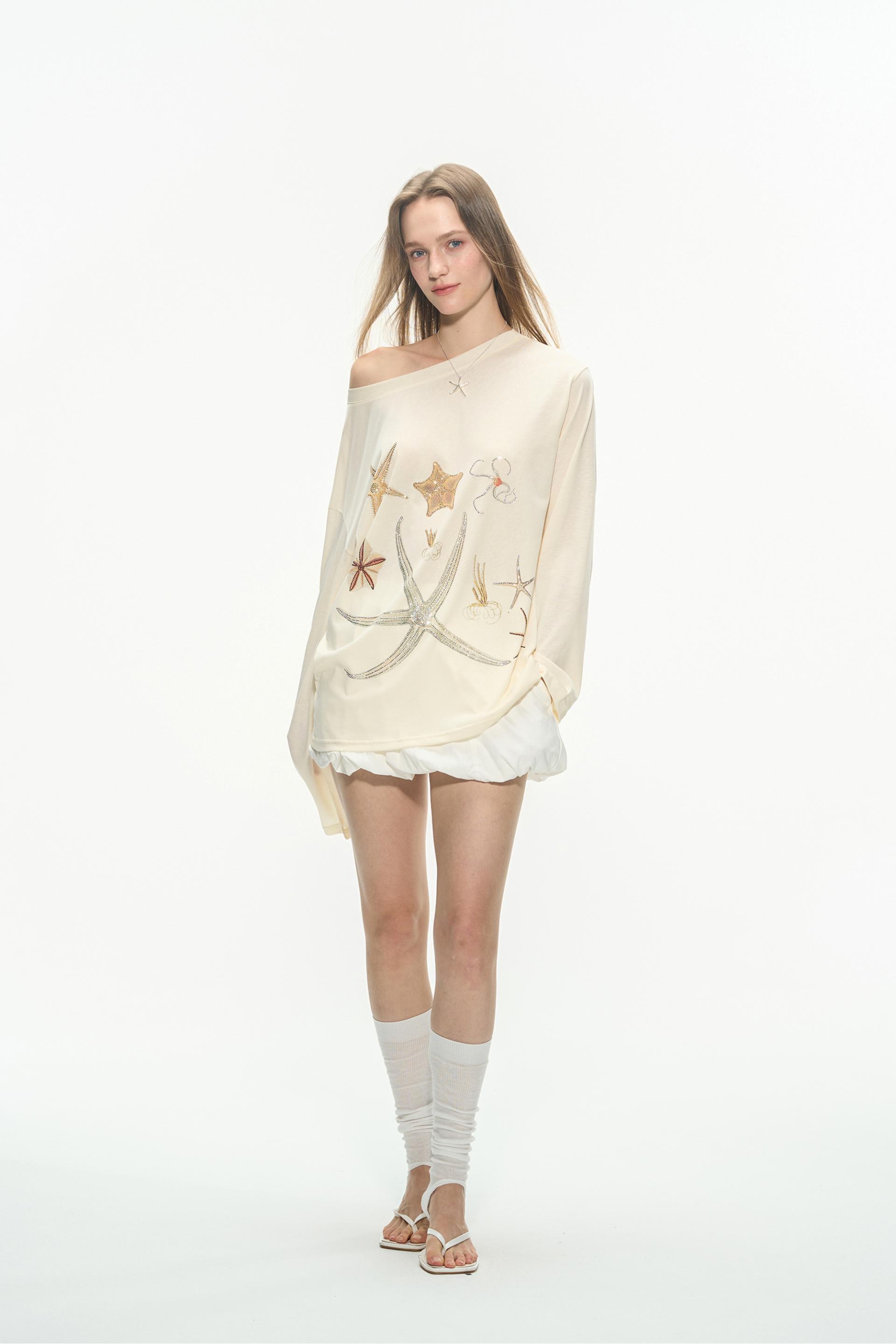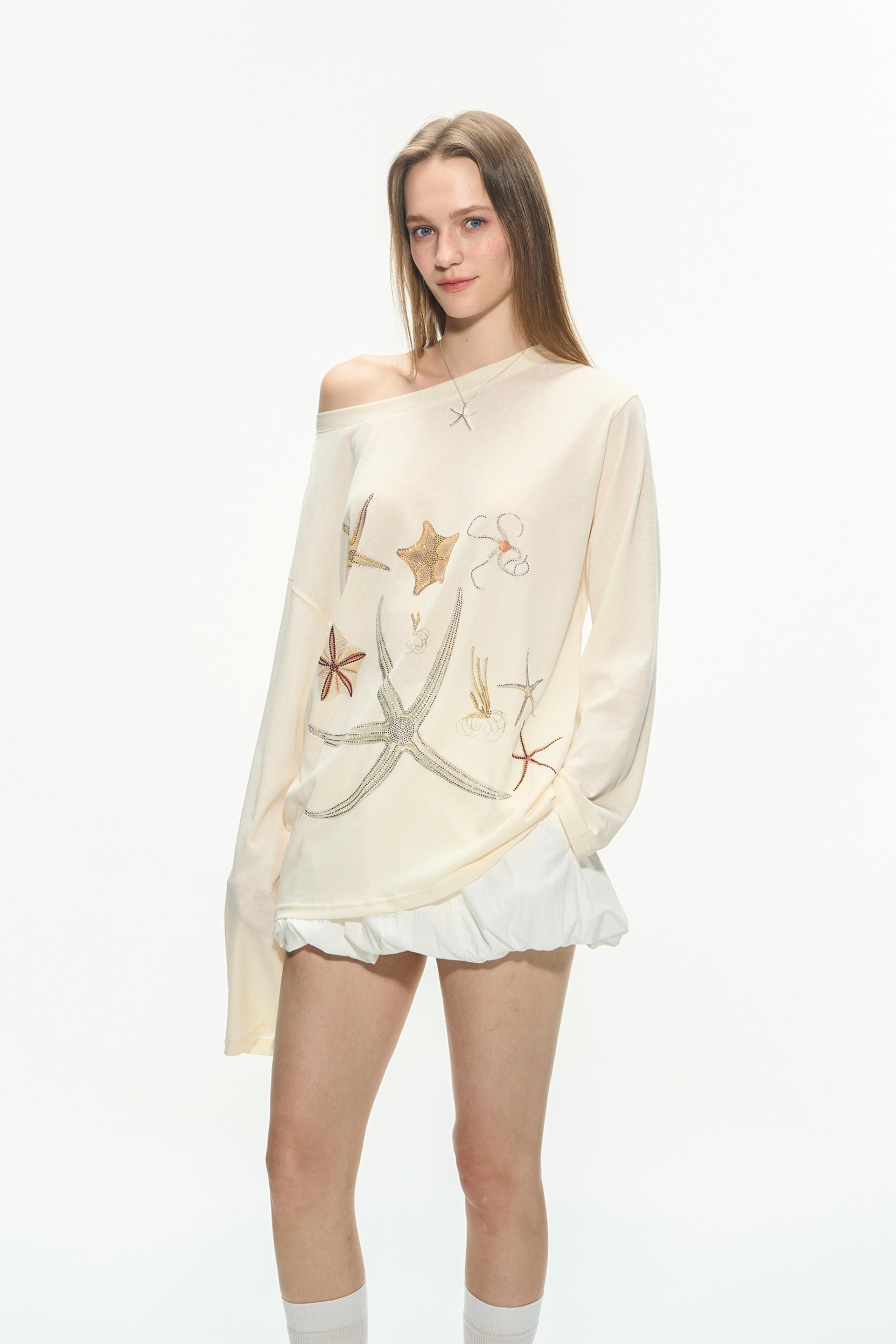 바다 생물을 모티브로 한 스톤 프린트가 돋보이는 루즈핏 롱슬리브 티셔츠로 부드러운 코튼 혼방 원단으로 제작되어 피부에 자극 없이 편안하며, 자연스럽게 떨어지는 오프숄더 실루엣이 여리한 분위기를 연출합니다.