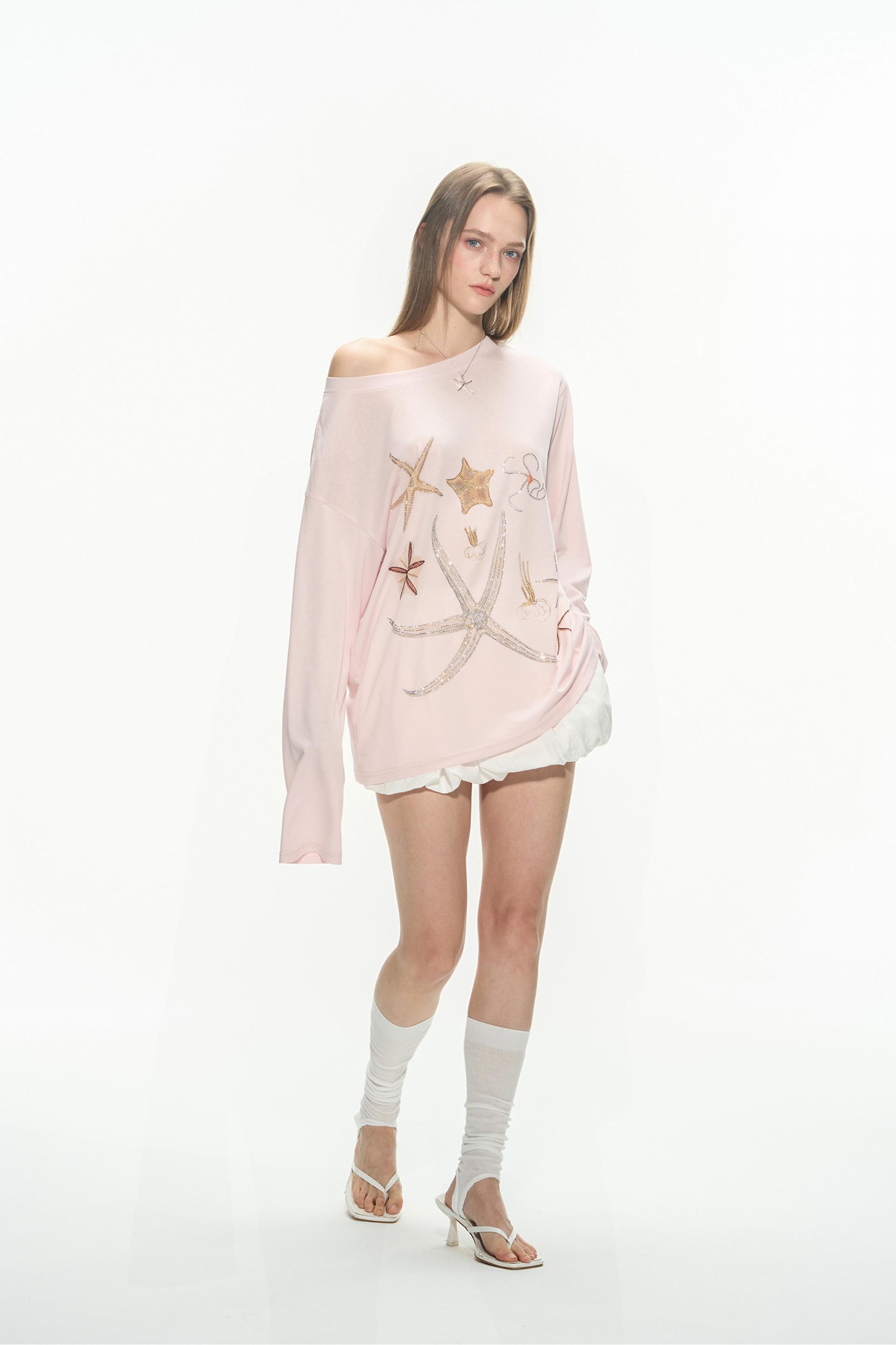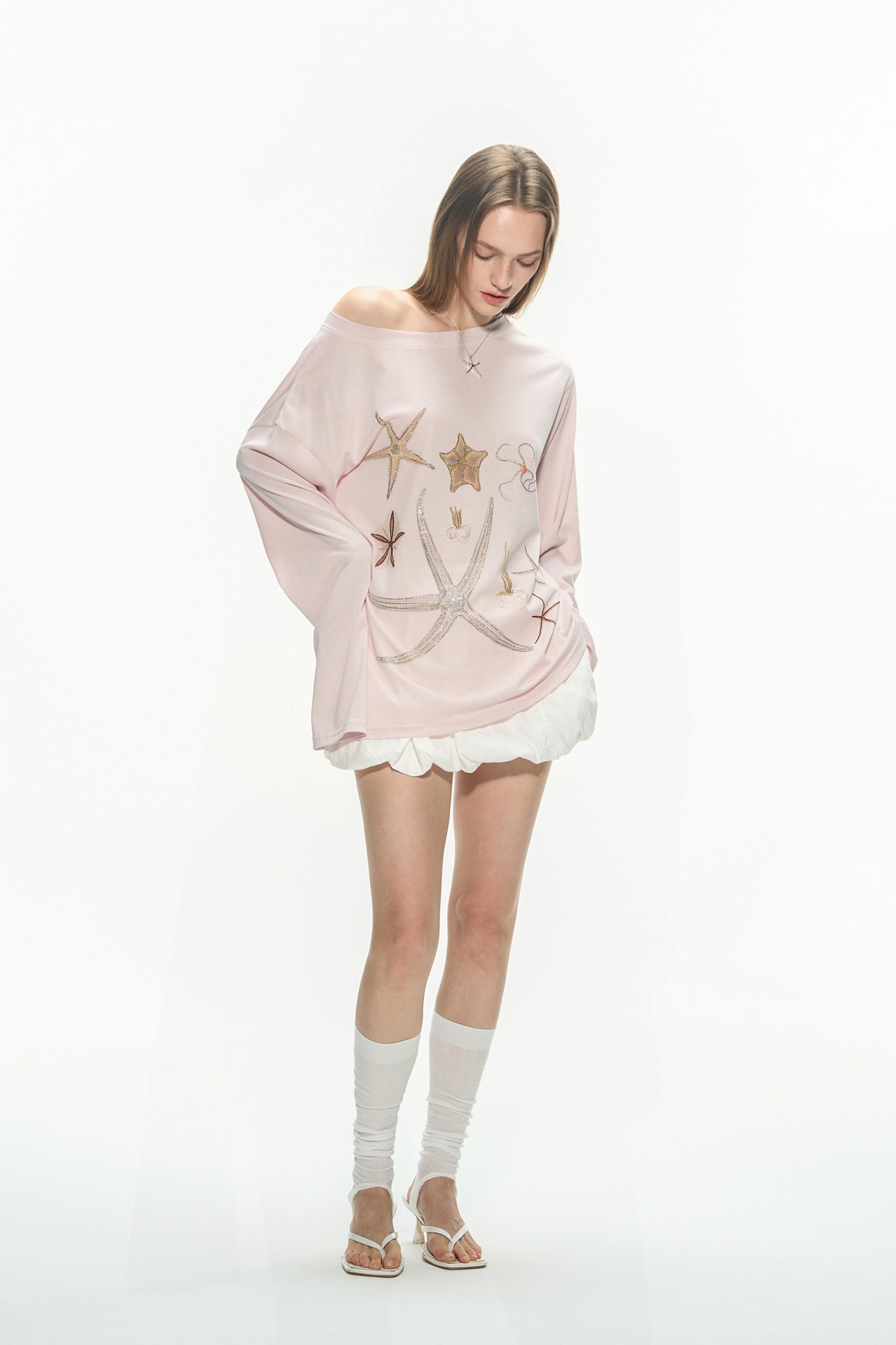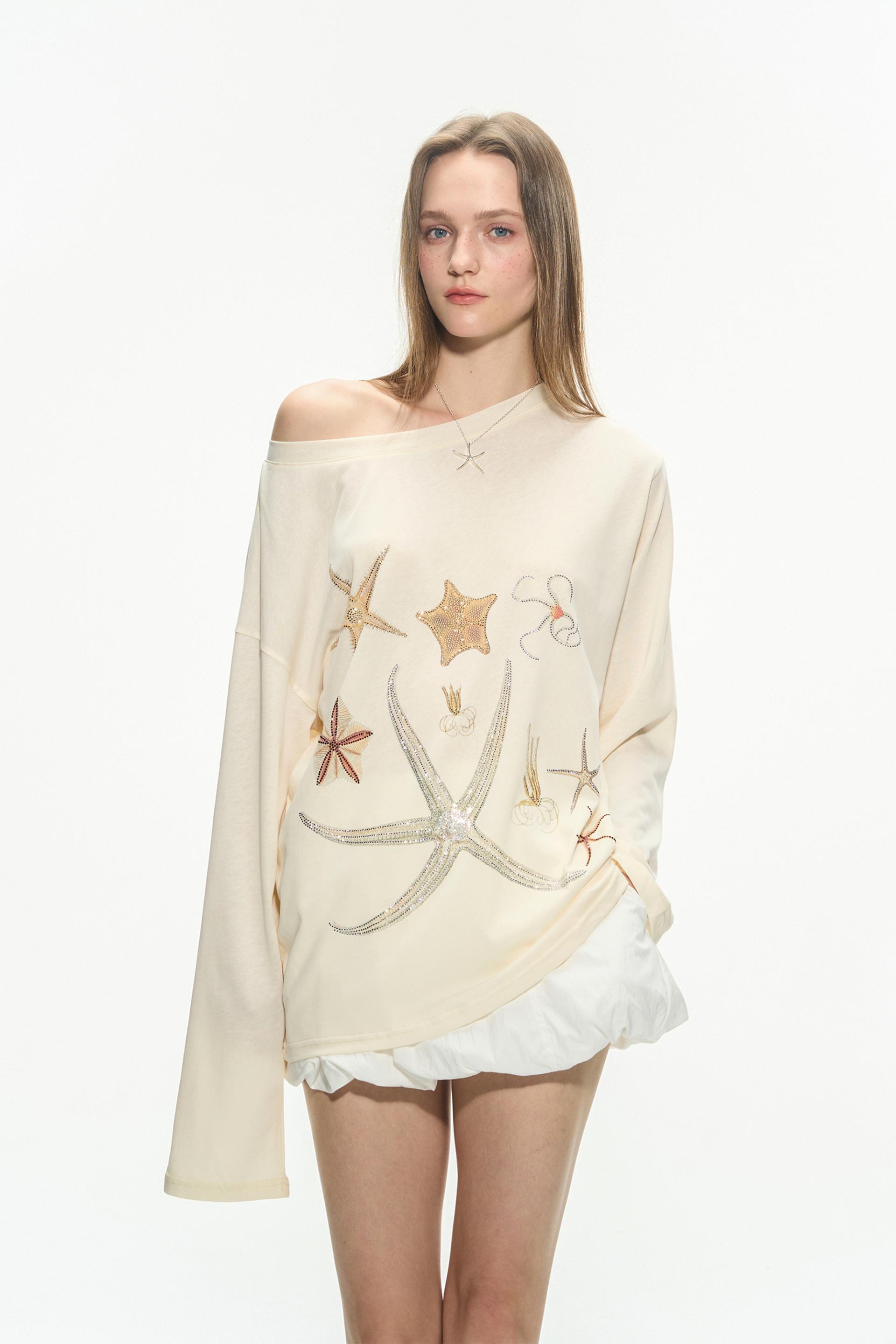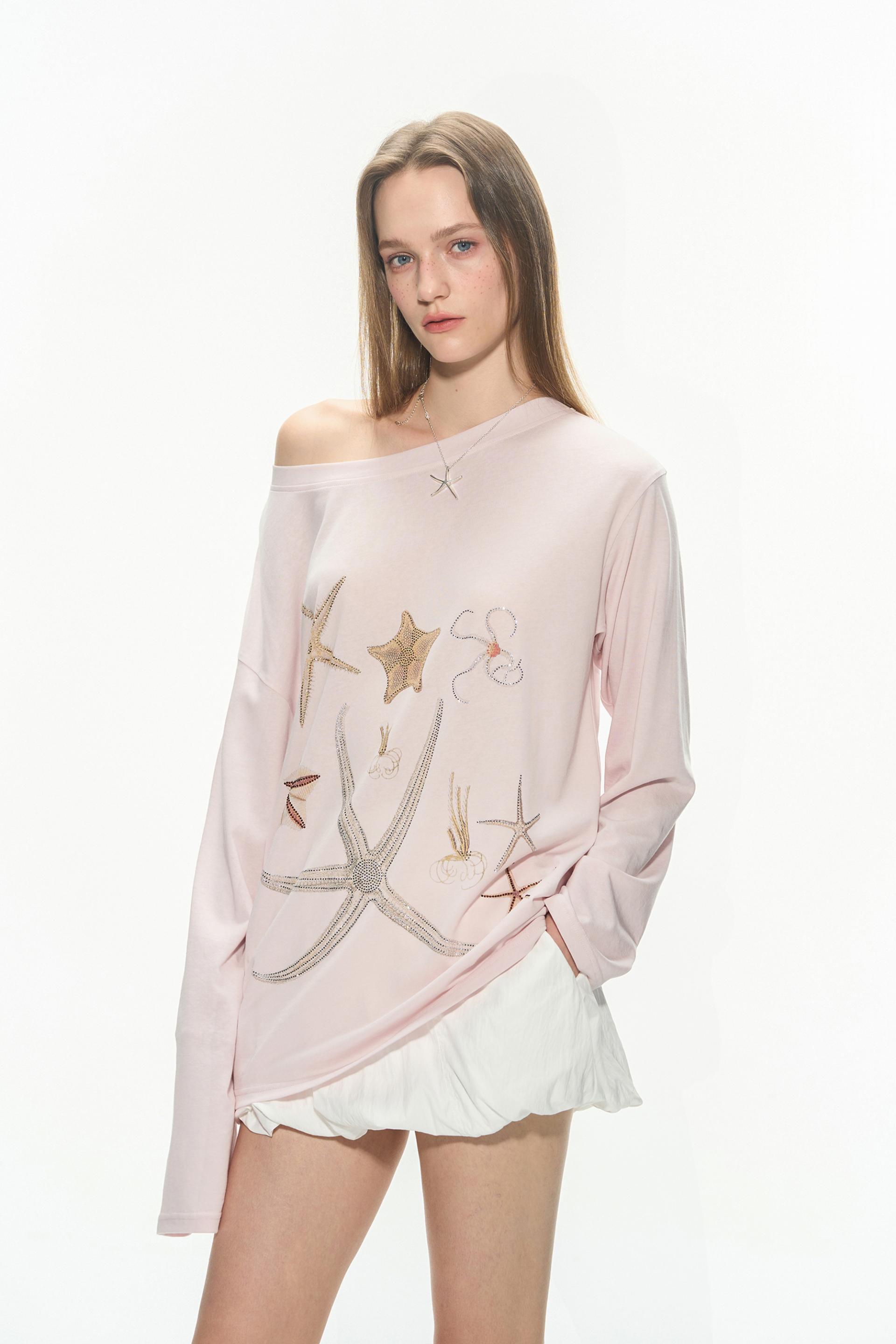 바다 생물을 모티브로 한 스톤 프린트가 돋보이는 루즈핏 롱슬리브 티셔츠로 부드러운 코튼 혼방 원단으로 제작되어 피부에 자극 없이 편안하며, 자연스럽게 떨어지는 오프숄더 실루엣이 여리한 분위기를 연출합니다.