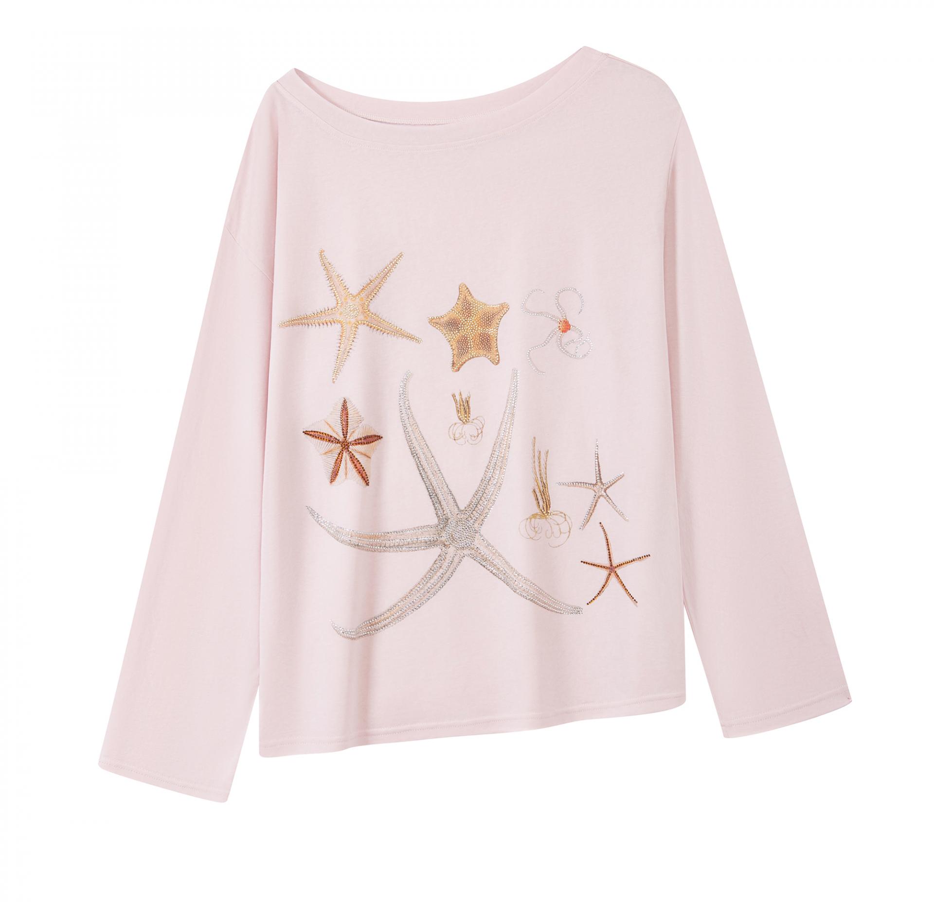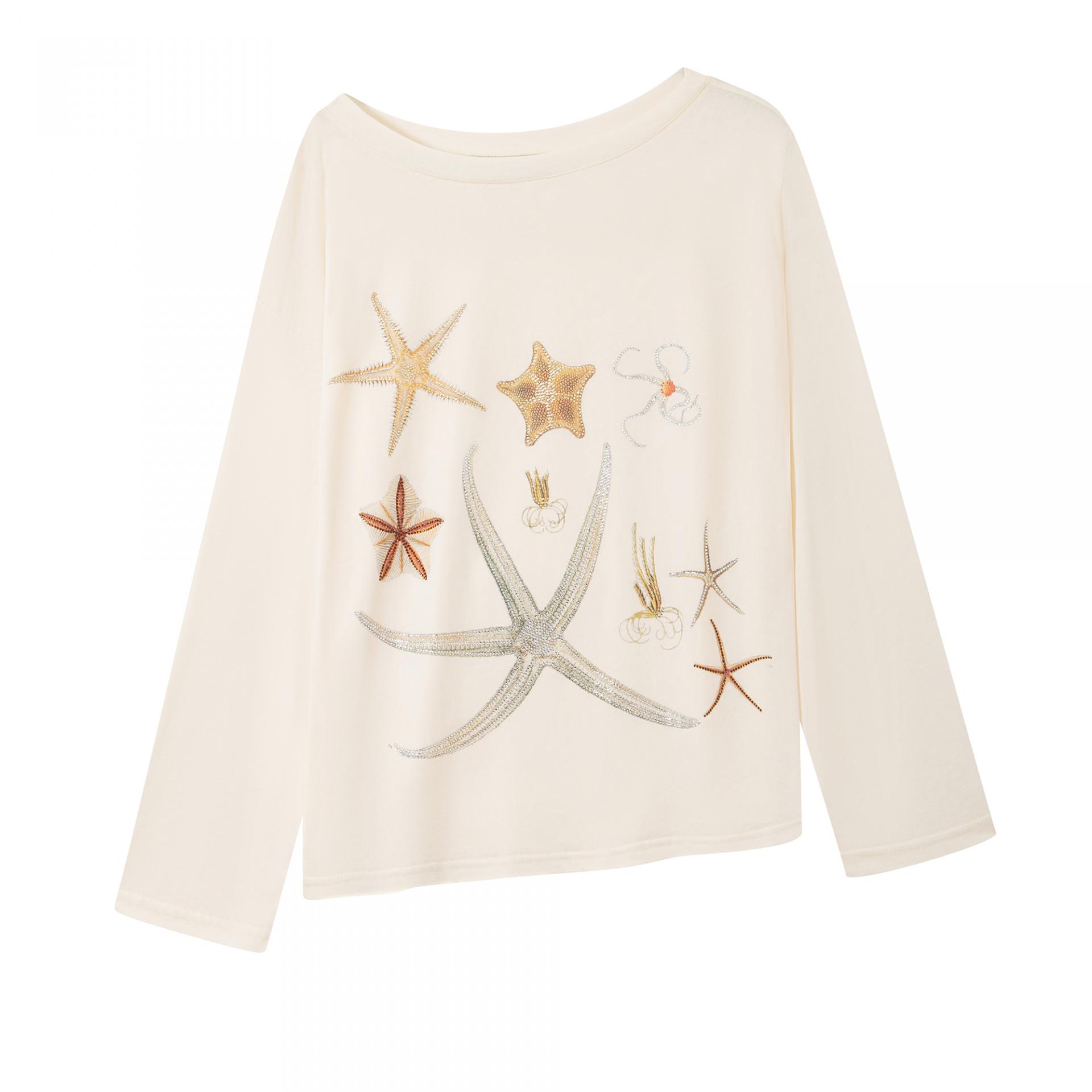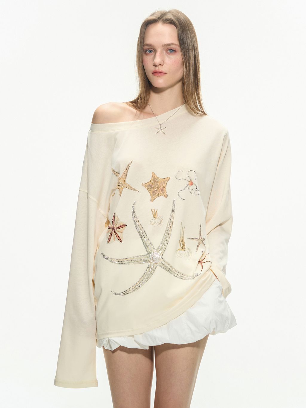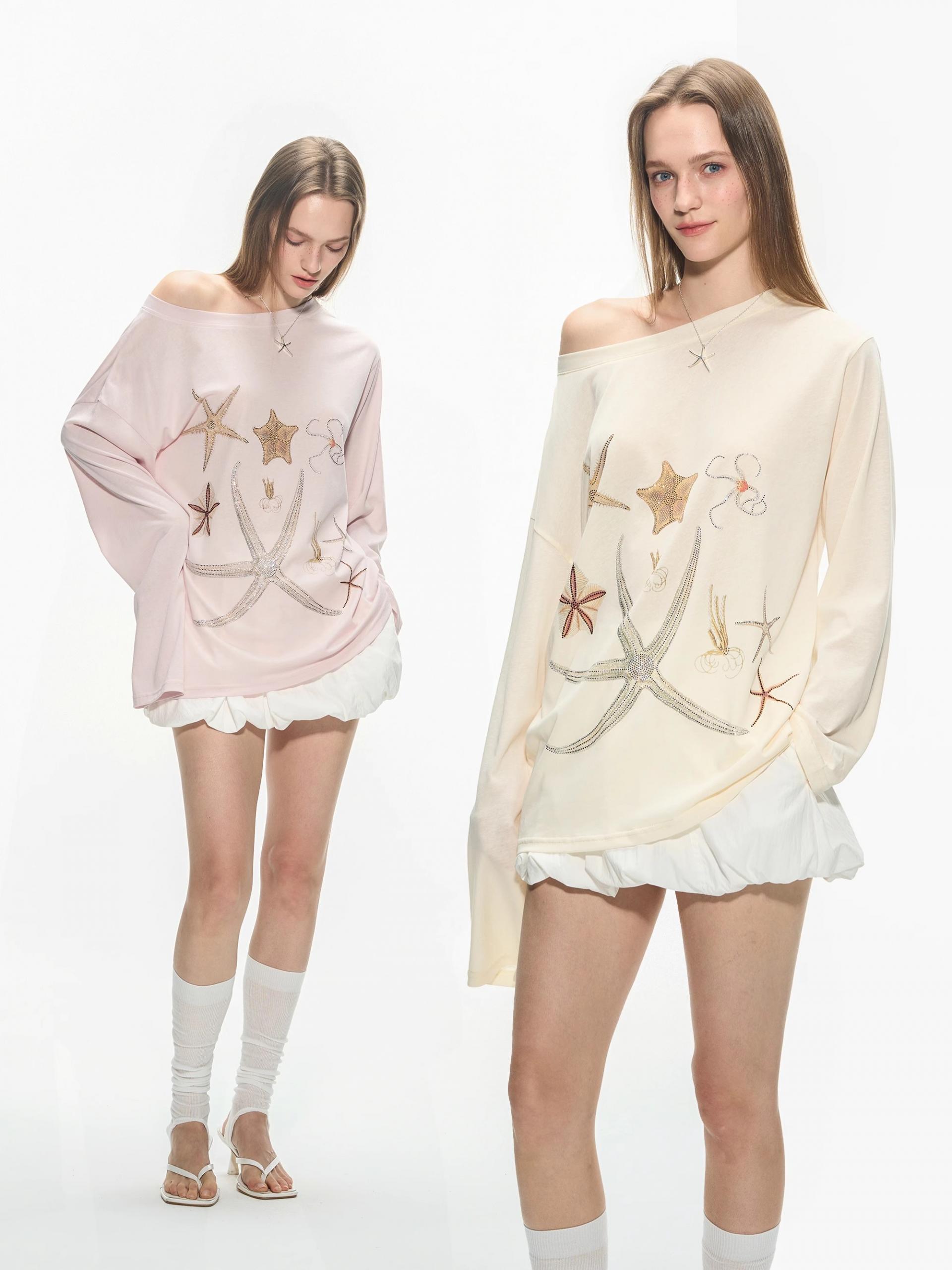 바다 생물을 모티브로 한 스톤 프린트가 돋보이는 루즈핏 롱슬리브 티셔츠로 부드러운 코튼 혼방 원단으로 제작되어 피부에 자극 없이 편안하며, 자연스럽게 떨어지는 오프숄더 실루엣이 여리한 분위기를 연출합니다.