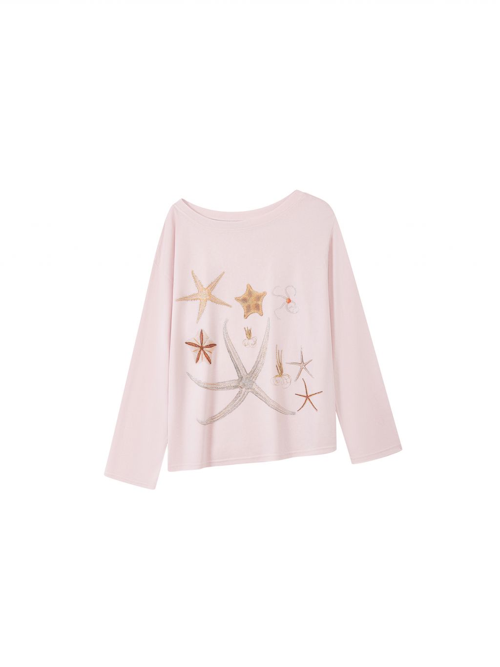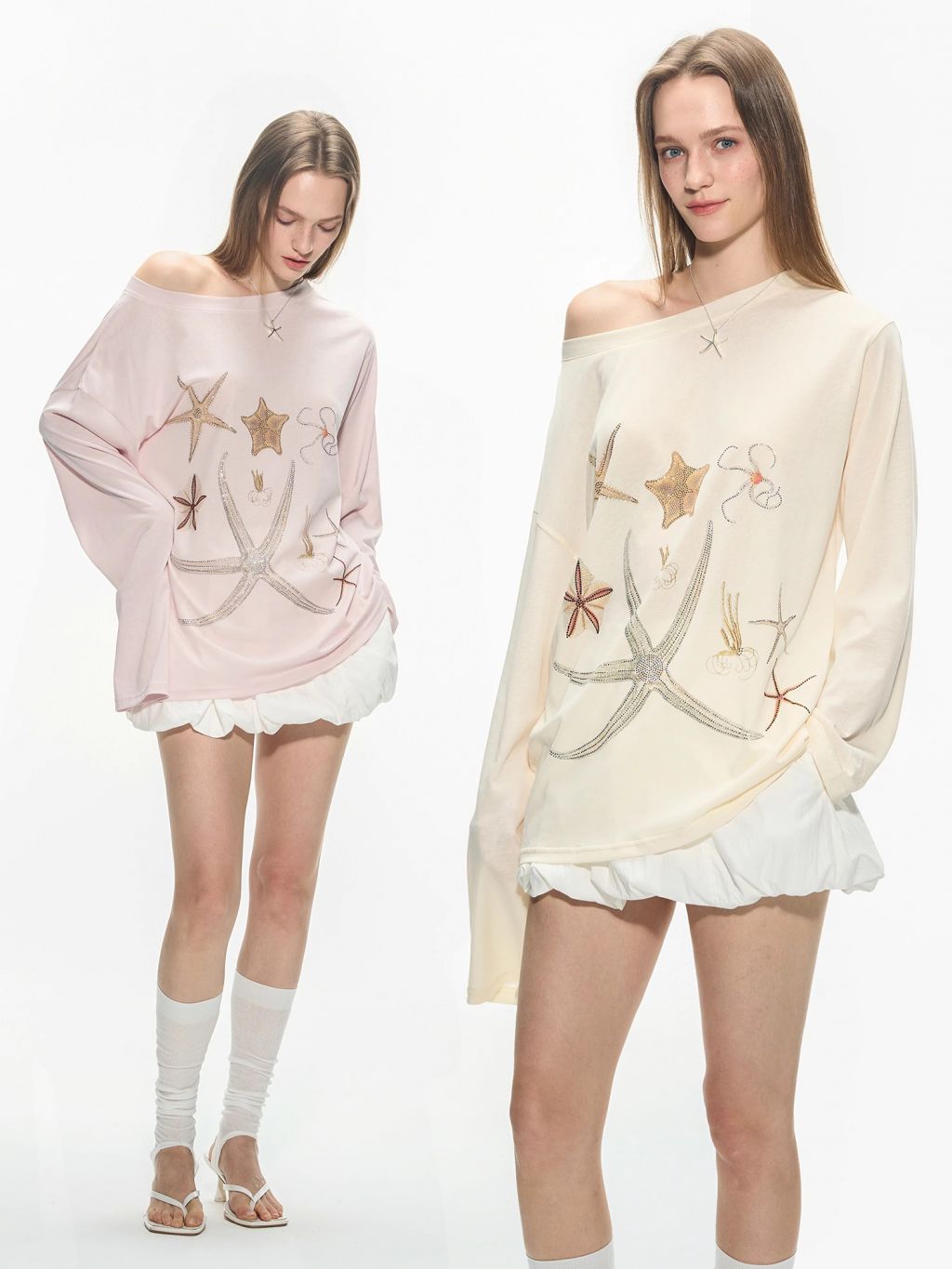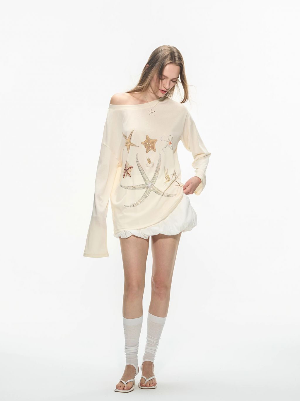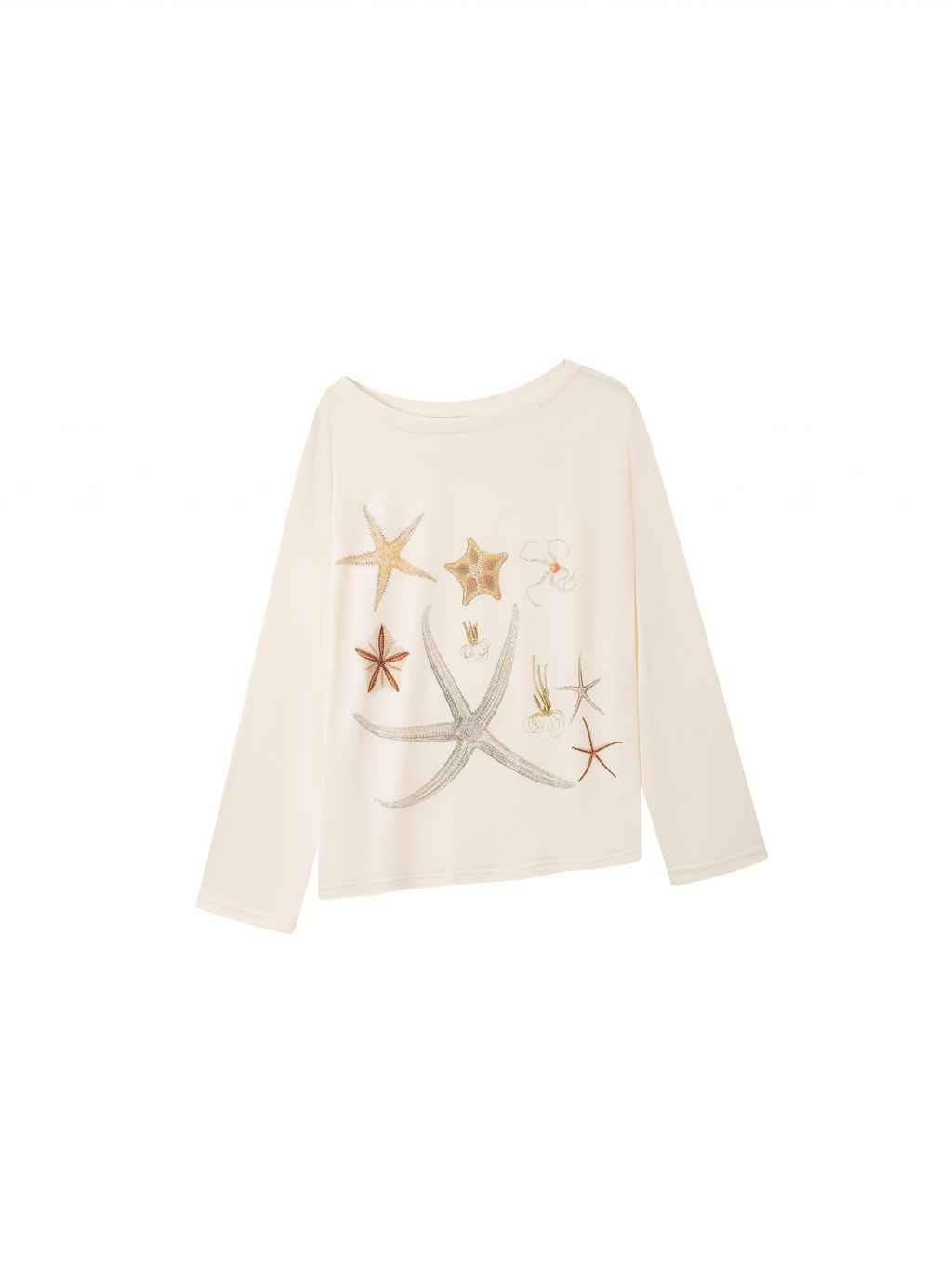 바다 생물을 모티브로 한 스톤 프린트가 돋보이는 루즈핏 롱슬리브 티셔츠로 부드러운 코튼 혼방 원단으로 제작되어 피부에 자극 없이 편안하며, 자연스럽게 떨어지는 오프숄더 실루엣이 여리한 분위기를 연출합니다.