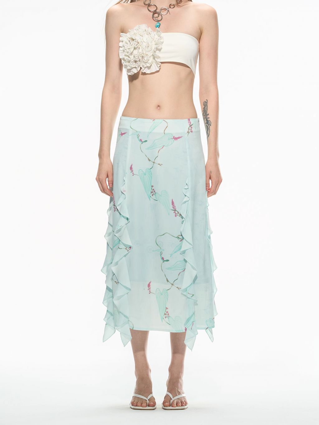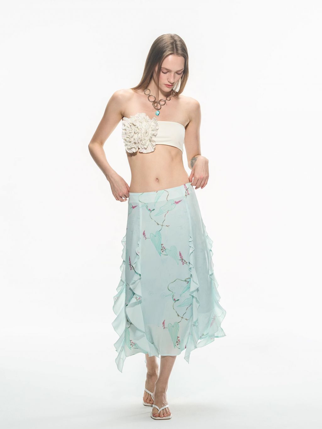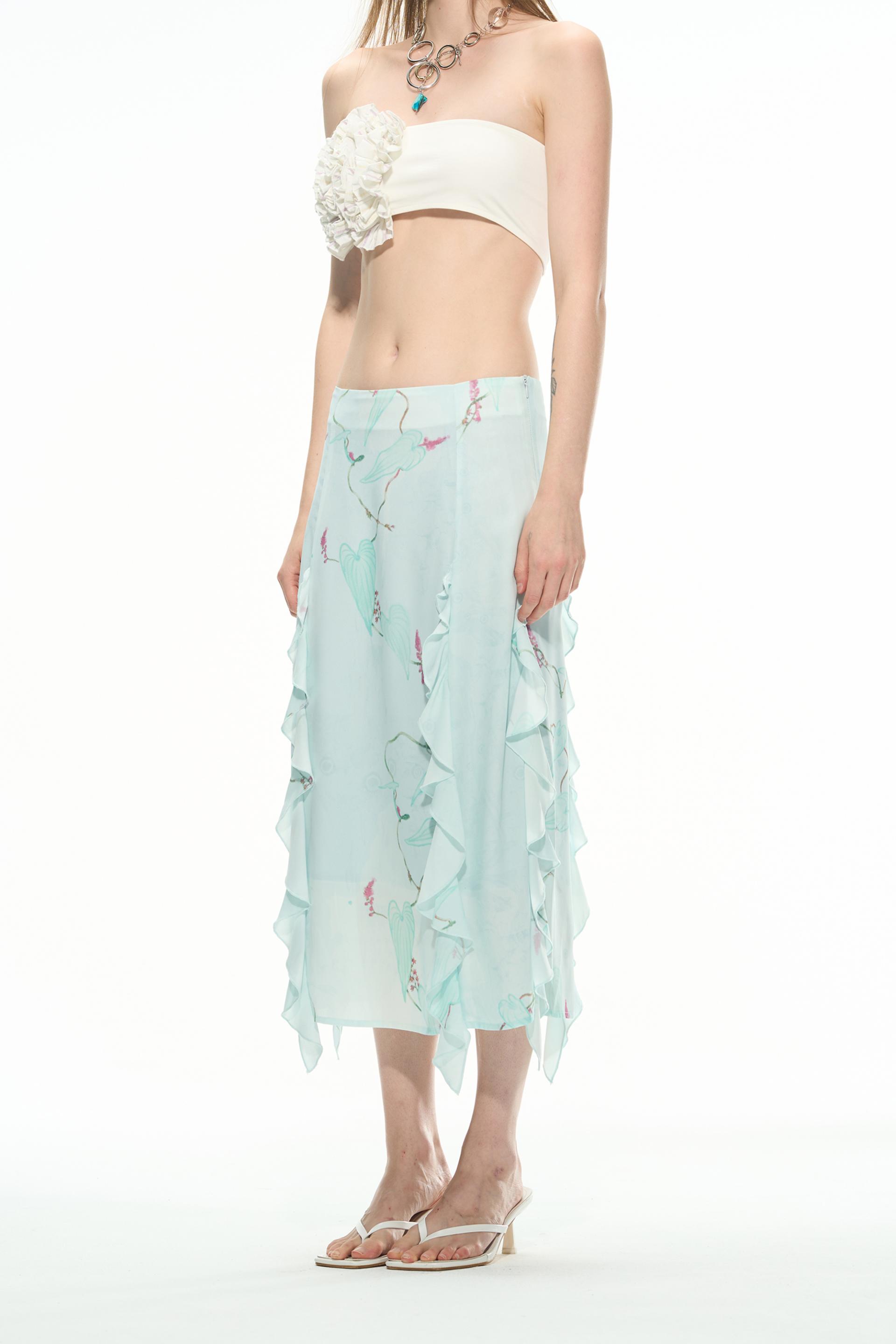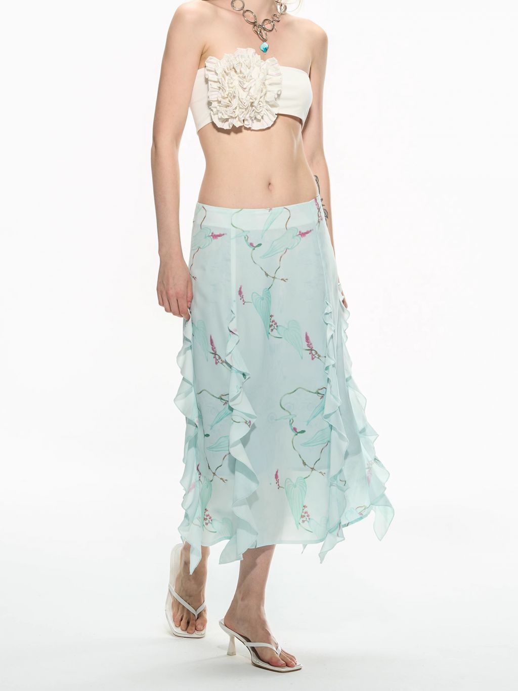 은은한 바다빛 컬러에 흐르듯 얹힌 플라워 프린트, 그리고 양옆을 따라 자연스럽게 흘러내리는 러플 디테일까지 여름 바람처럼 가볍고 시원하게 착용할 수 있는 시폰 소재의 플레어 롱스커트입니다. 움직일 때마다 살랑이는 러플과 은근한 비침이 여리한 실루엣을 연출해주며, 뒷밴딩 처리로 편안한 착용감까지 더했습니다.