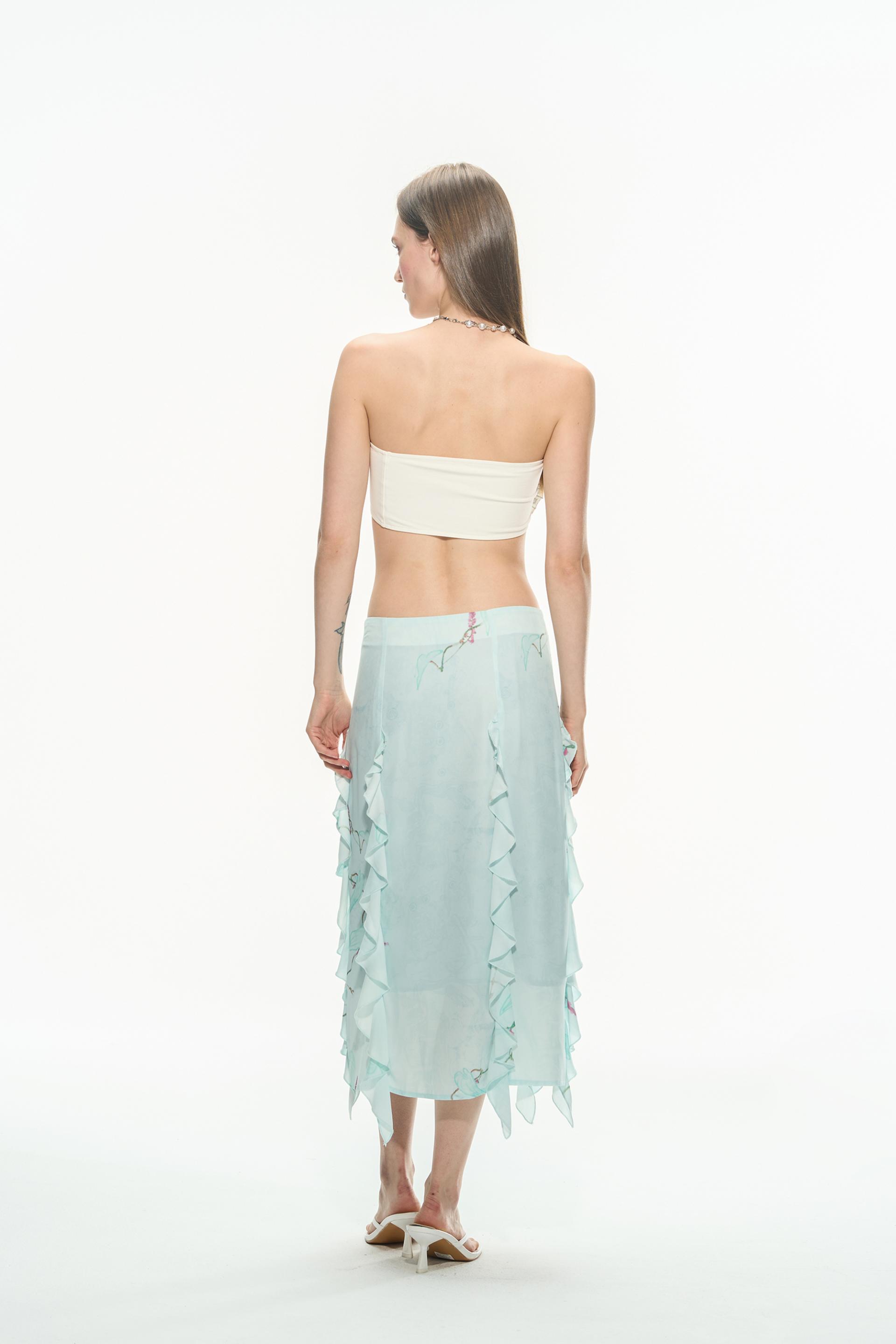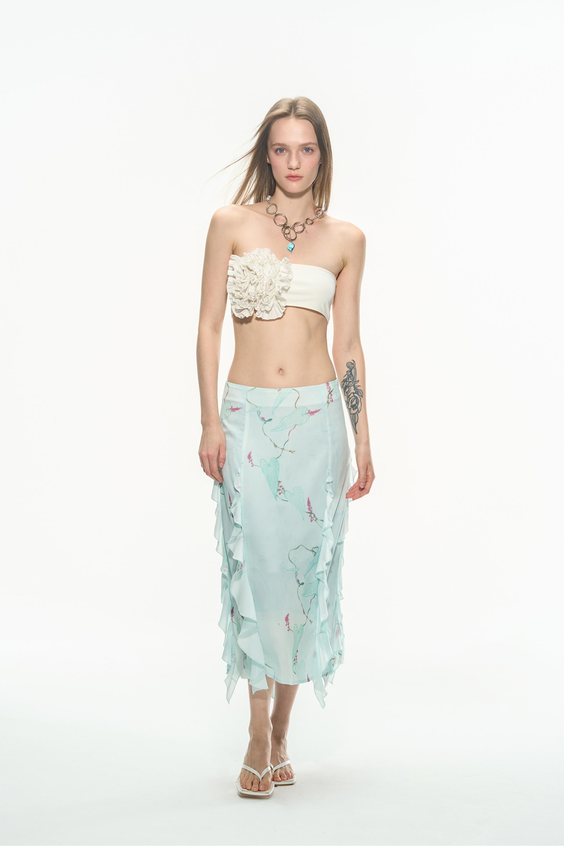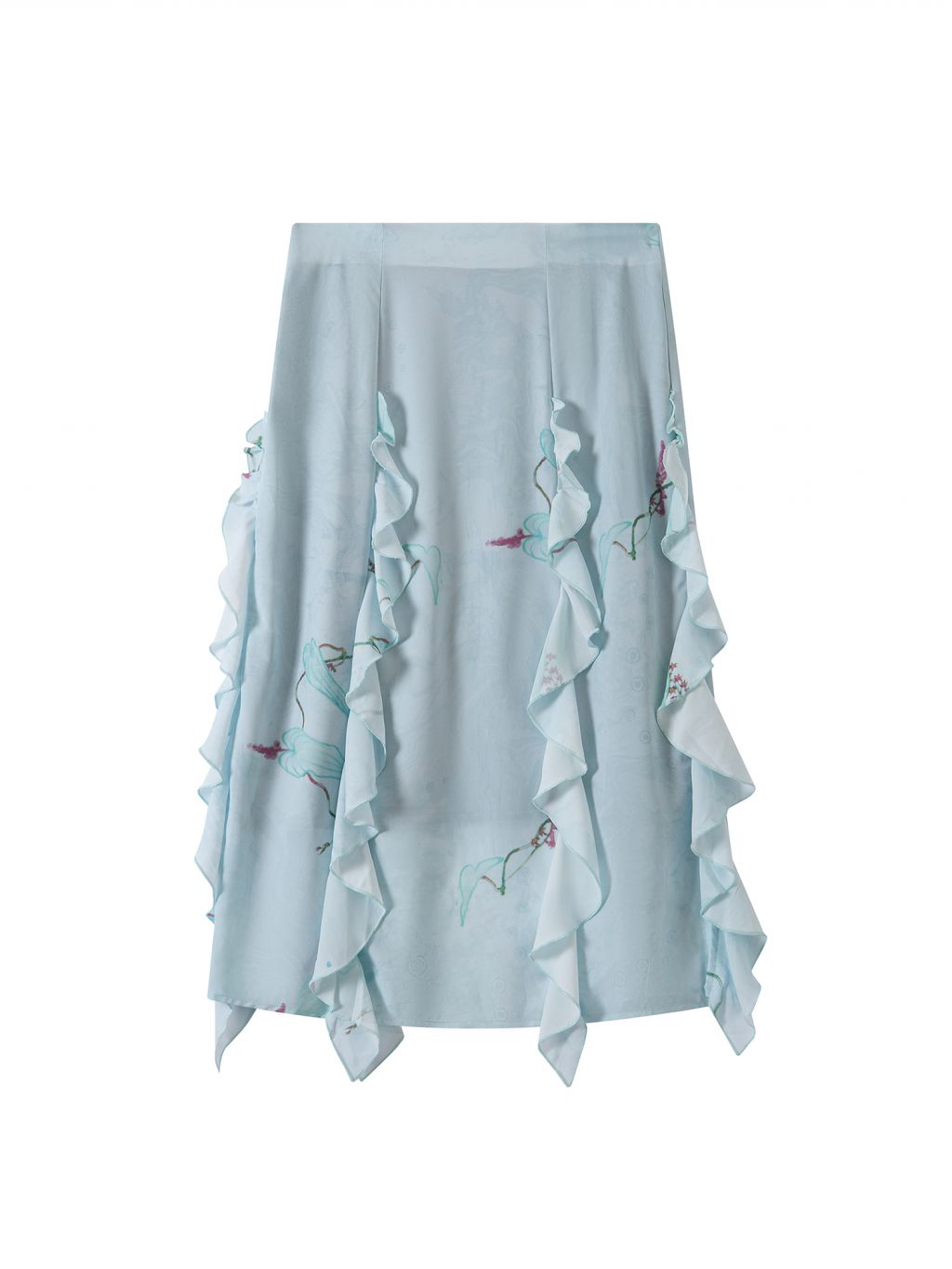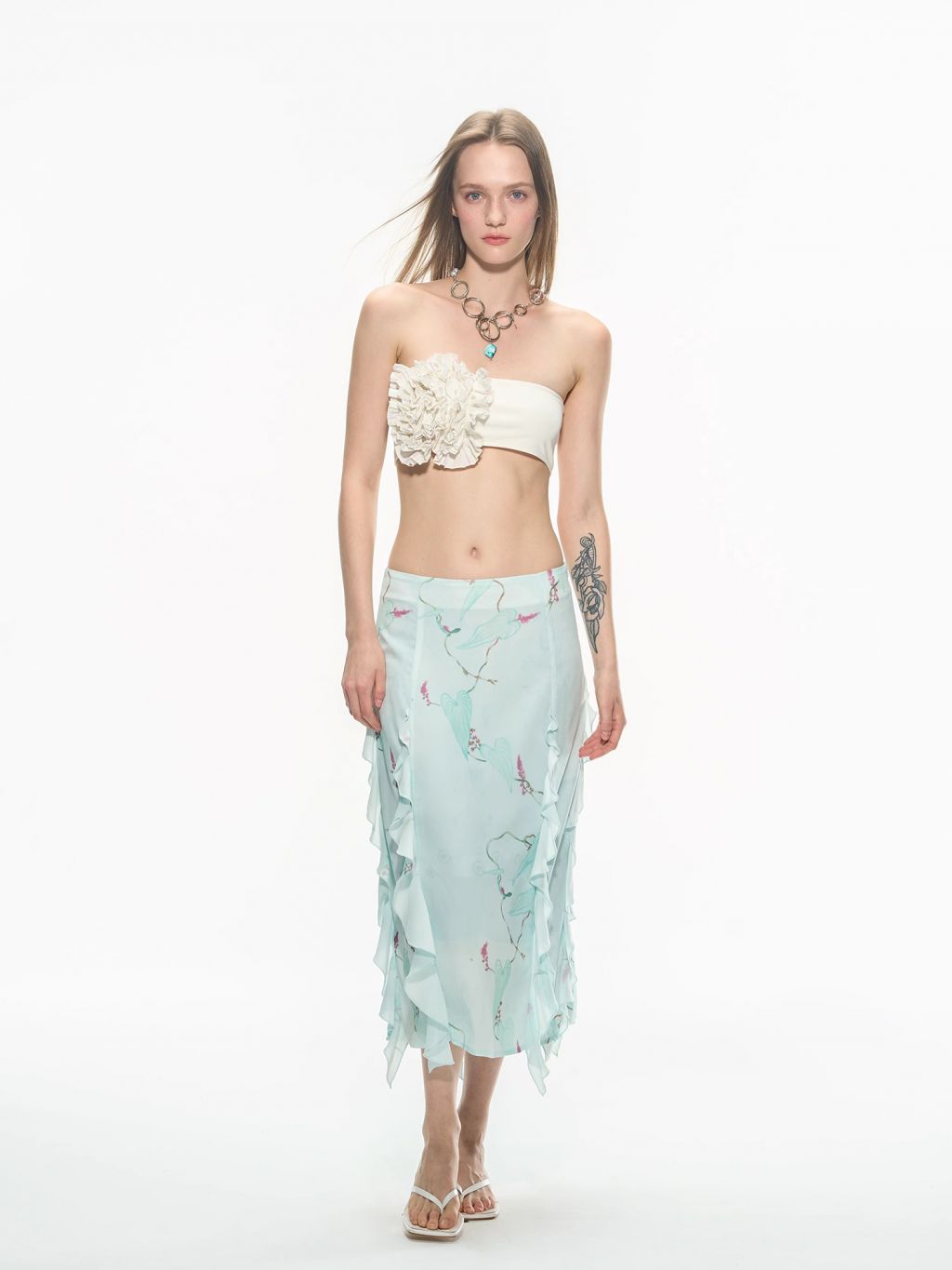은은한 바다빛 컬러에 흐르듯 얹힌 플라워 프린트, 그리고 양옆을 따라 자연스럽게 흘러내리는 러플 디테일까지 여름 바람처럼 가볍고 시원하게 착용할 수 있는 시폰 소재의 플레어 롱스커트입니다. 움직일 때마다 살랑이는 러플과 은근한 비침이 여리한 실루엣을 연출해주며, 뒷밴딩 처리로 편안한 착용감까지 더했습니다.