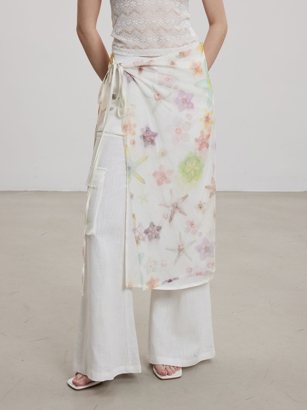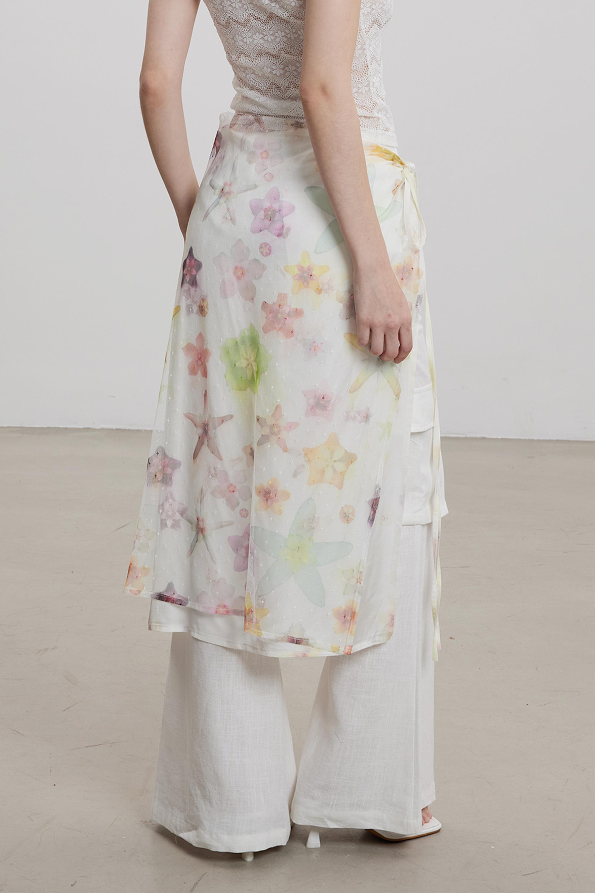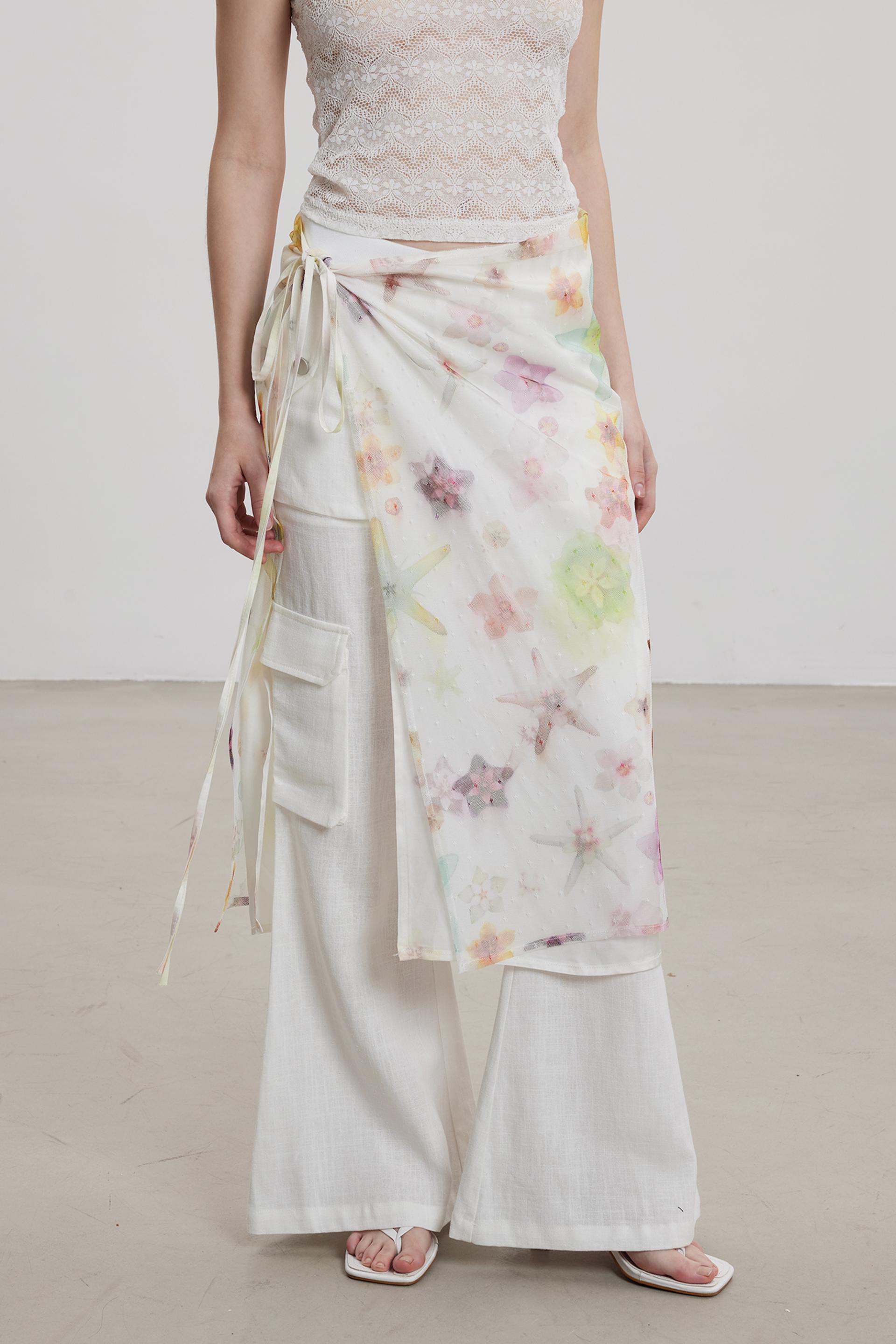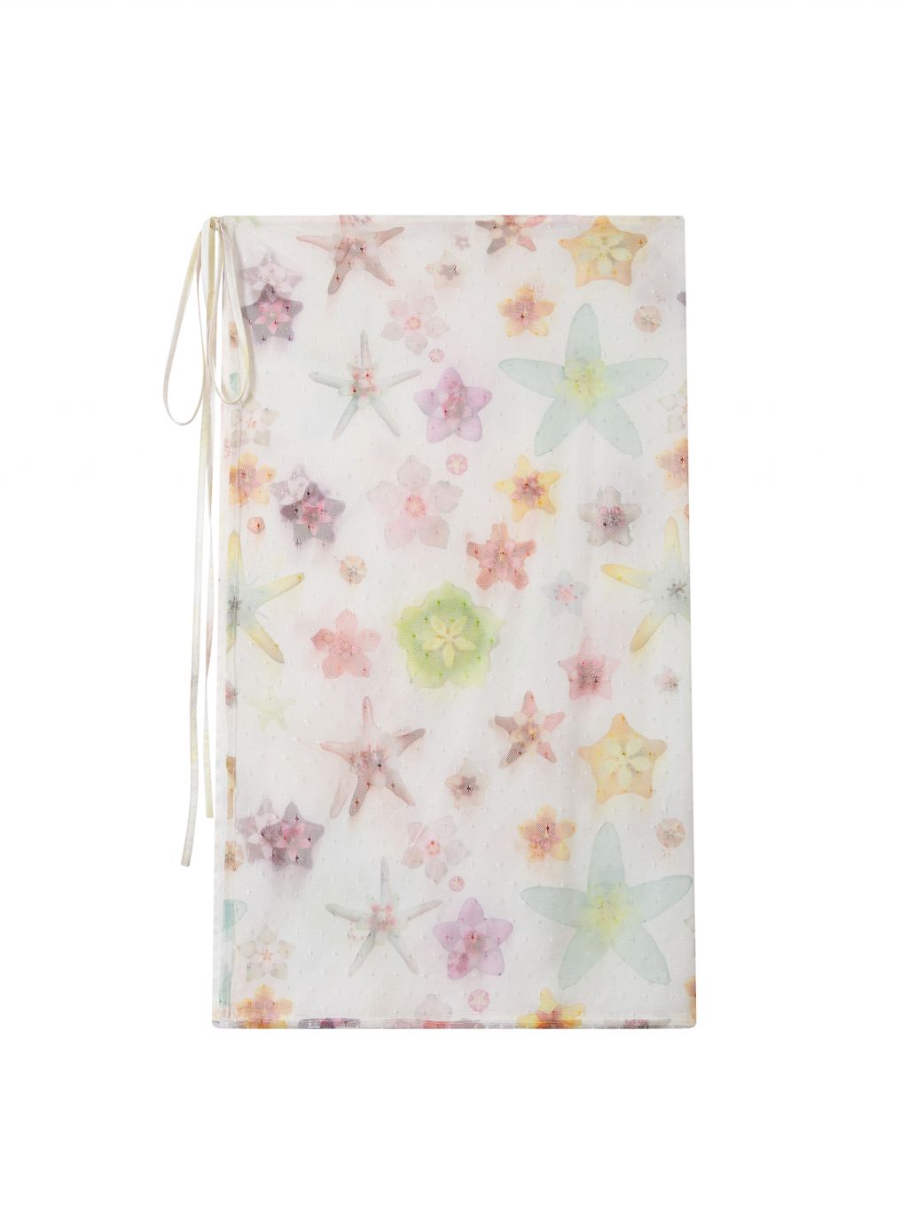 은은한 시스루에 수채화처럼 번지는 별꽃 패턴이 매혹적인 시어 사롱으로 단독 비치웨어 커버업으로, 또는 팬츠 위에 레이어드해도 스타일리시하게 활용할 수 있으며 옆선 스트랩으로 허리에 자유롭게 묶는 랩 스타일로 연출 가능합니다.