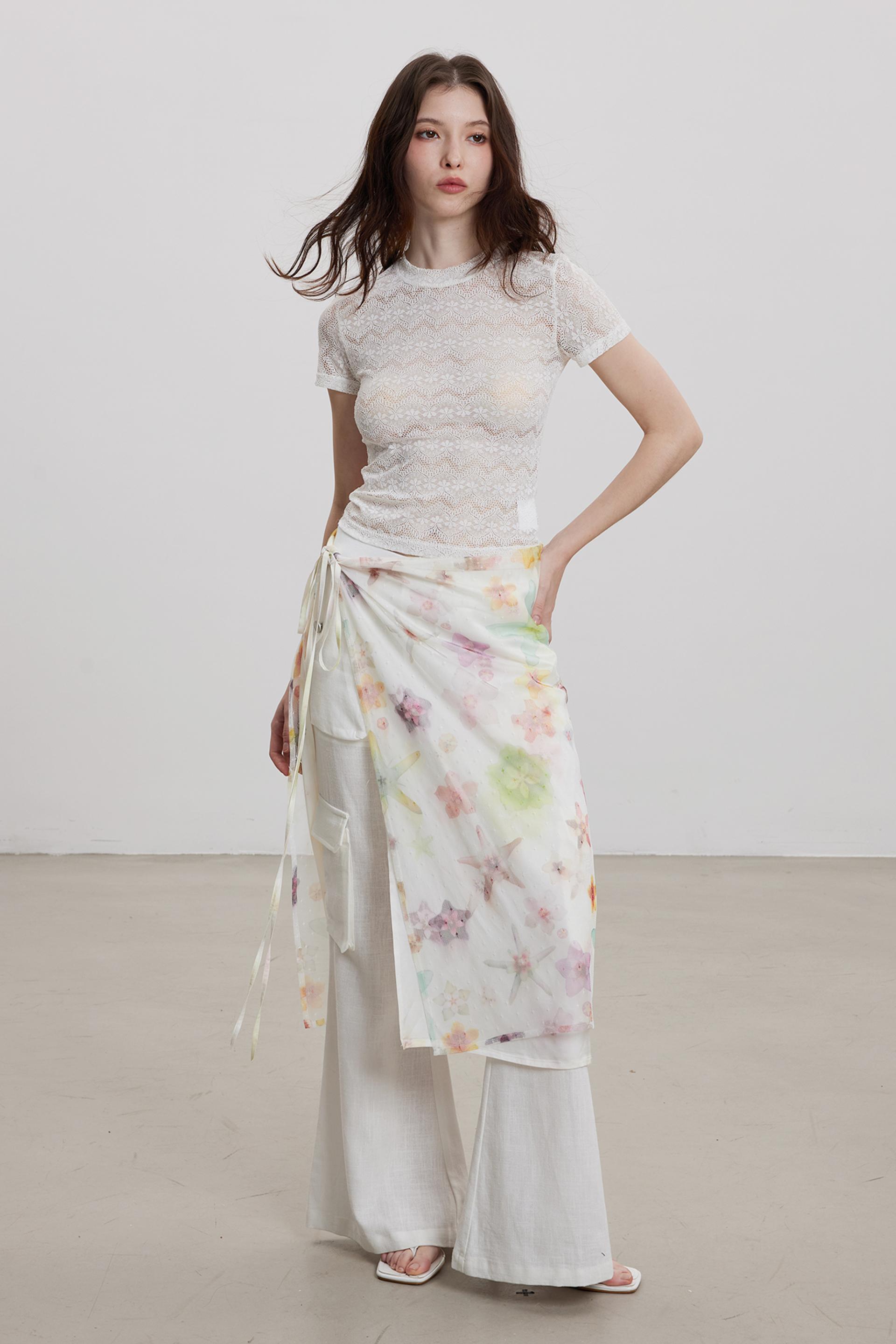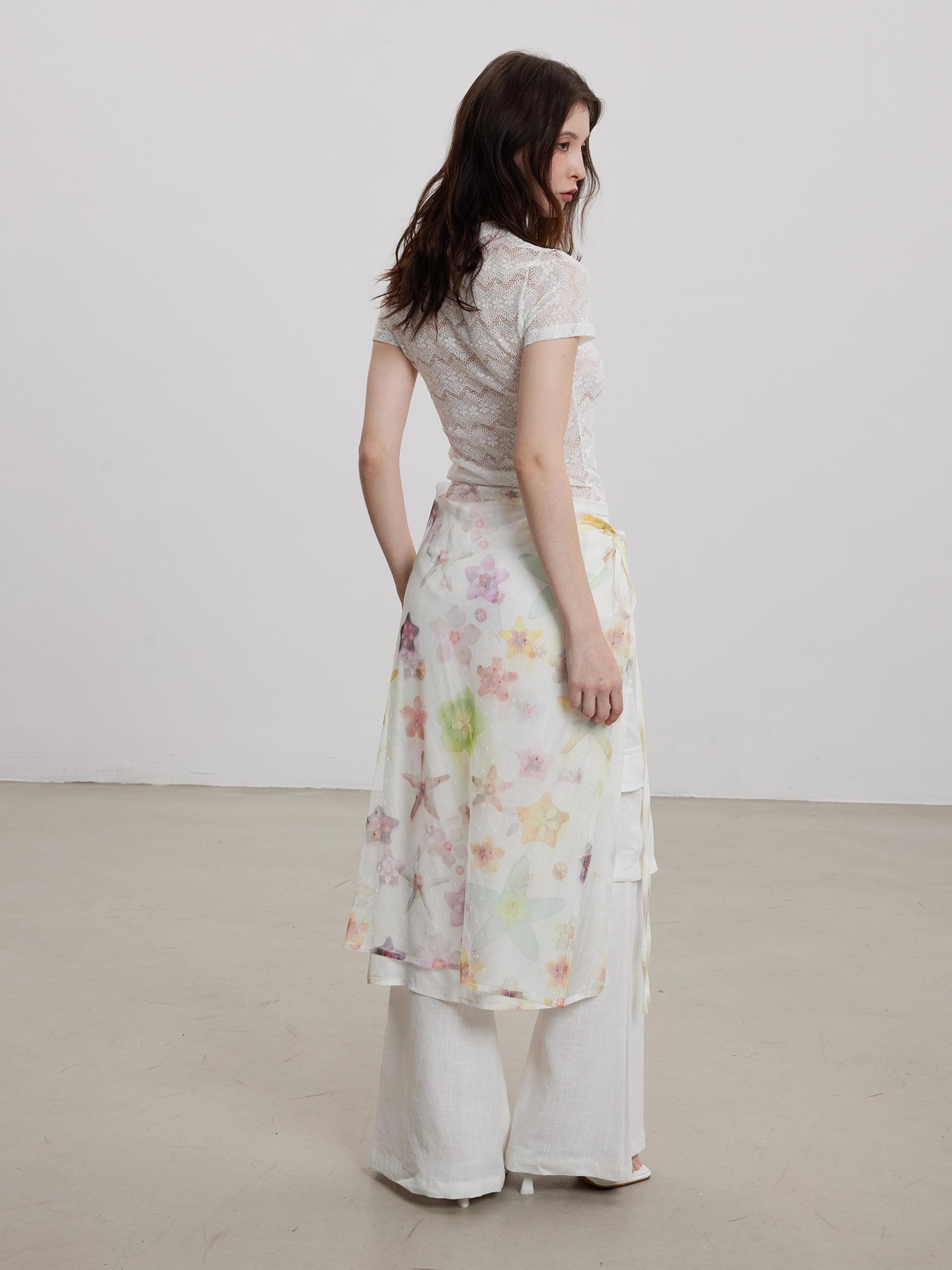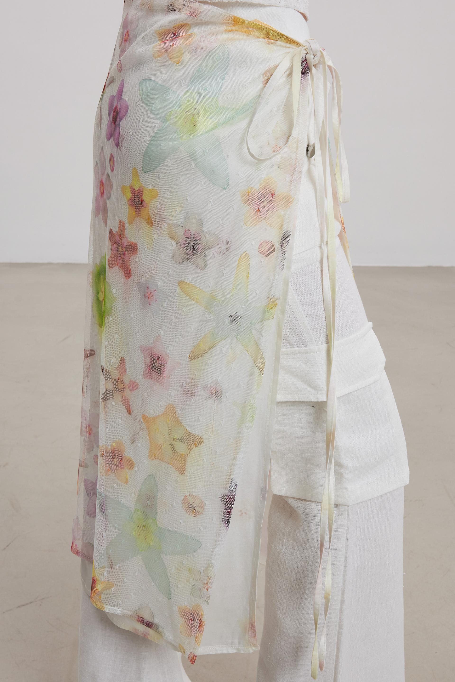 은은한 시스루에 수채화처럼 번지는 별꽃 패턴이 매혹적인 시어 사롱으로 단독 비치웨어 커버업으로, 또는 팬츠 위에 레이어드해도 스타일리시하게 활용할 수 있으며 옆선 스트랩으로 허리에 자유롭게 묶는 랩 스타일로 연출 가능합니다.