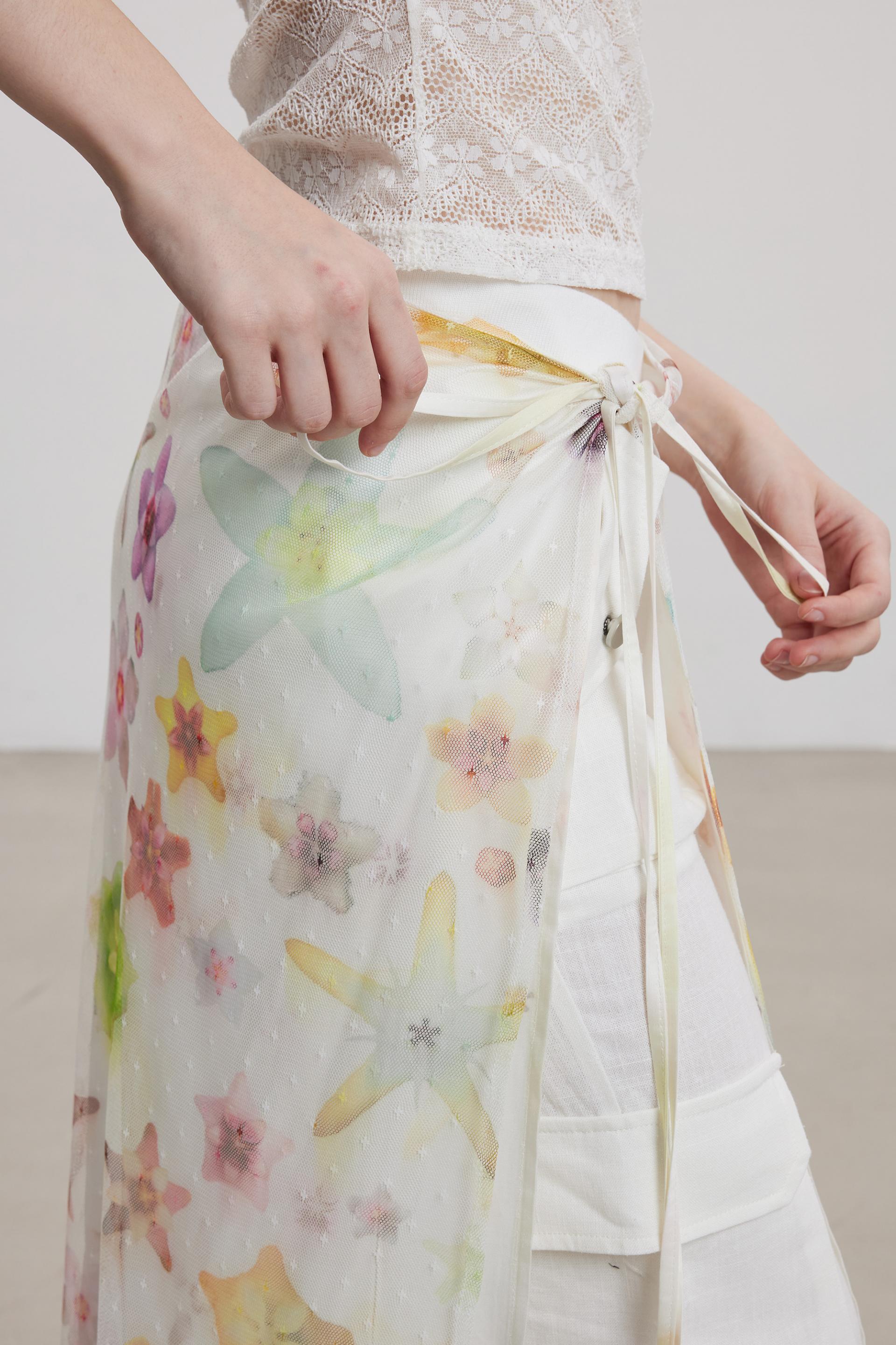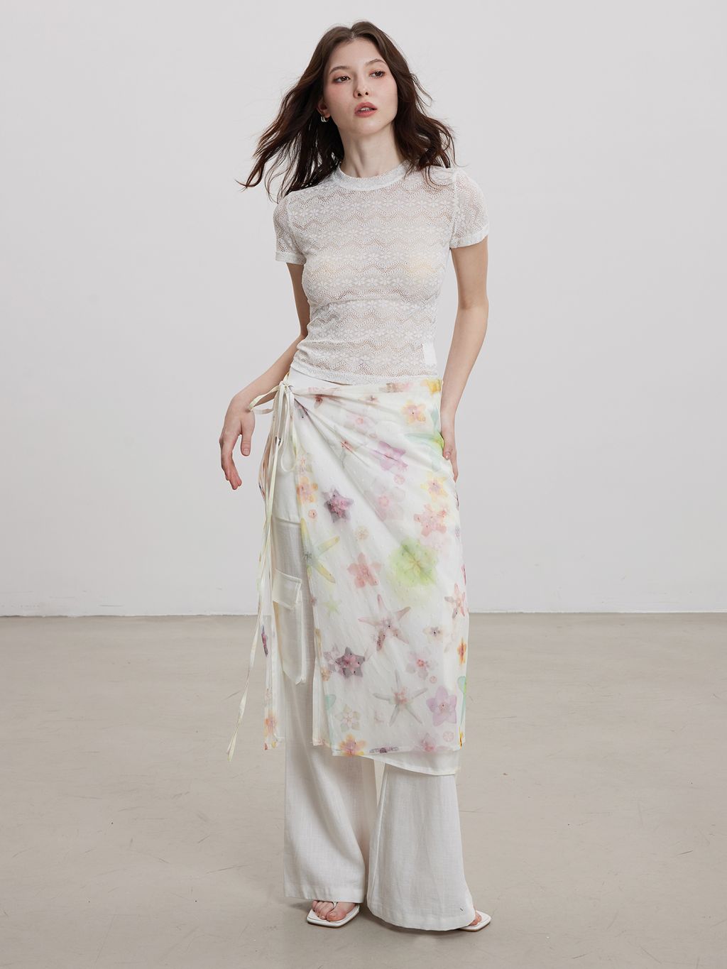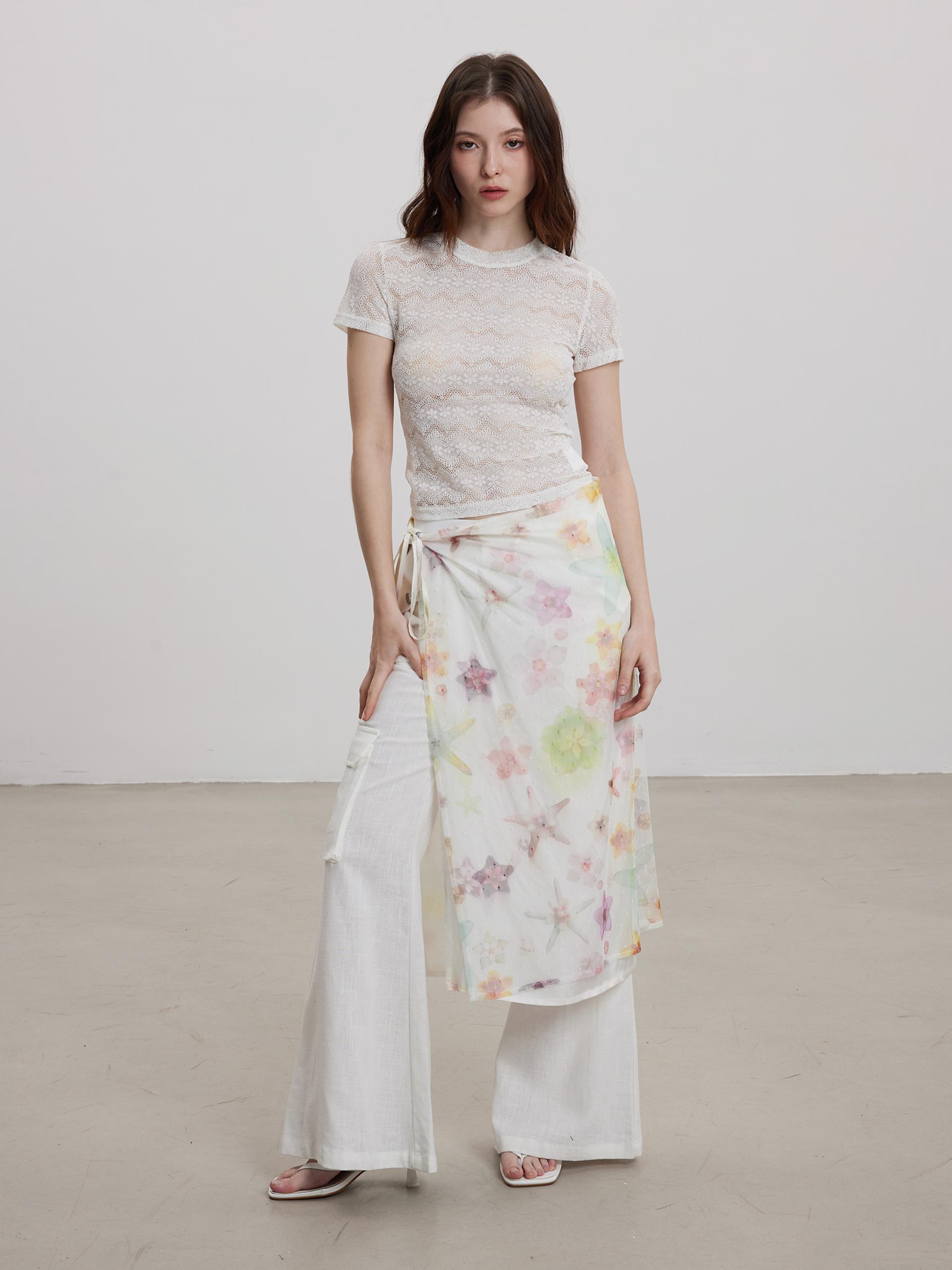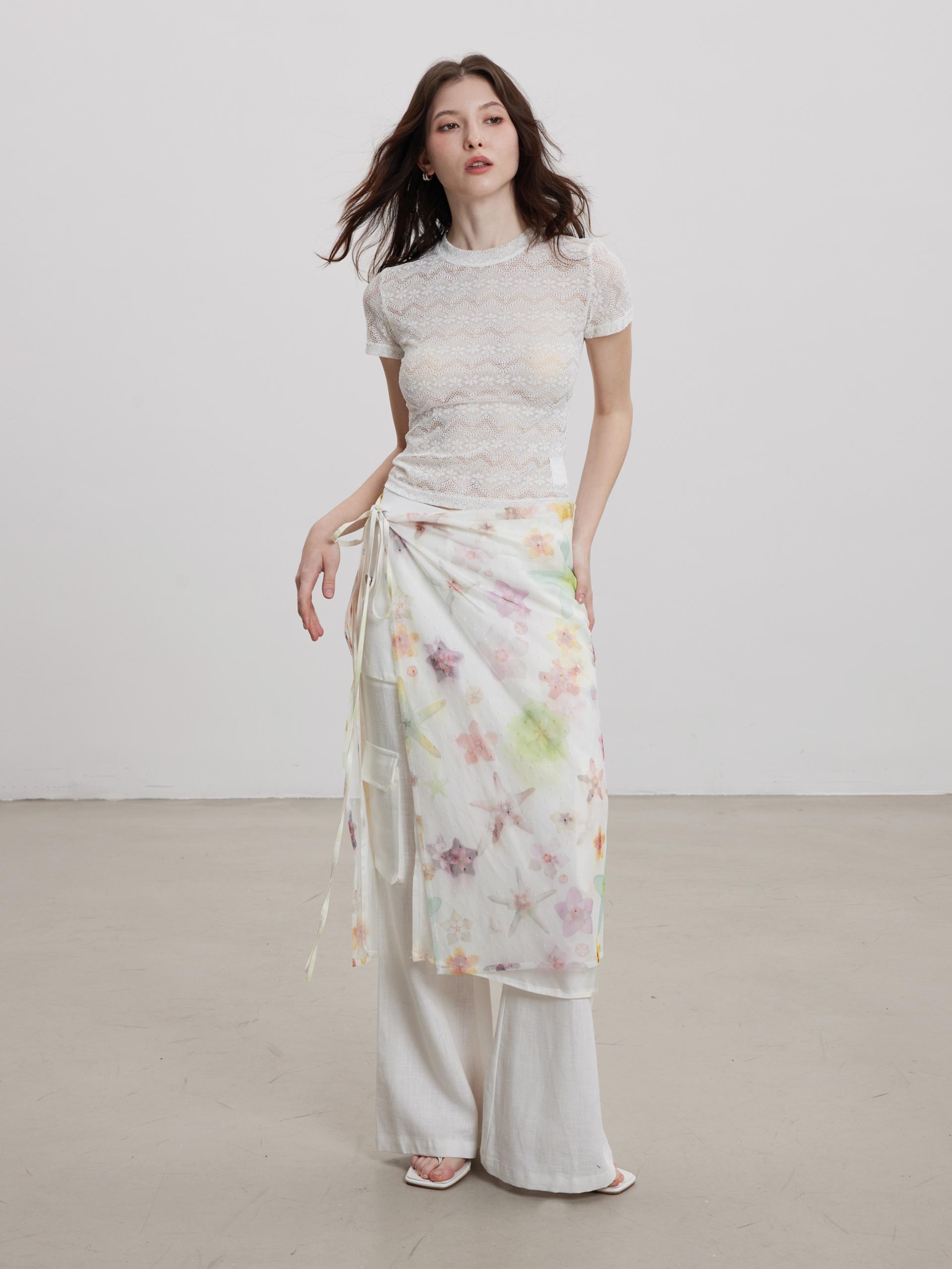 은은한 시스루에 수채화처럼 번지는 별꽃 패턴이 매혹적인 시어 사롱으로 단독 비치웨어 커버업으로, 또는 팬츠 위에 레이어드해도 스타일리시하게 활용할 수 있으며 옆선 스트랩으로 허리에 자유롭게 묶는 랩 스타일로 연출 가능합니다.