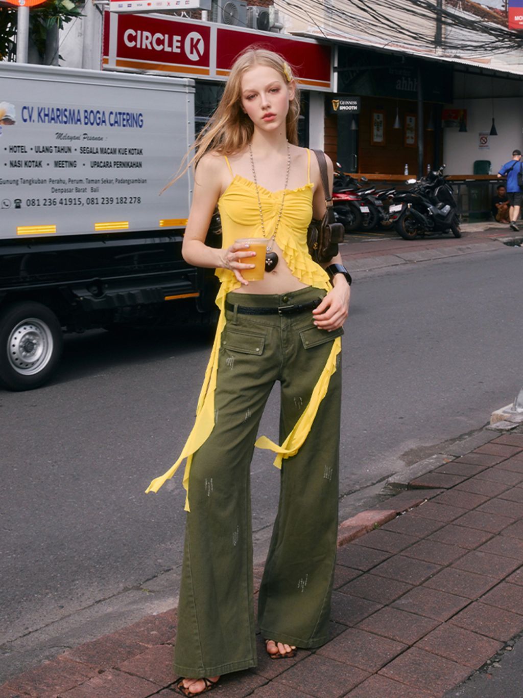 - 앞중심 셔링과 긴 러플 스트랩으로 바디라인을 강조하는 유니크한 실루엣