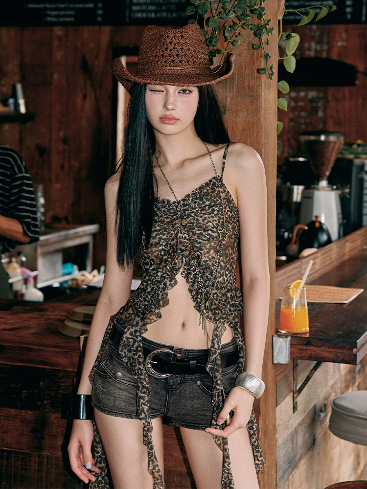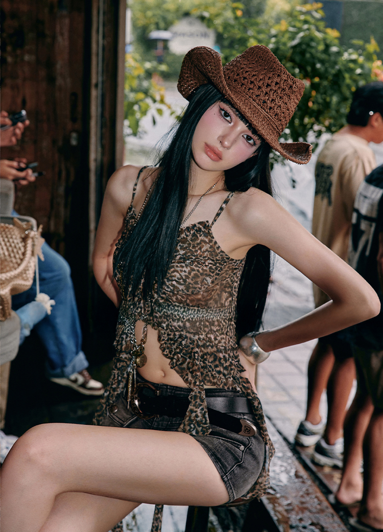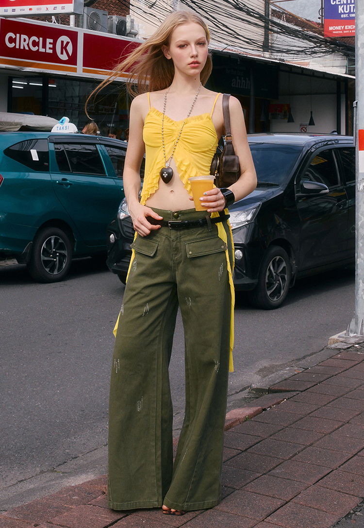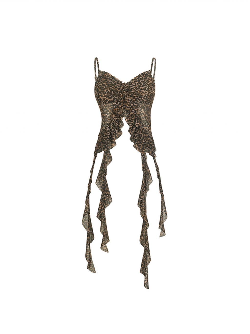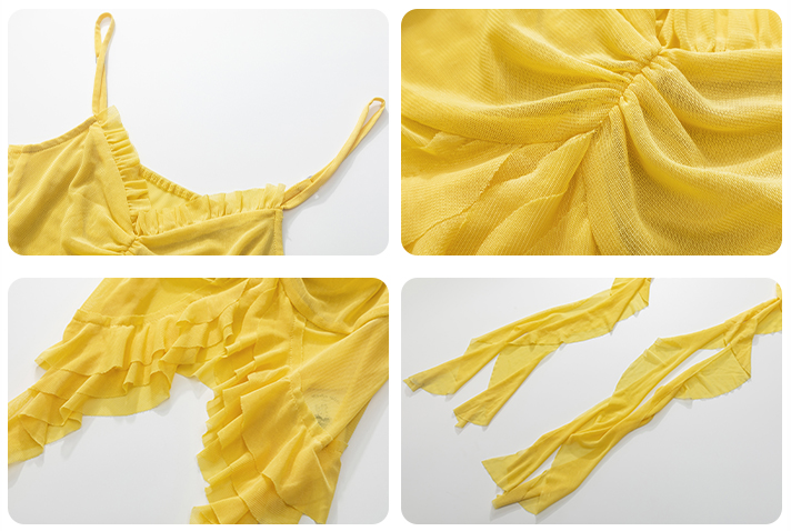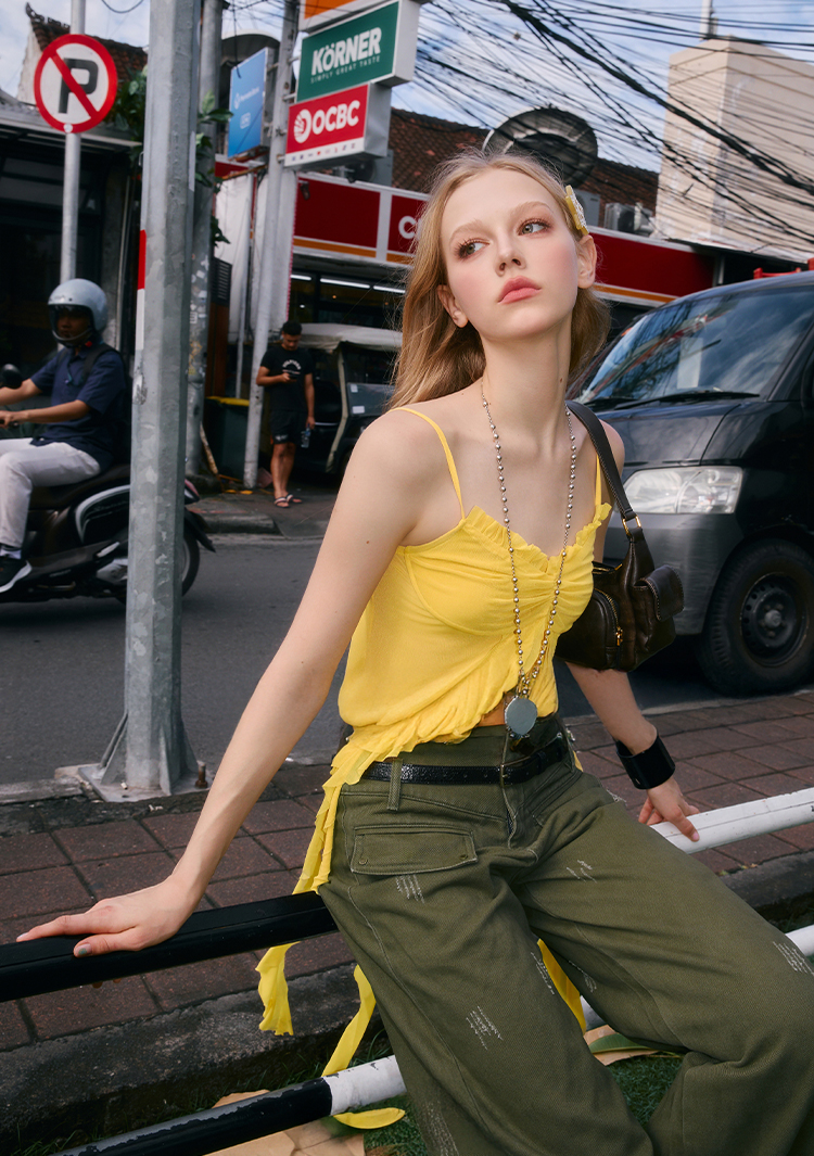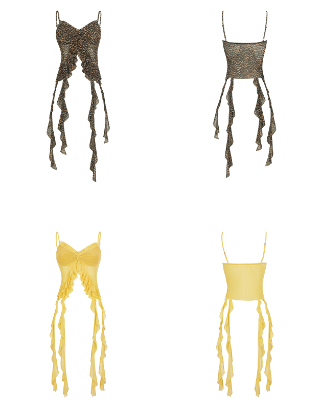 가벼운 메시 소재와 프릴 디테일이 시선을 사로잡는 슬리브리스 탑으로 센터 셔링과 물결처럼 흐르는 스트랩이 바디에 유연하게 흐르며 감각적인 실루엣을 완성합니다.