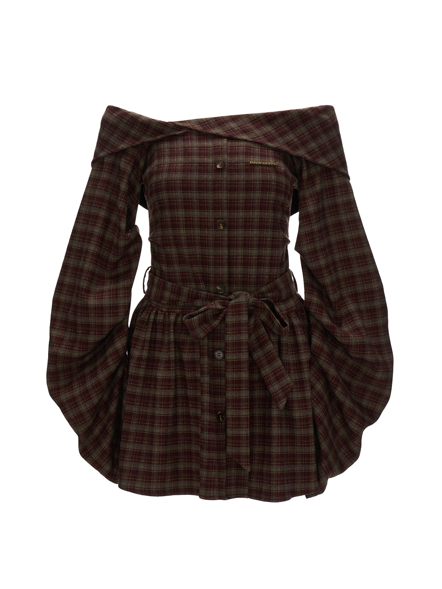 클래식한 체크 패턴에 오프숄더 실루엣을 더해 유니크한 매력을 담은 원피스로 볼륨감 있는 벨 슬리브와 허리 라인을 잡아주는 벨트 디테일이 스타일리시한 포인트를 더합니다.