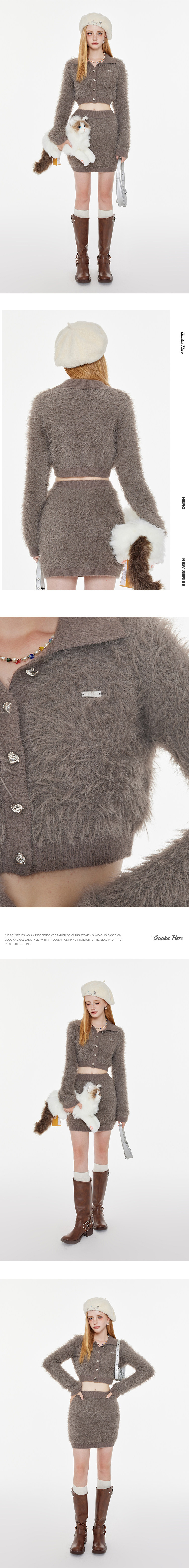 헤어리한 텍스처와 크롭 가디건 실루엣이 만나, 단독으로도 셋업으로도 확실한 존재감을 만드는 니트 세트입니다.