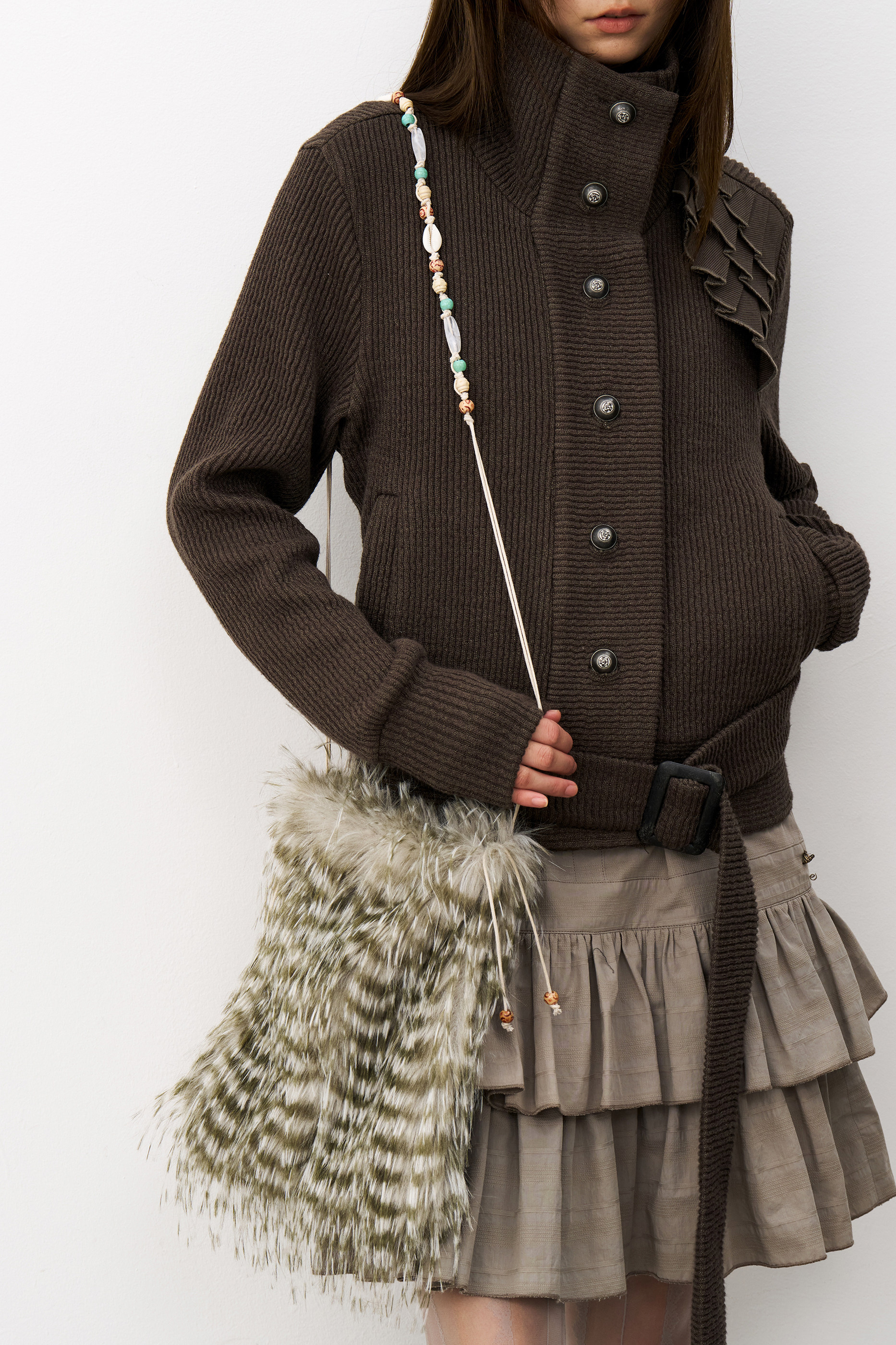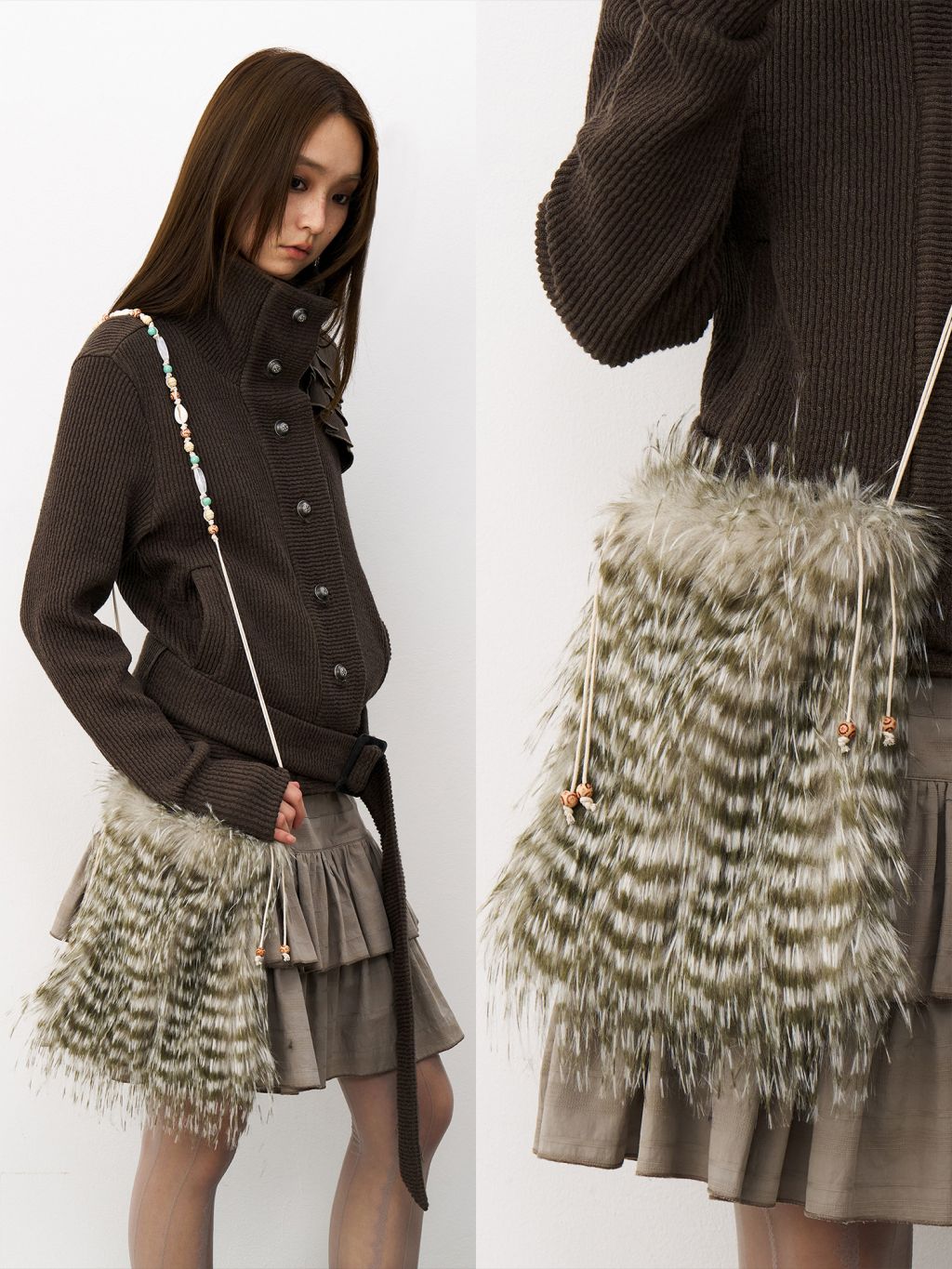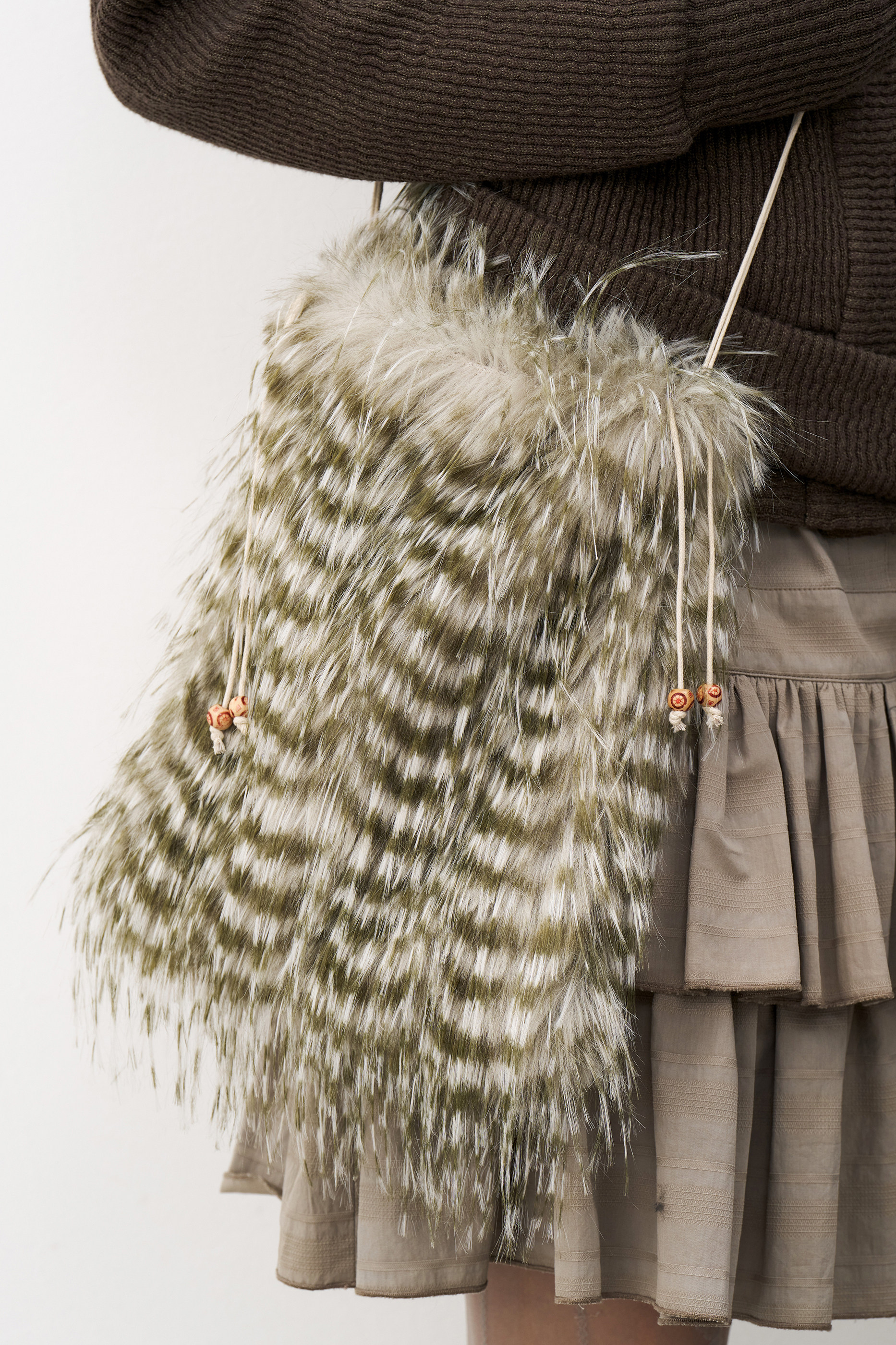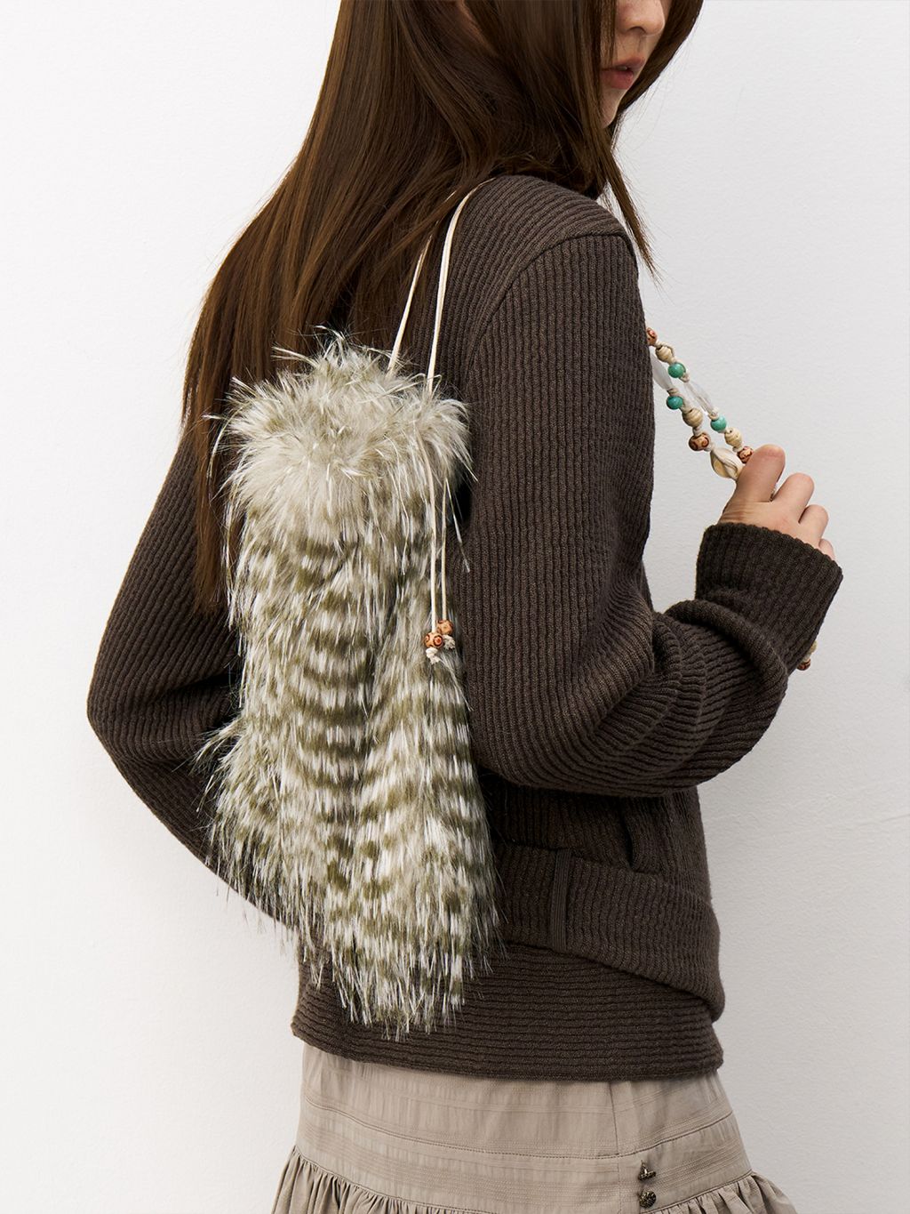 깃털이 겹쳐진 듯한 버드 패턴과 롱 파일 퍼 텍스처가 한 번에 분위기를 만드는 토트백입니다. 가볍게 들어도 룩에 “무드”가 생기는, 리디큘러스식 포인트 백이에요.