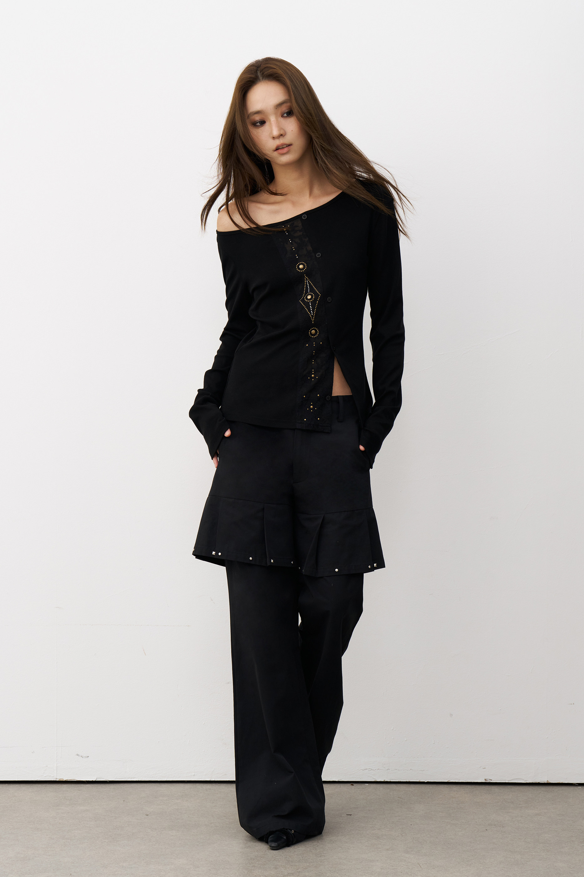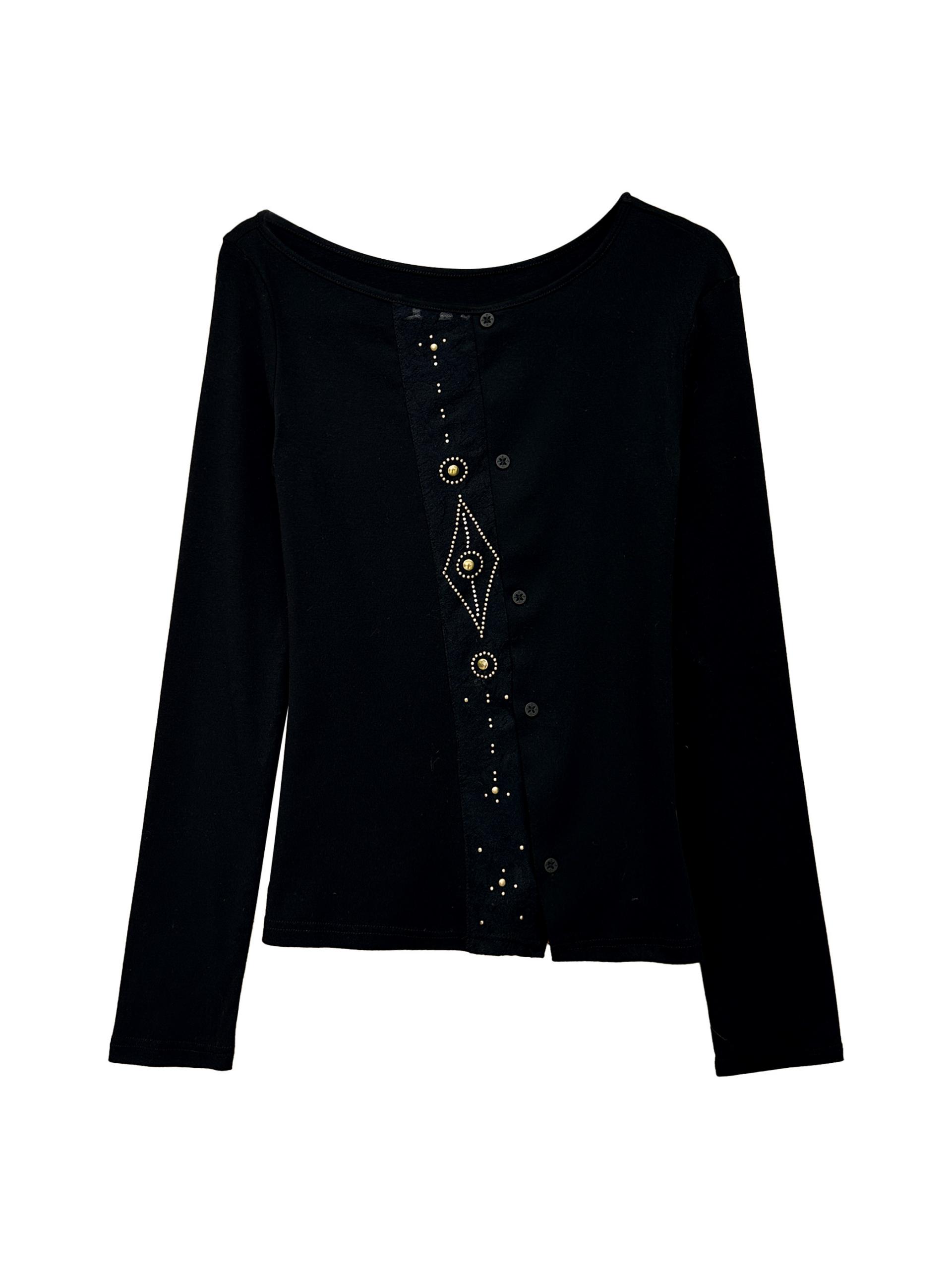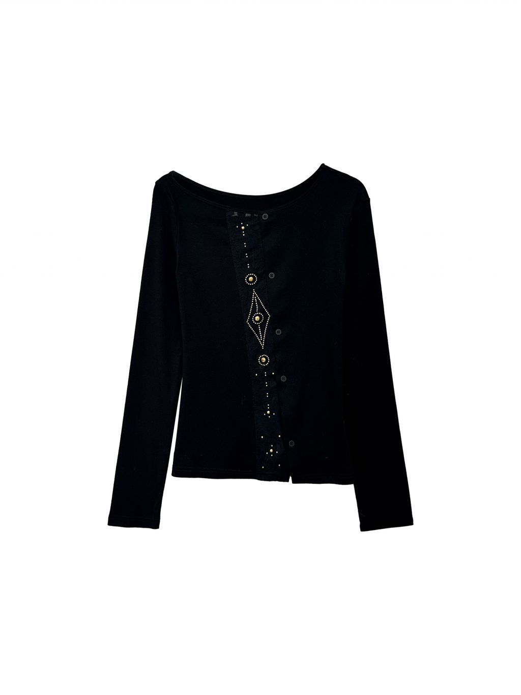 오프화이트 숄더 라인으로 여리한 무드를 만들고, 중앙의 골드 스터드 지오메트릭 패턴이 룩의 포인트를 확실히 잡아주는 롱슬리브 탑입니다. 버튼 오픈 디테일로 실루엣과 분위기를 원하는 만큼 조절할 수 있어요.