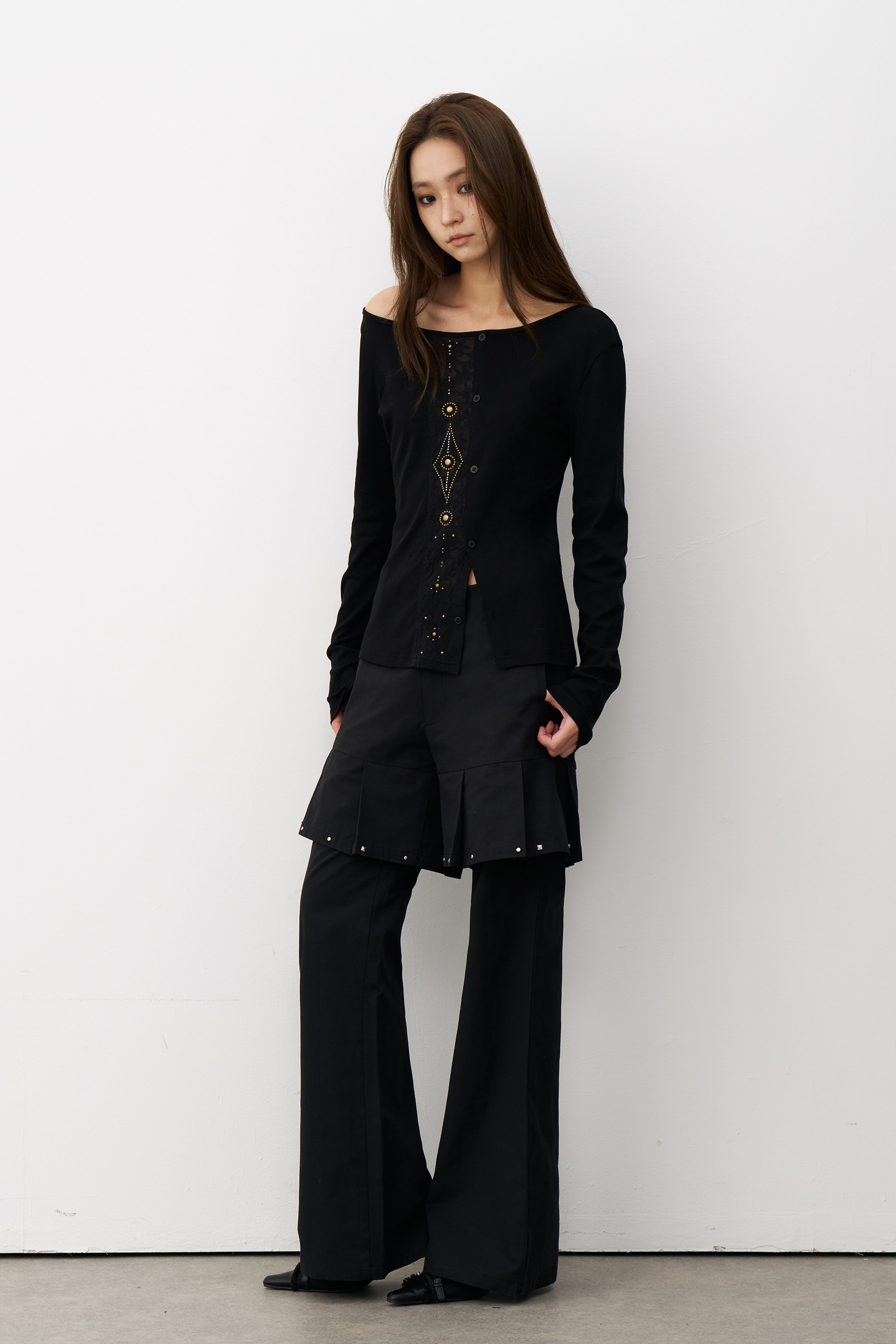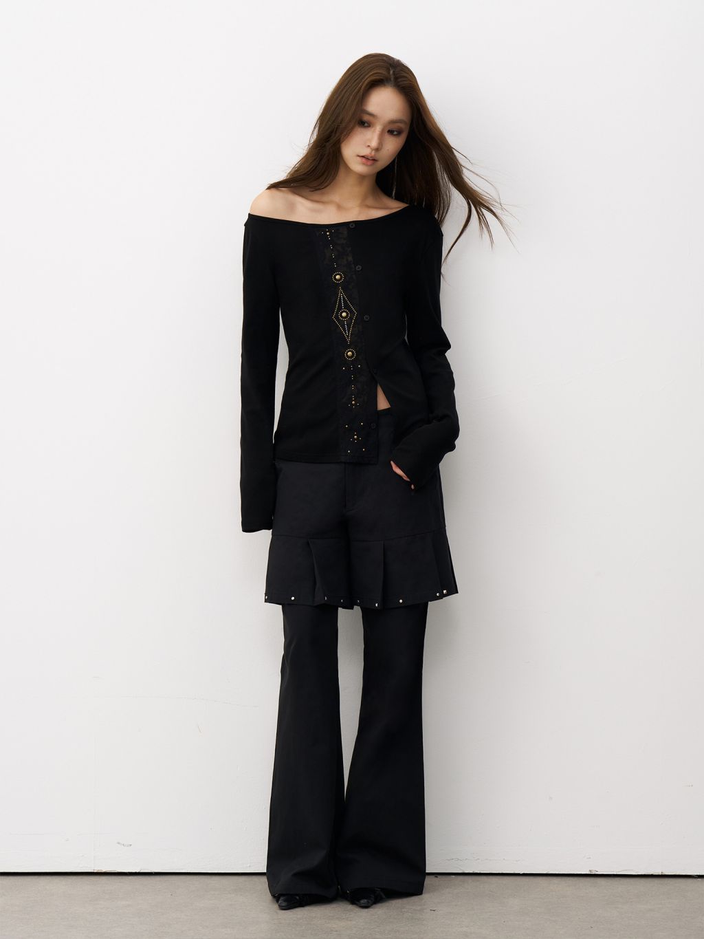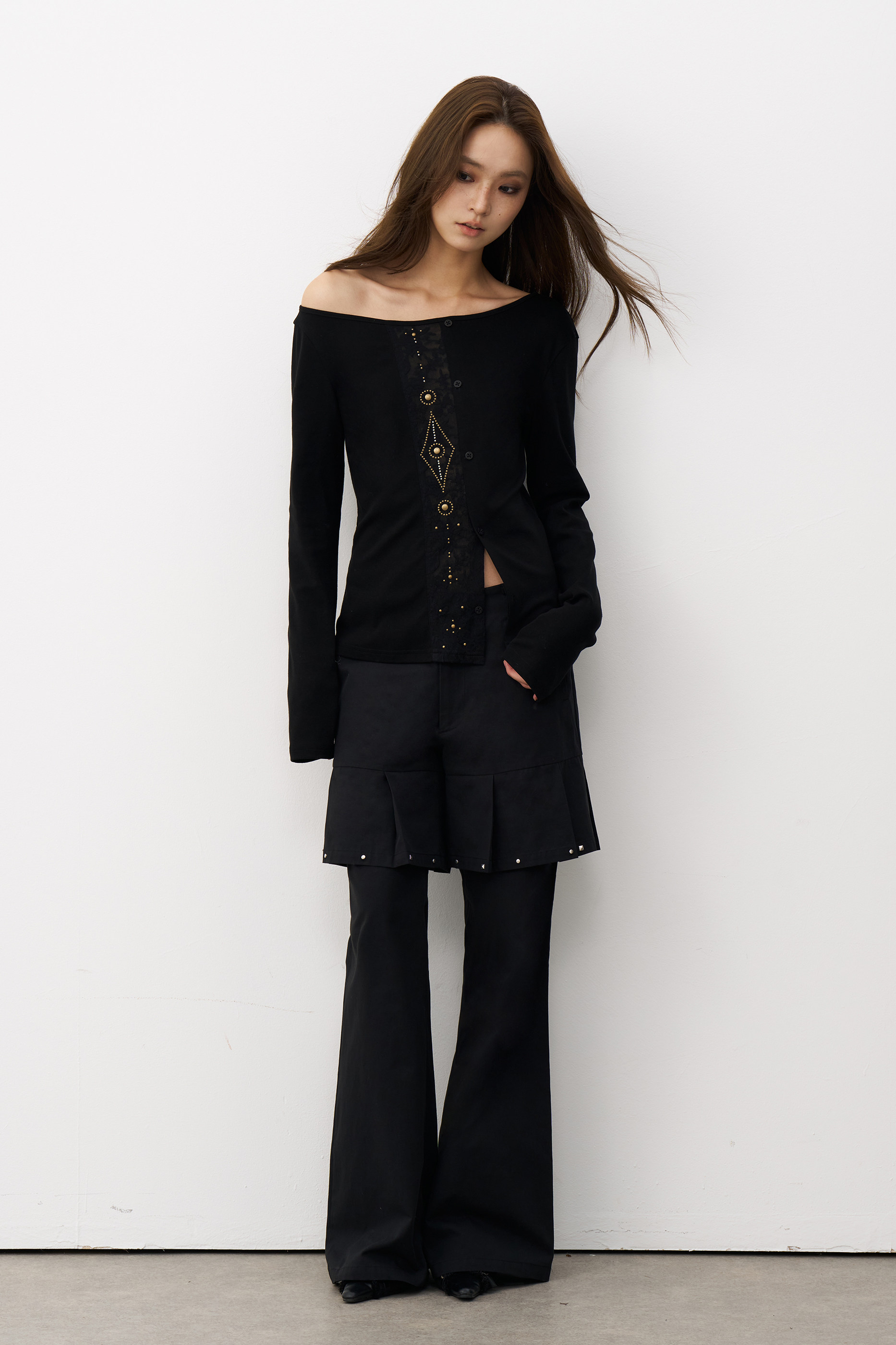 오프화이트 숄더 라인으로 여리한 무드를 만들고, 중앙의 골드 스터드 지오메트릭 패턴이 룩의 포인트를 확실히 잡아주는 롱슬리브 탑입니다. 버튼 오픈 디테일로 실루엣과 분위기를 원하는 만큼 조절할 수 있어요.