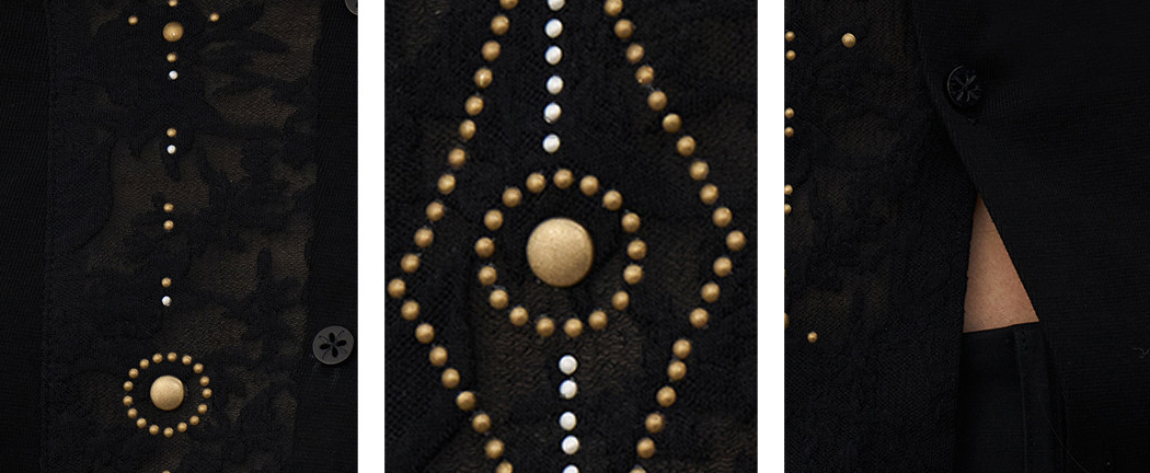 - 중앙 버튼 플래킷 + 골드 스터드 지오메트릭 배치로 빈티지·고스 무드 포인트