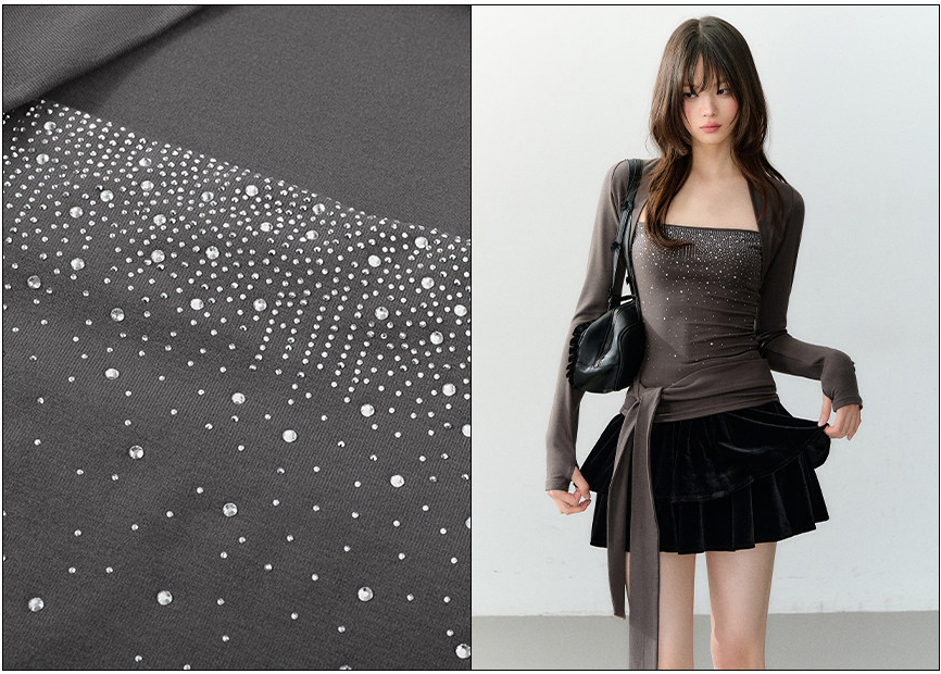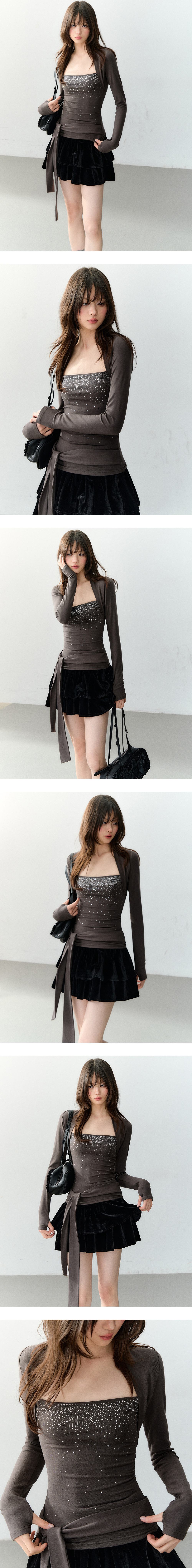 볼레로처럼 이어지는 롱슬리브 레이어드에, 바스트 라인 핫픽스 스톤이 은근히 반짝이며 ‘꾸안꾸 글램’ 무드를 완성하는 탑입니다. 허리 랩 타이로 실루엣을 원하는 만큼 조절해, 상체 라인을 더 슬림하게 잡아줍니다.