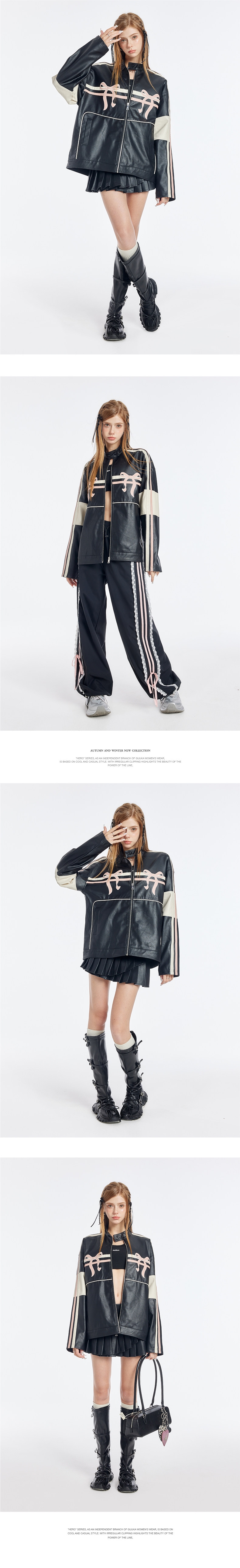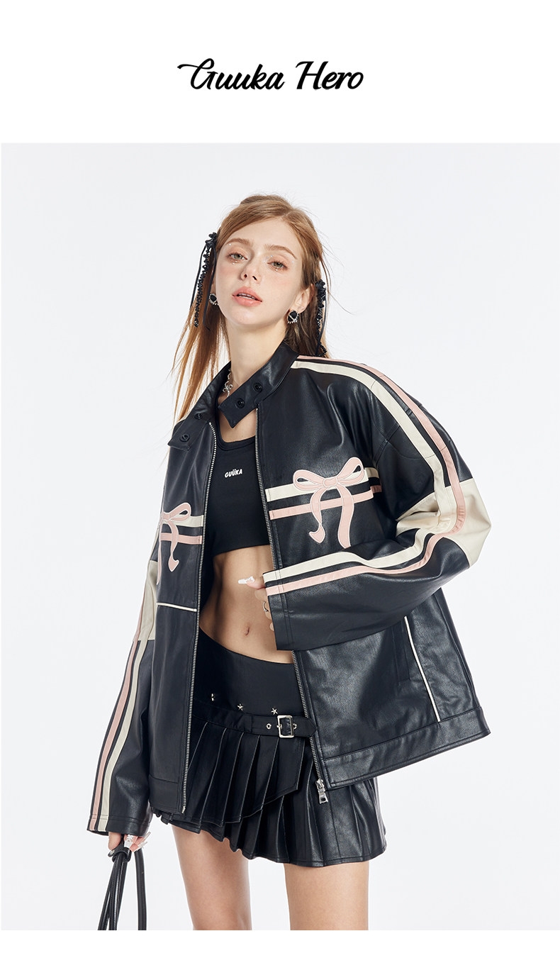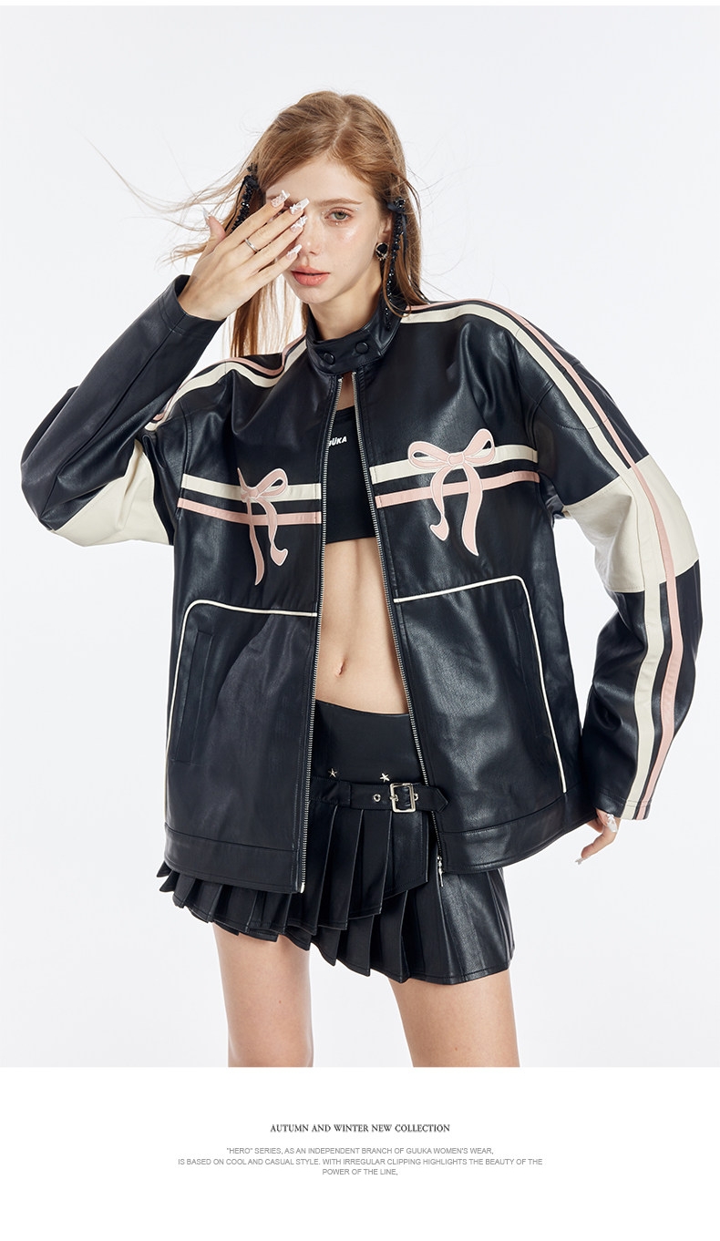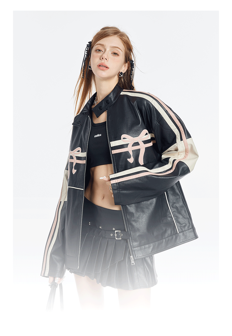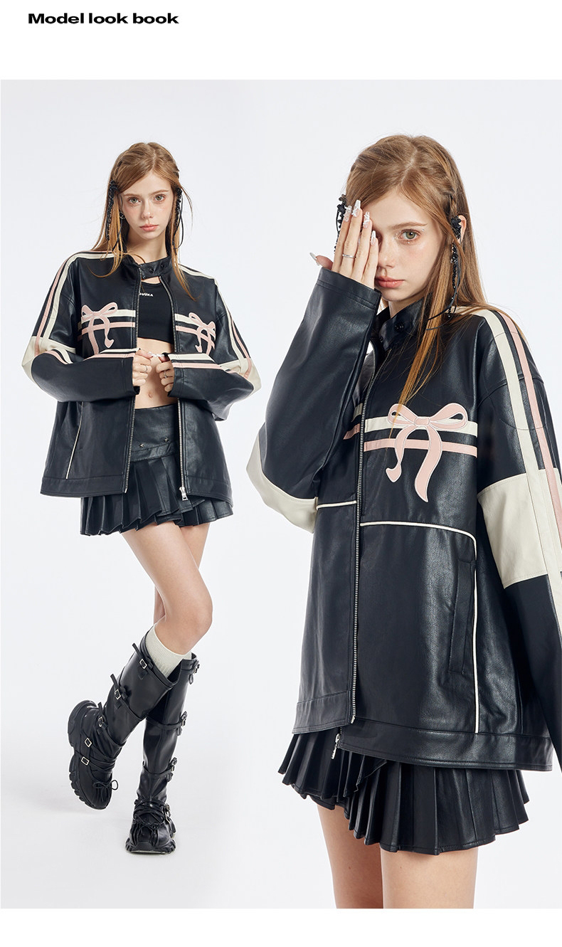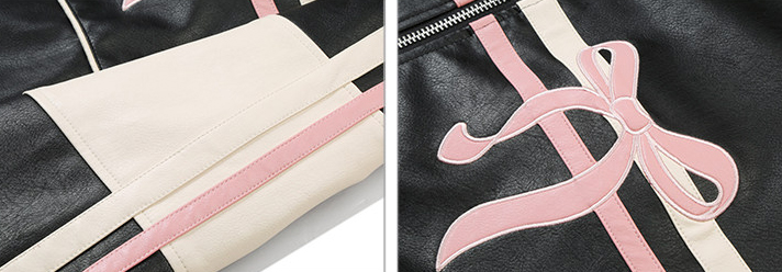 블랙 PU 레더에 레이싱 스트라이프와 핑크 리본 패치를 얹어, ‘하드+스윗’ 무드가 한 번에 완성되는 모토 자켓입니다. 오버사이즈에 가까운 여유 핏이라 크롭탑·미니스커트·와이드 팬츠까지 스타일링 폭이 넓습니다.