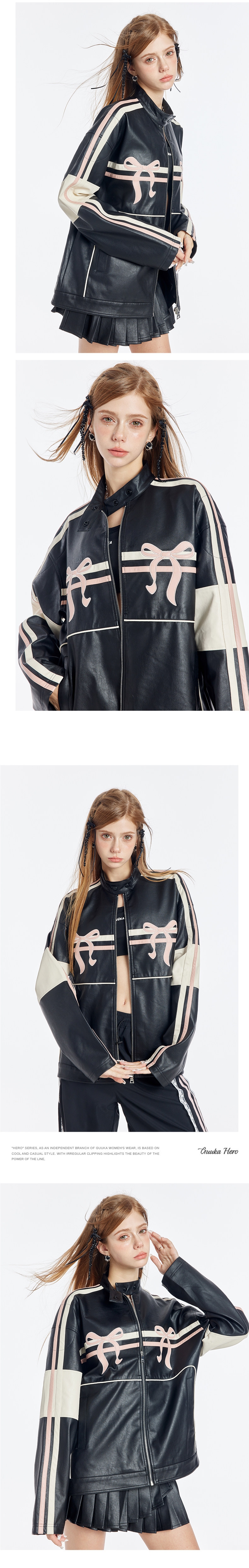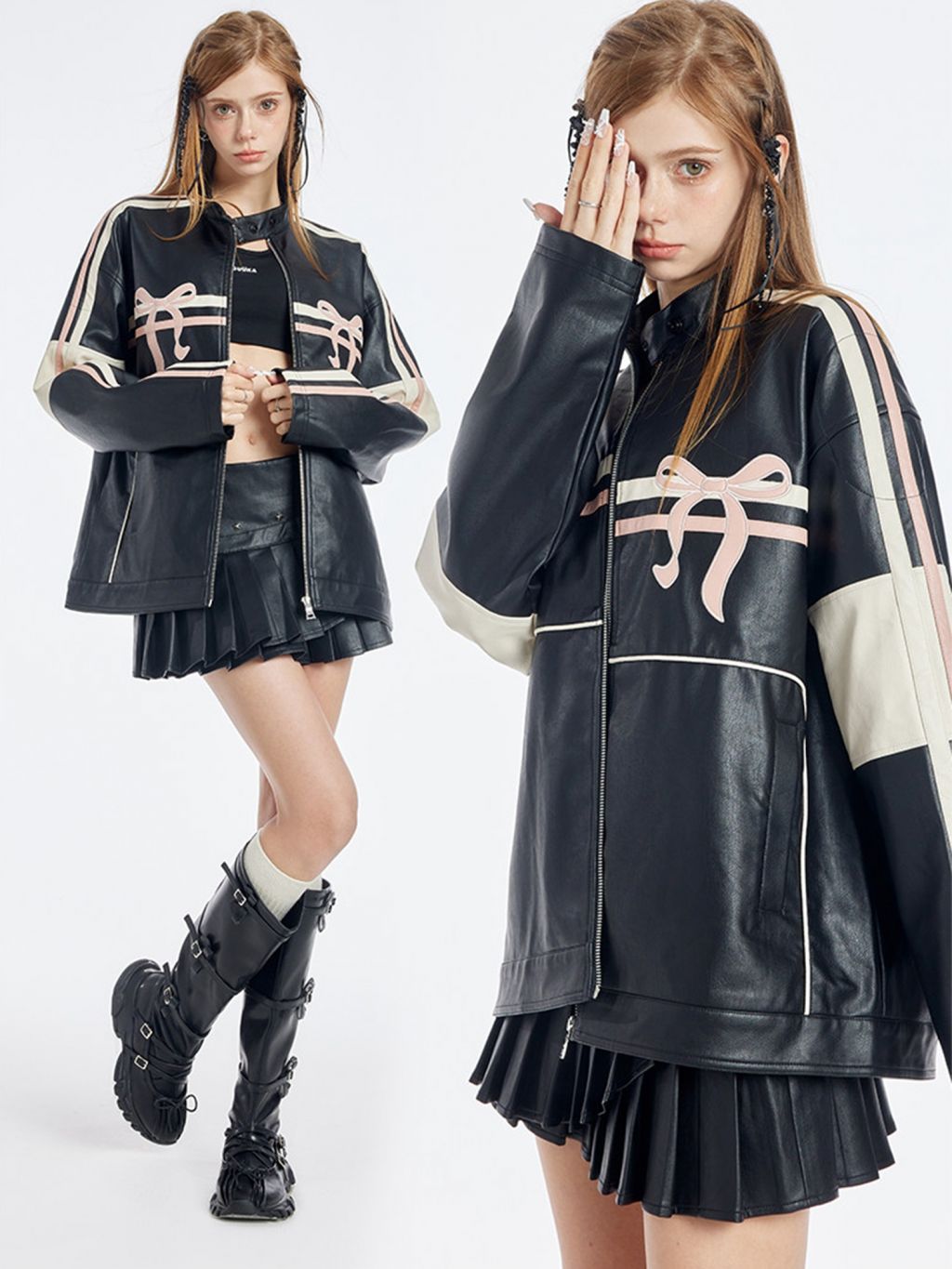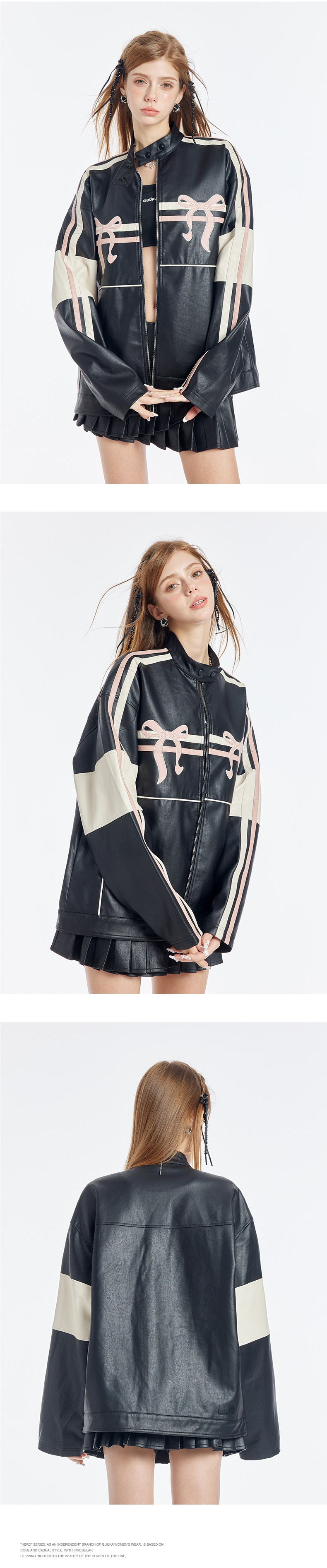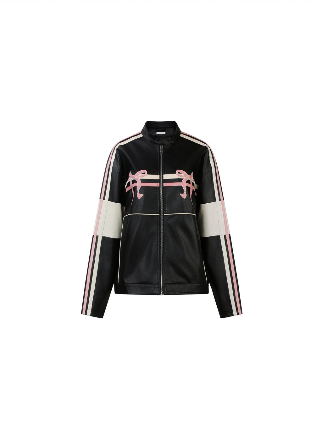 블랙 PU 레더에 레이싱 스트라이프와 핑크 리본 패치를 얹어, ‘하드+스윗’ 무드가 한 번에 완성되는 모토 자켓입니다. 오버사이즈에 가까운 여유 핏이라 크롭탑·미니스커트·와이드 팬츠까지 스타일링 폭이 넓습니다.