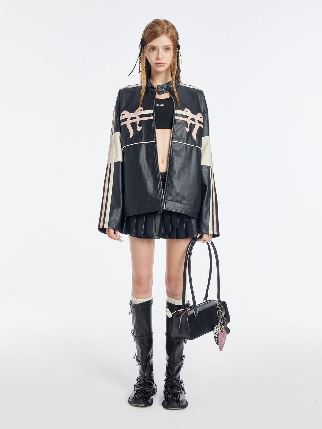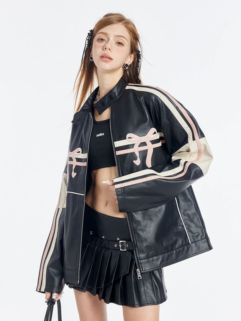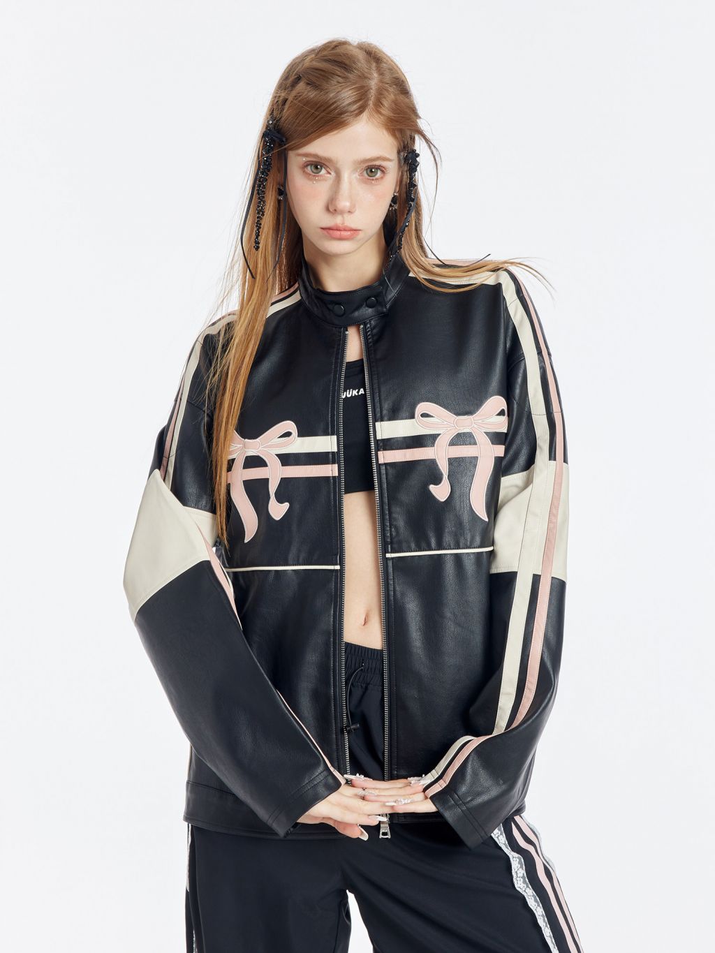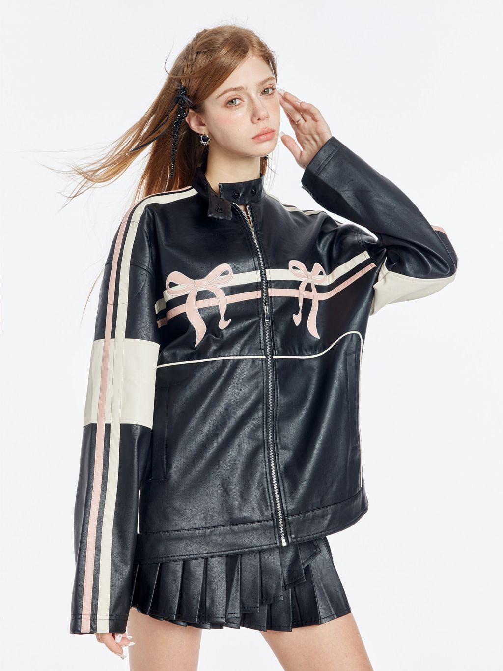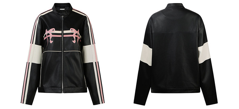 블랙 PU 레더에 레이싱 스트라이프와 핑크 리본 패치를 얹어, ‘하드+스윗’ 무드가 한 번에 완성되는 모토 자켓입니다. 오버사이즈에 가까운 여유 핏이라 크롭탑·미니스커트·와이드 팬츠까지 스타일링 폭이 넓습니다.