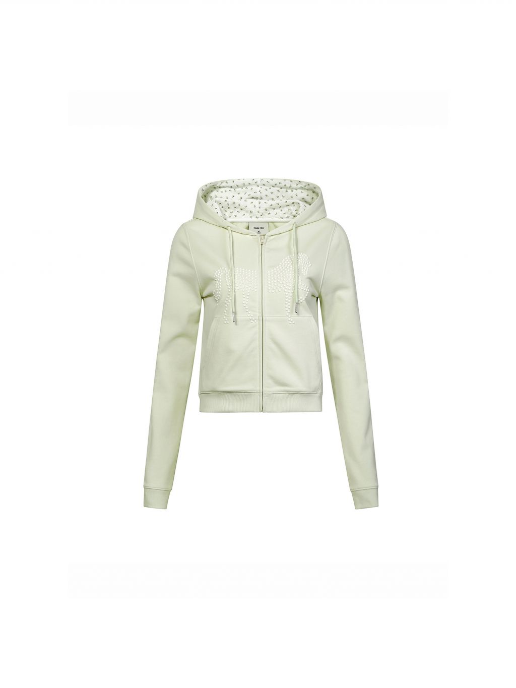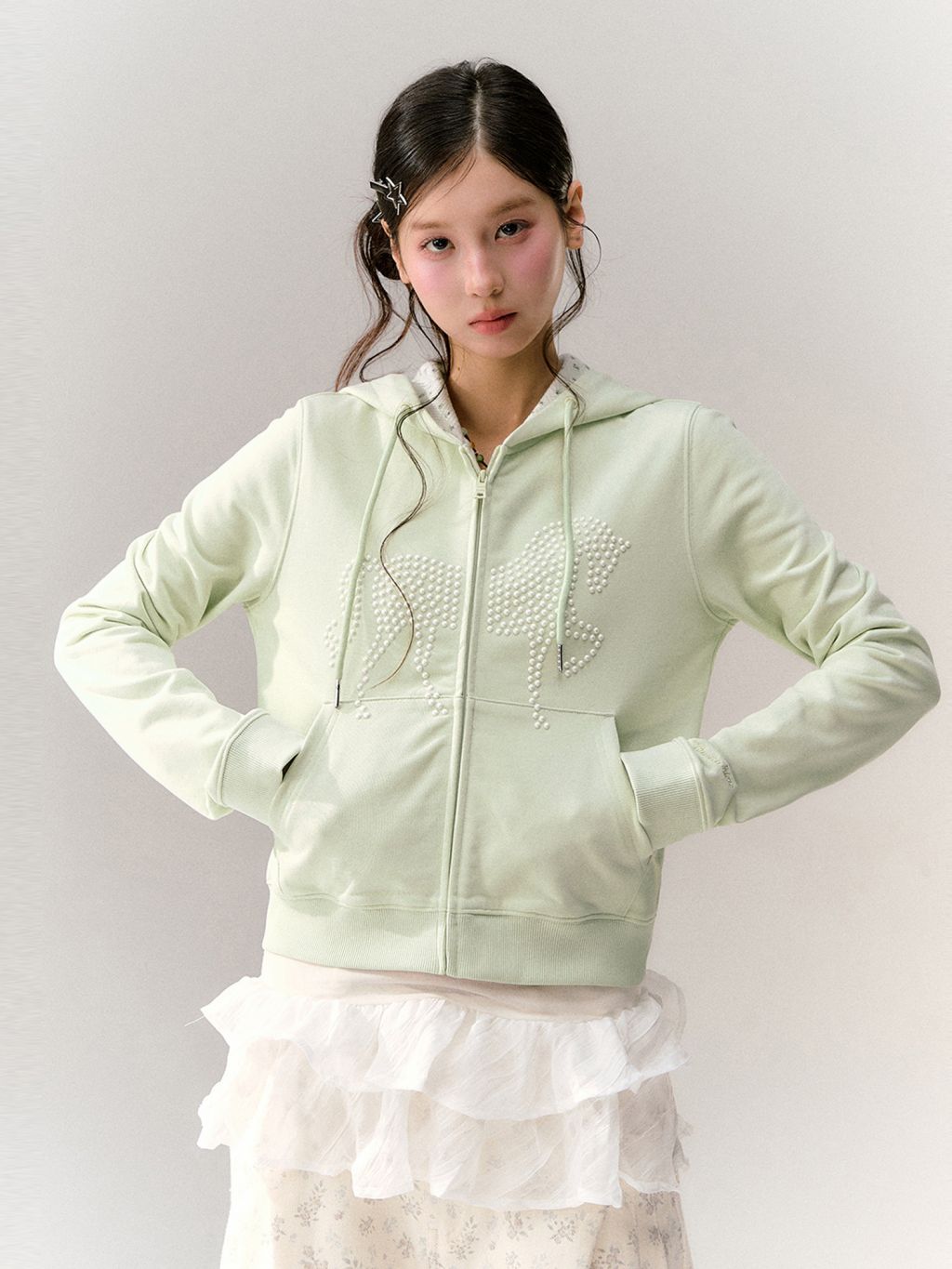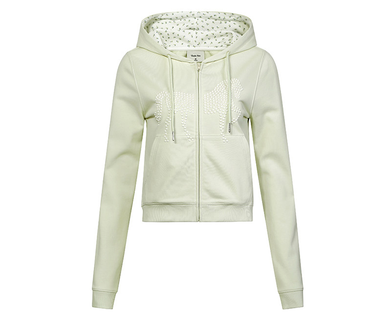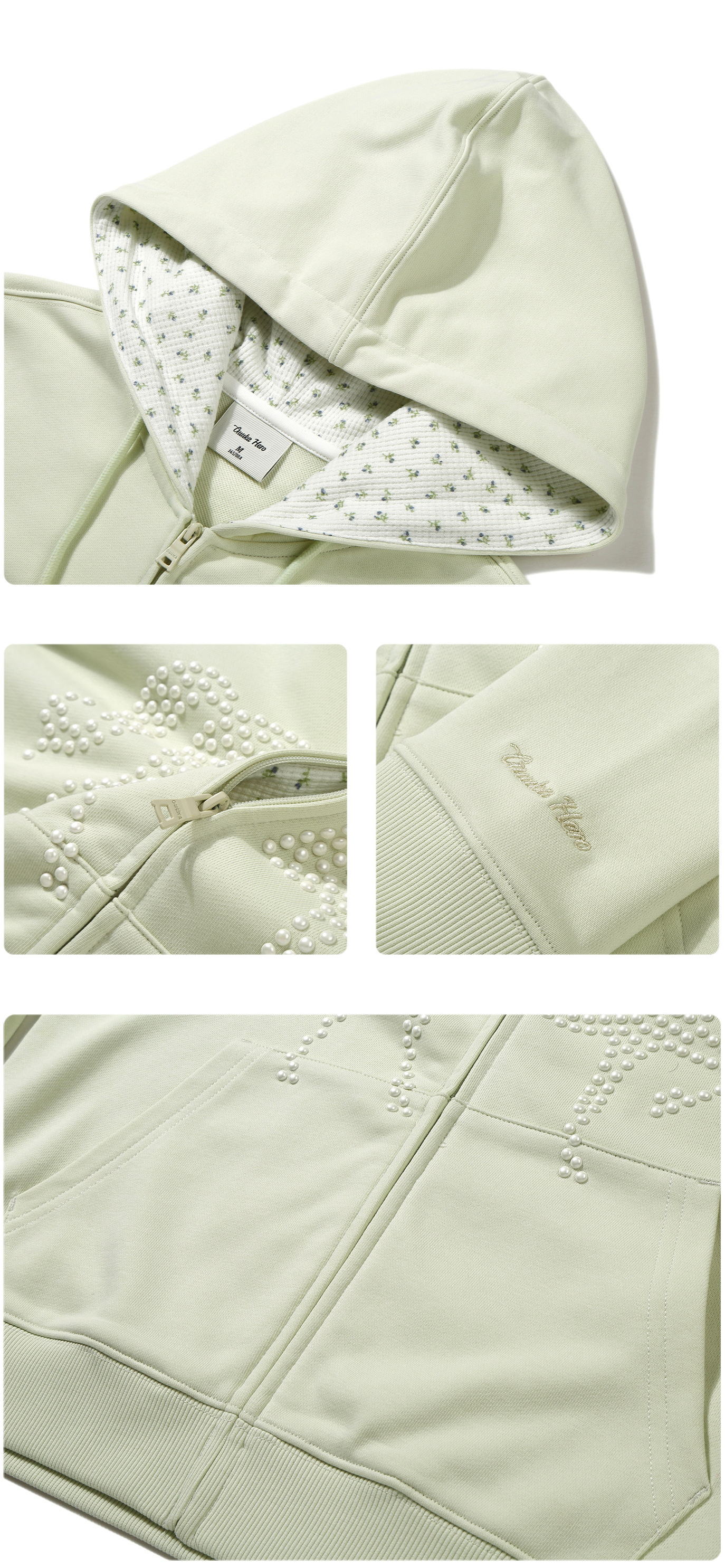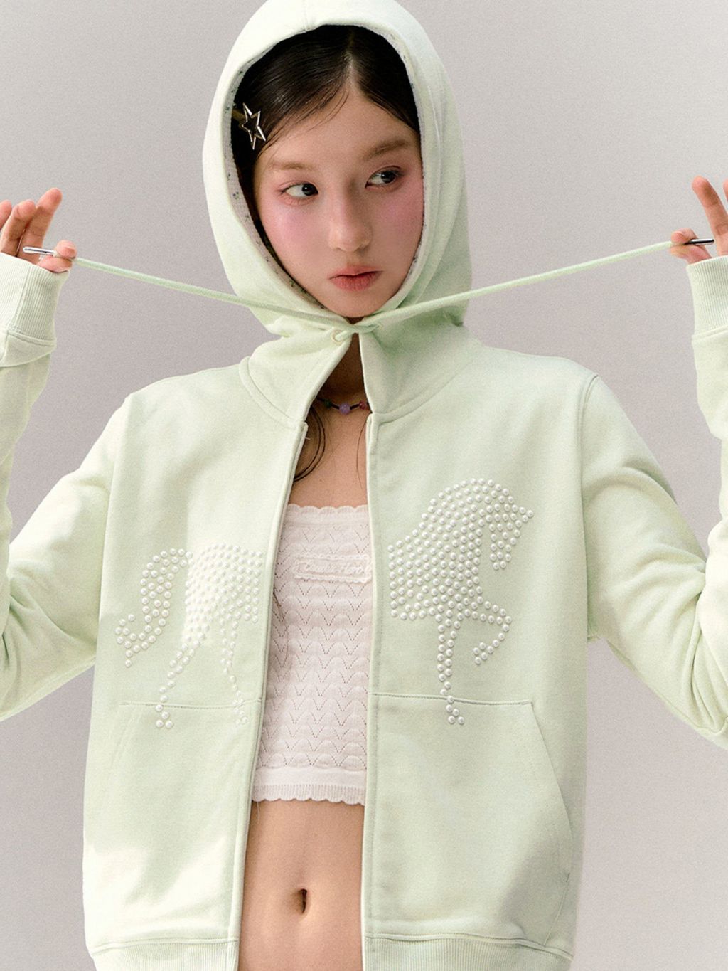 파스텔 민트 톤 바디에 ‘포니 모티프’ 진주 스터드를 더해, 스포티한 후드 집업을 러블리하게 업그레이드한 아이템입니다. 크롭에 가까운 기장이라 하이웨이스트 하의와 매치하면 비율이 확 살아납니다.