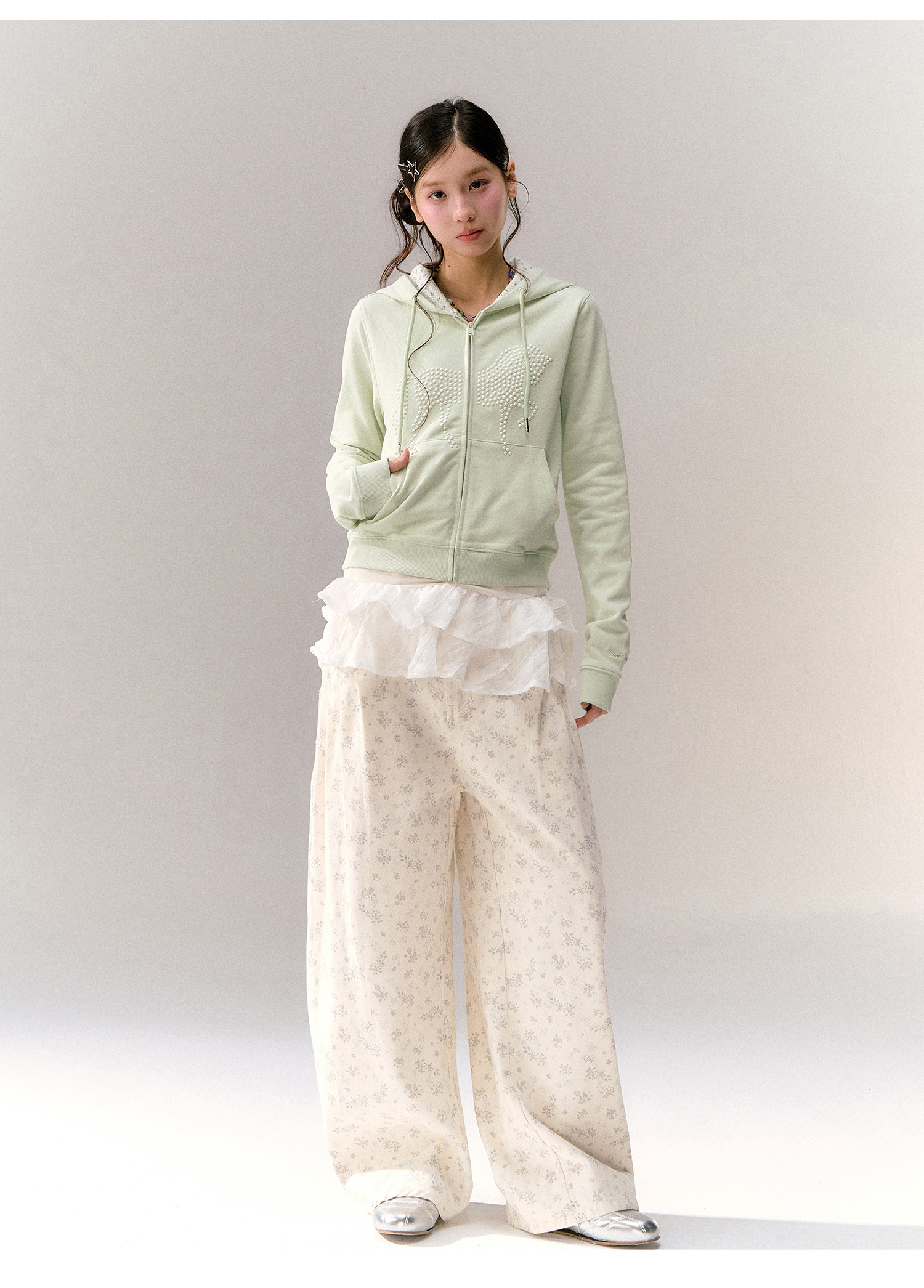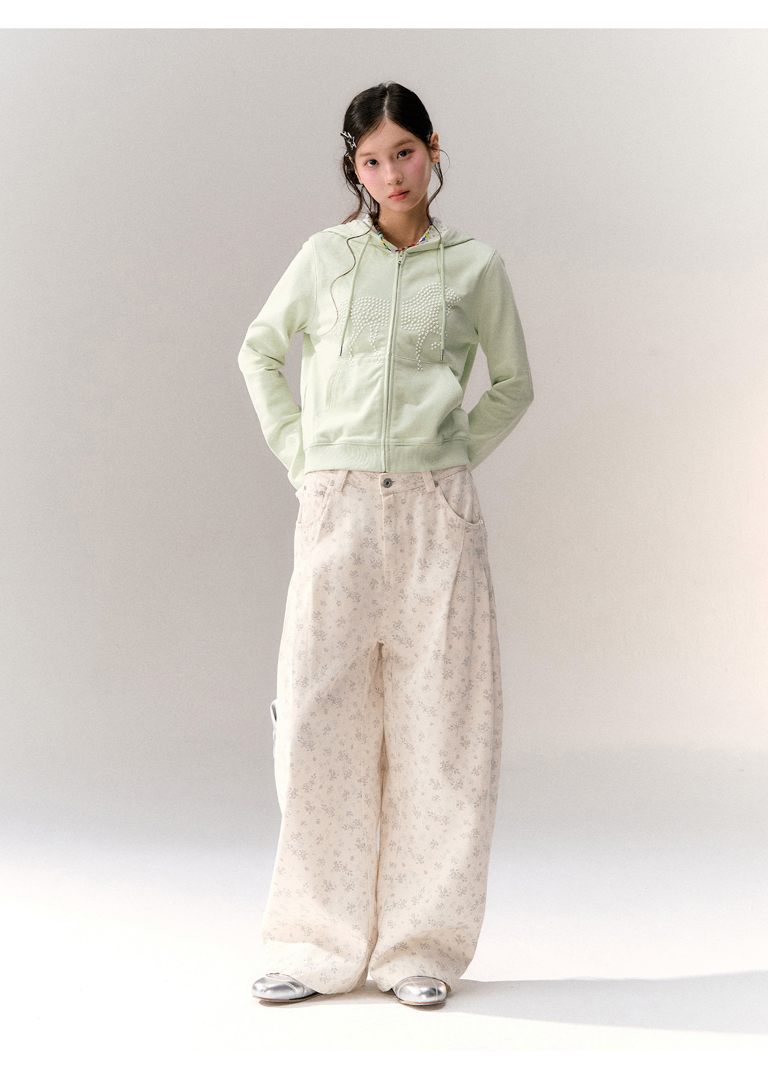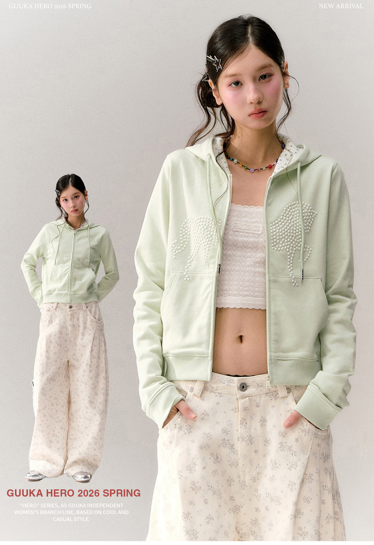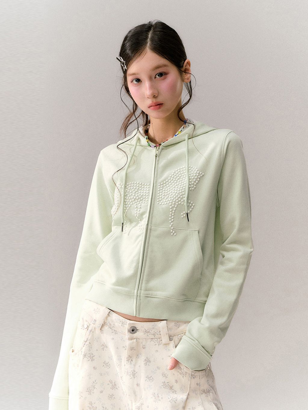 파스텔 민트 톤 바디에 ‘포니 모티프’ 진주 스터드를 더해, 스포티한 후드 집업을 러블리하게 업그레이드한 아이템입니다. 크롭에 가까운 기장이라 하이웨이스트 하의와 매치하면 비율이 확 살아납니다.