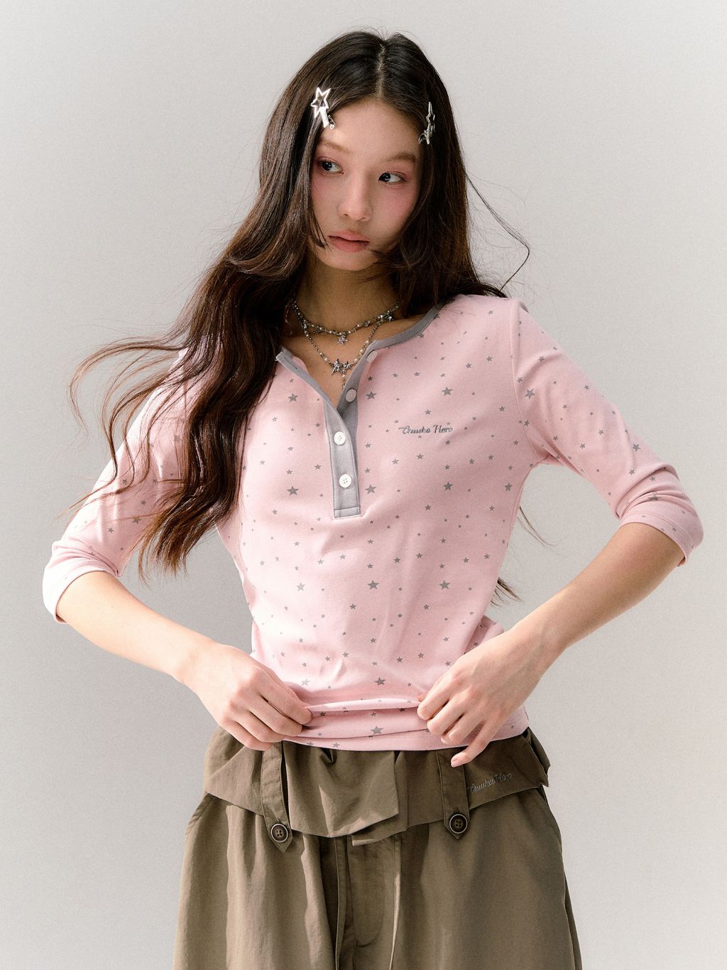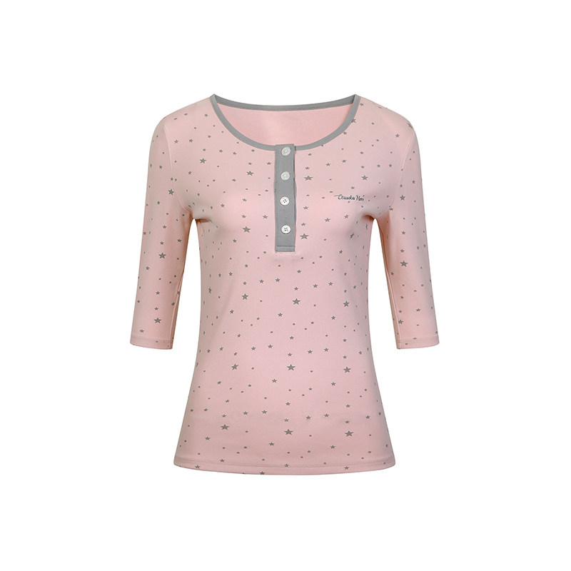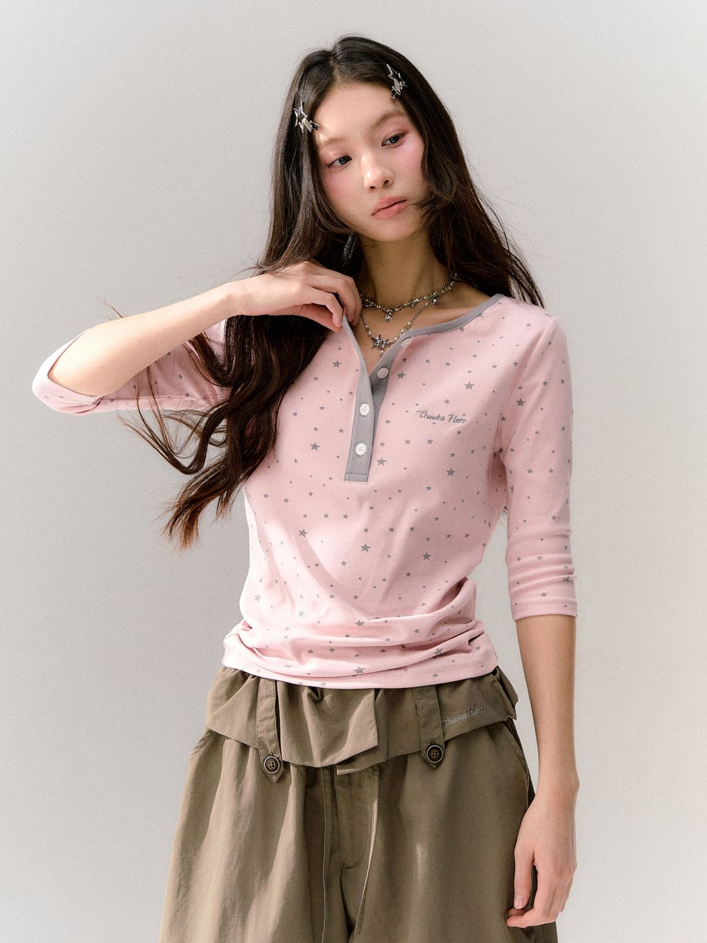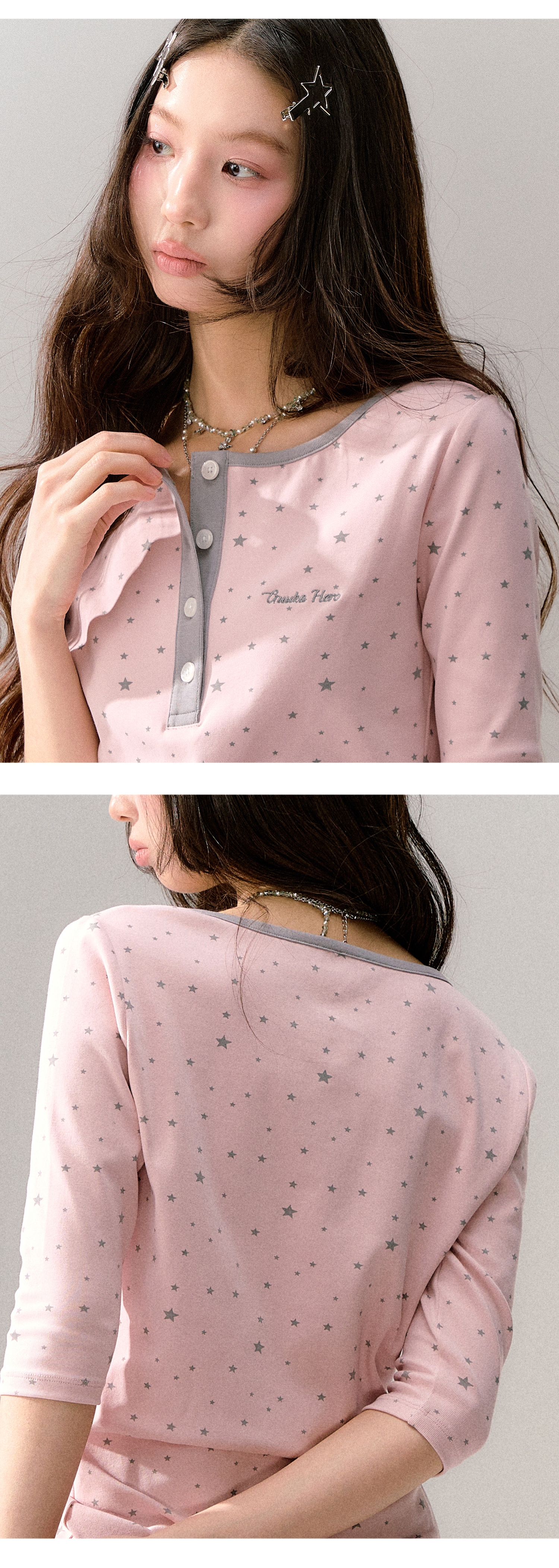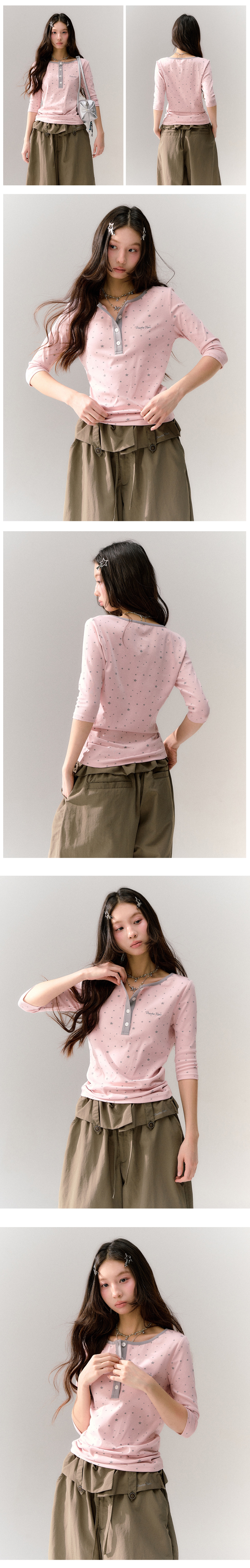 핑크 바디에 잔잔한 스타 패턴을 올리고, 그레이 버튼 플라켓으로 포인트를 준 헨리넥 티셔츠입니다. 7부 소매라 단독으로도, 레이어드용 이너로도 시즌 활용도가 높습니다.