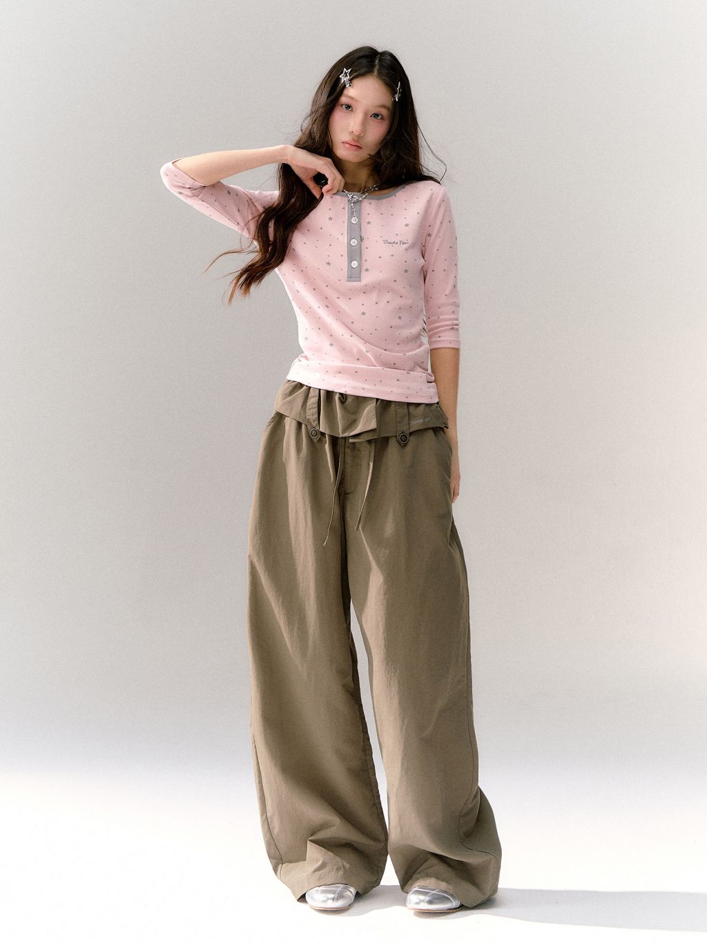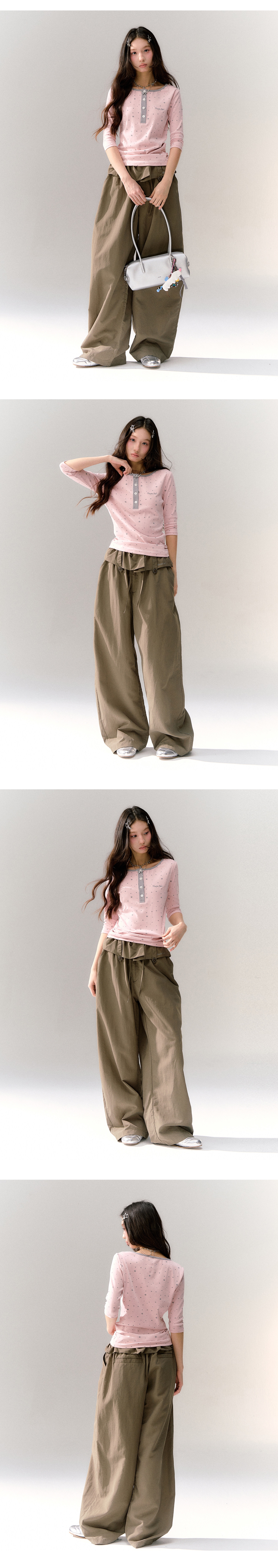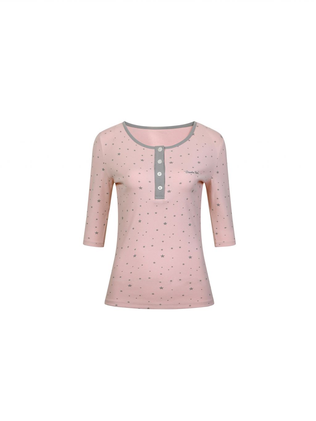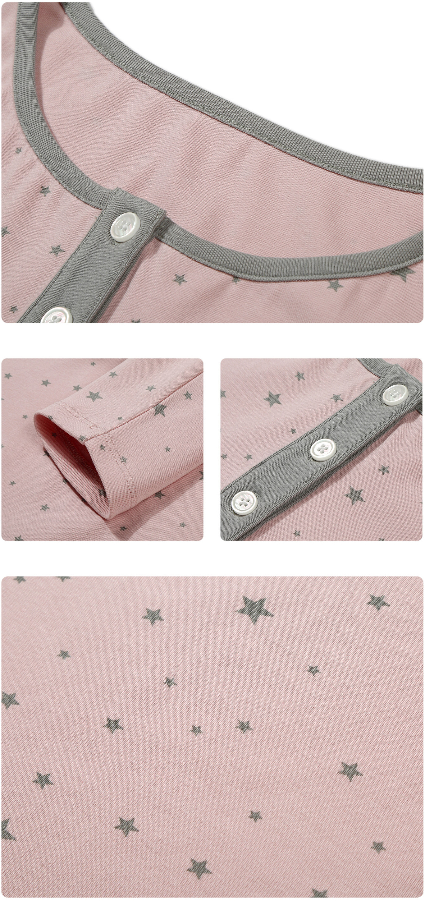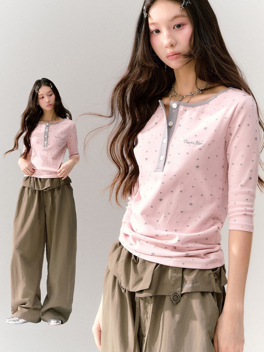 핑크 바디에 잔잔한 스타 패턴을 올리고, 그레이 버튼 플라켓으로 포인트를 준 헨리넥 티셔츠입니다. 7부 소매라 단독으로도, 레이어드용 이너로도 시즌 활용도가 높습니다.