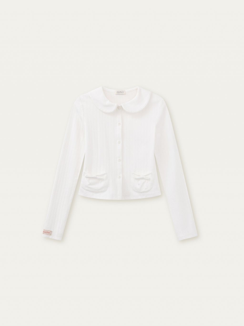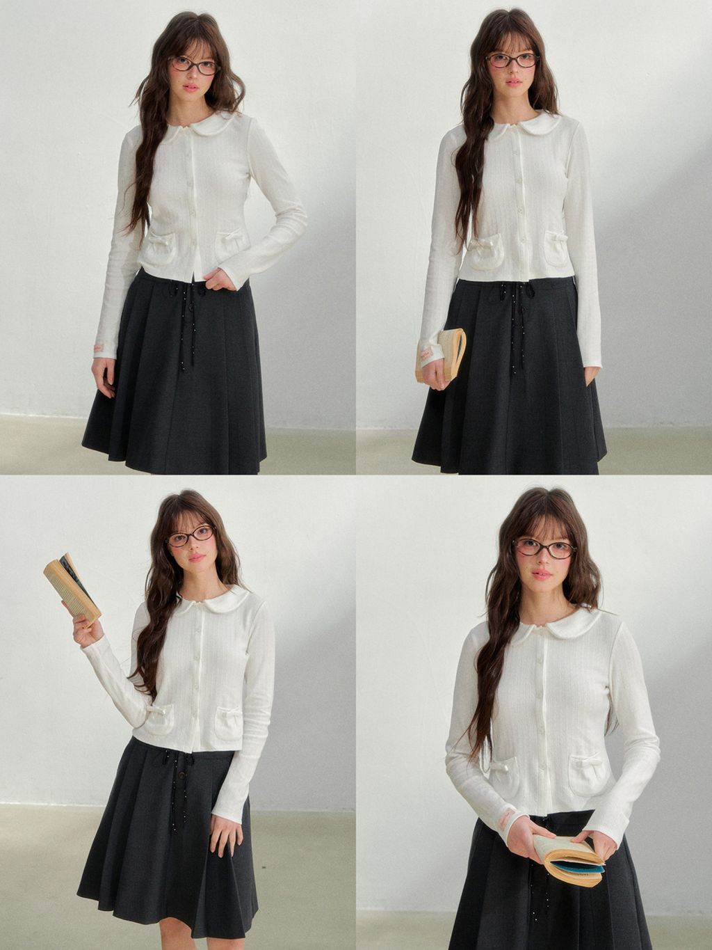- 둥근 돌 카라와 버튼 여밈으로 소녀스러운 실루엣이 완성됩니다.