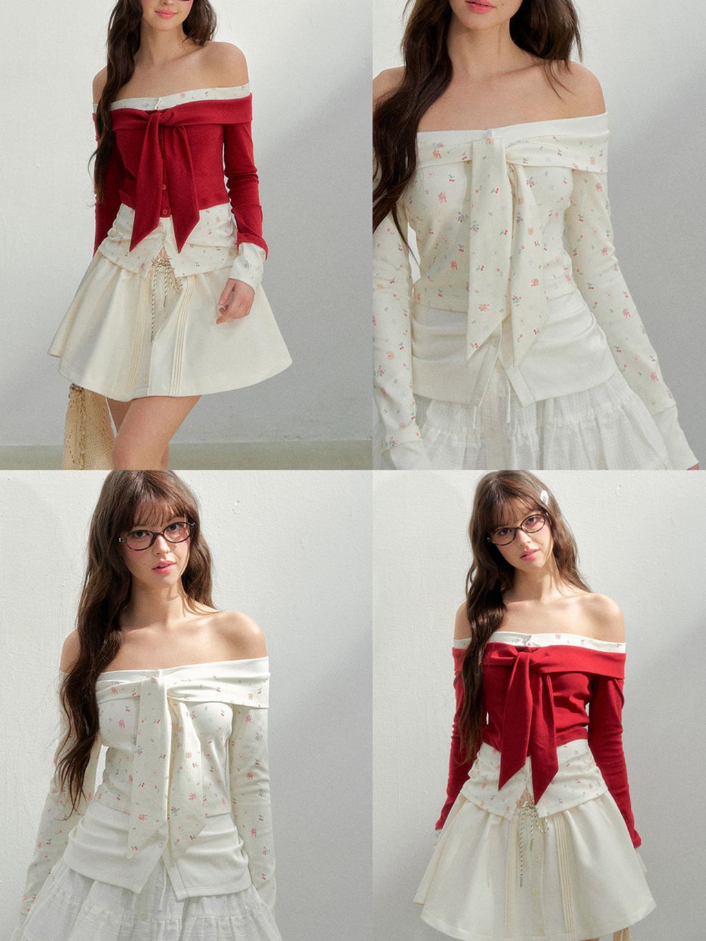 빅 보우 디테일이 한 번에 시선을 잡는 오프숄더 탑으로, 레이어드한 듯한 투톤 디자인이 룩의 완성도를 즉시 올려줍니다. 쇄골 라인을 예쁘게 드러내면서도 포인트는 확실한 “사진 잘 나오는” 상의입니다.