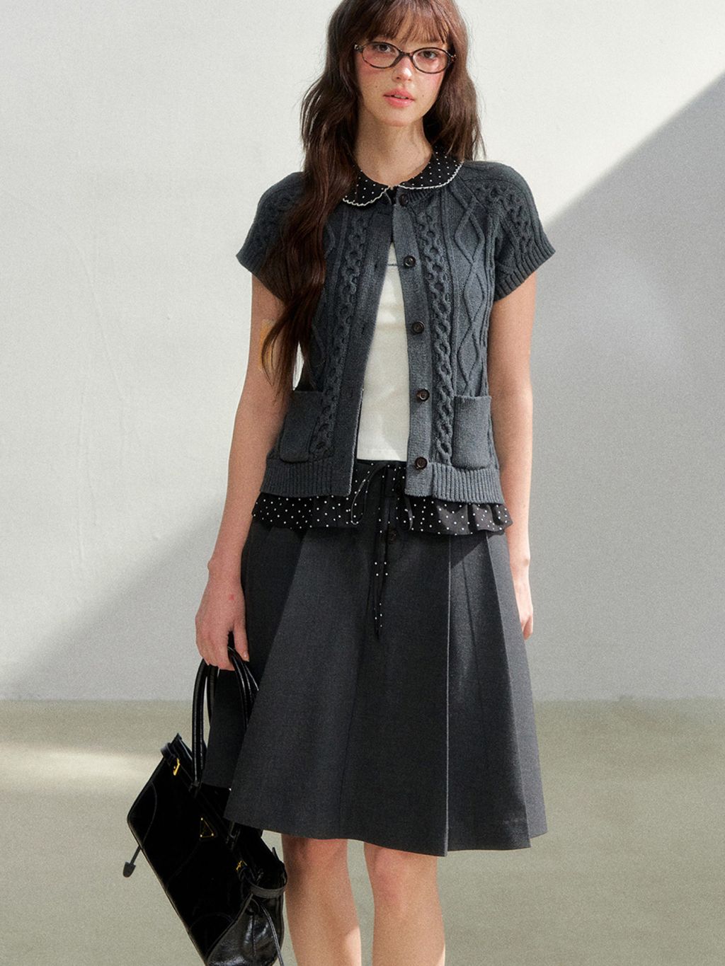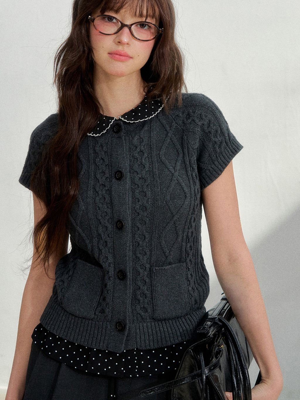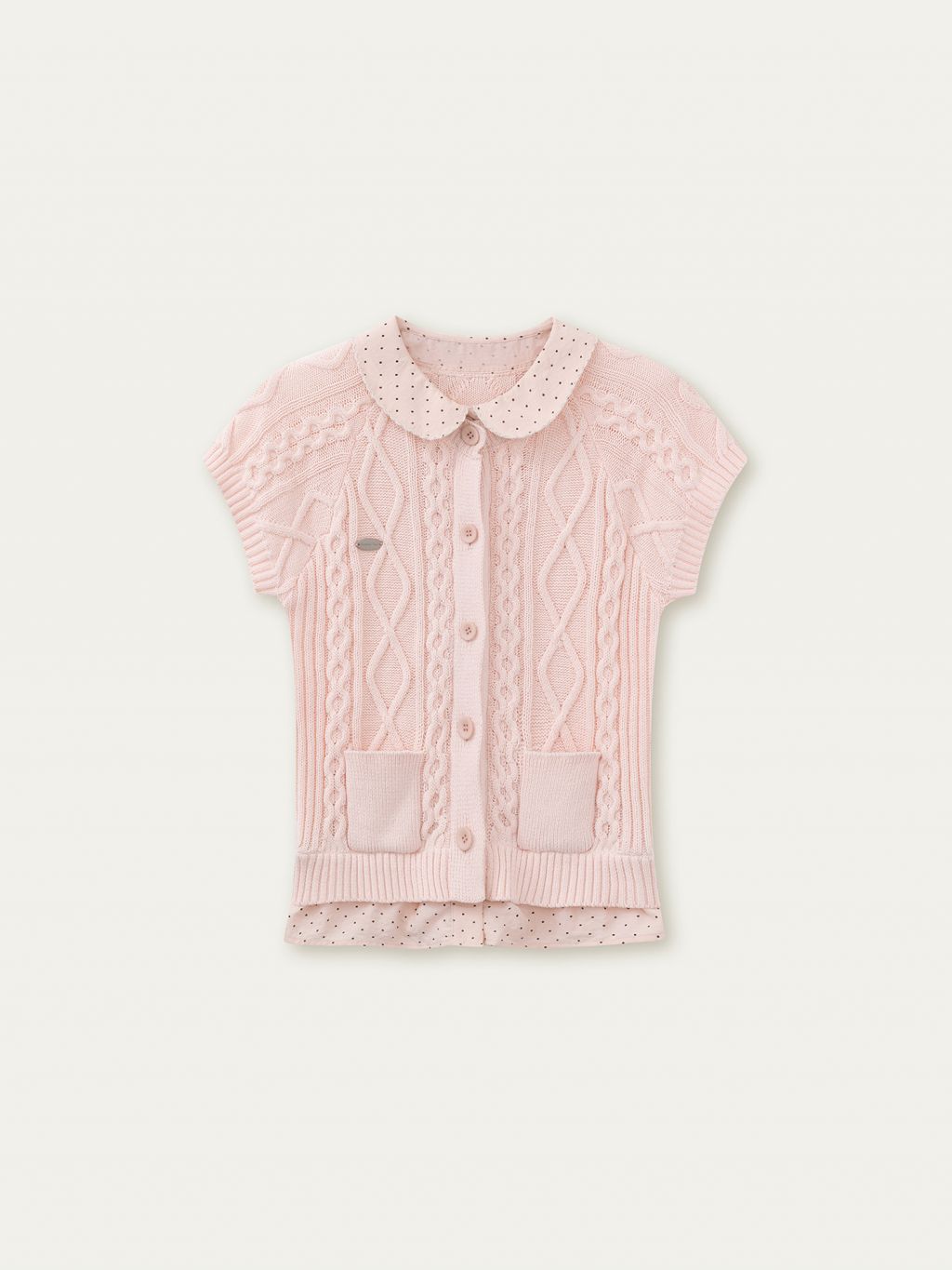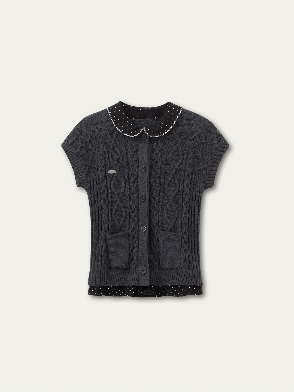 도트 카라를 레이어드한 듯한 페이크 투피스 디테일로 한 벌만 입어도 룩이 완성되는 니트 가디건입니다. 차콜/블러시 톤이 무드를 또렷하게 잡아주고, 케이블 조직이 클래식한 포인트를 더해줍니다.