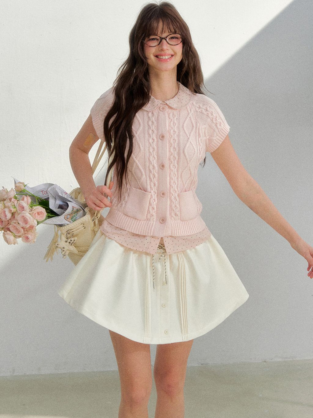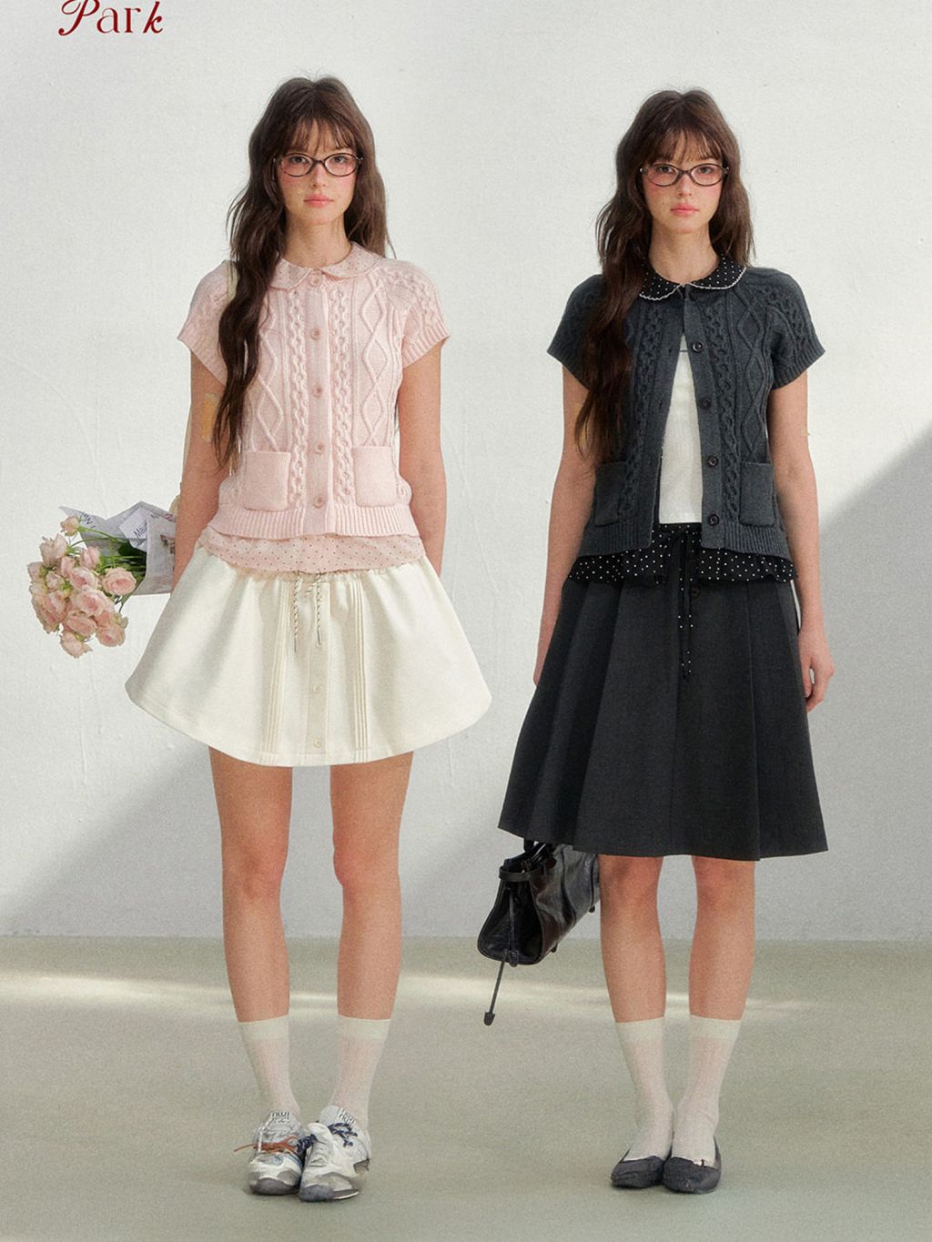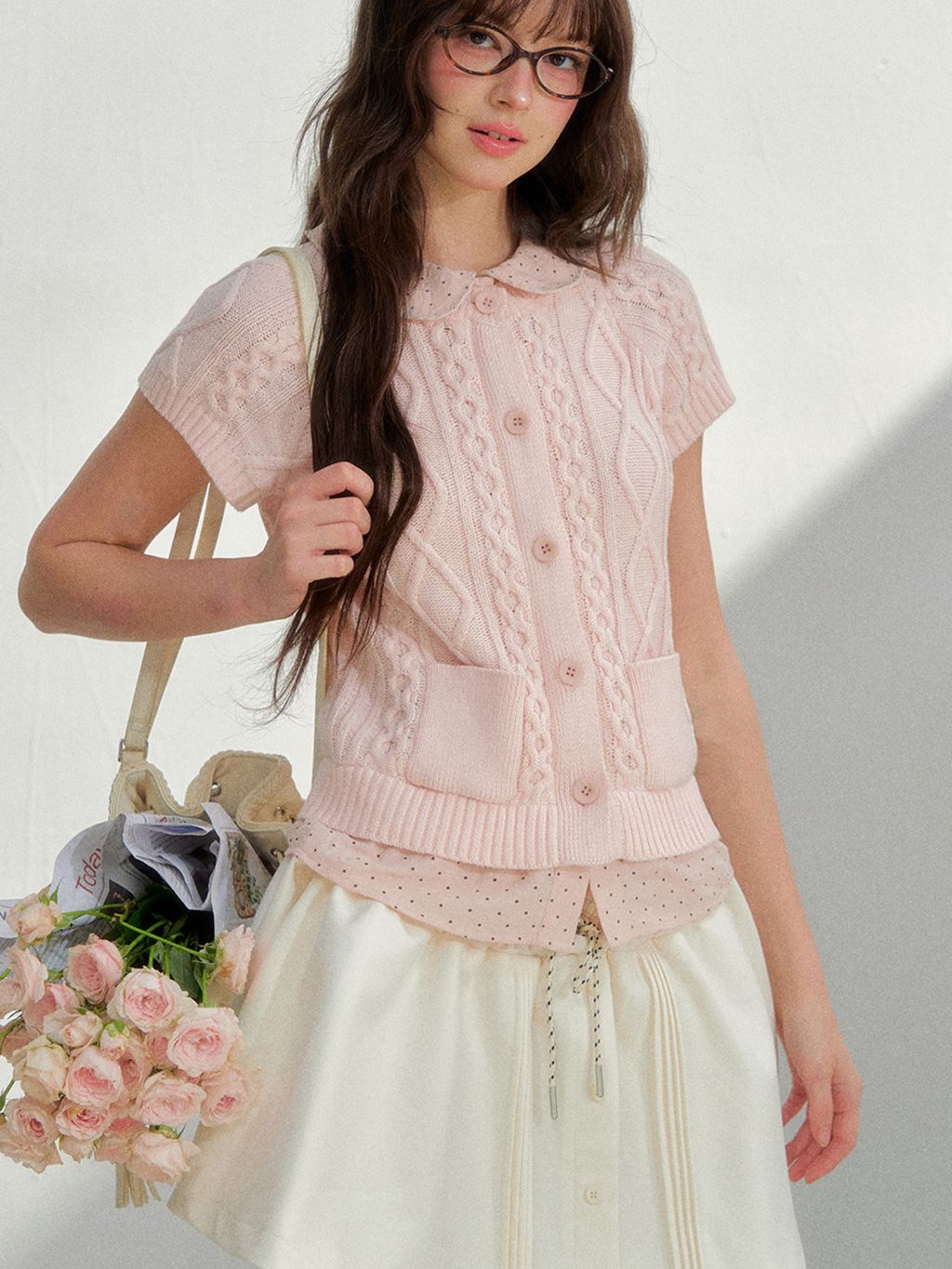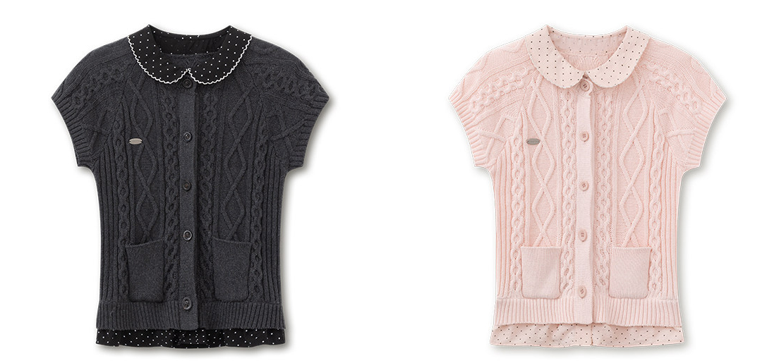도트 카라를 레이어드한 듯한 페이크 투피스 디테일로 한 벌만 입어도 룩이 완성되는 니트 가디건입니다. 차콜/블러시 톤이 무드를 또렷하게 잡아주고, 케이블 조직이 클래식한 포인트를 더해줍니다.