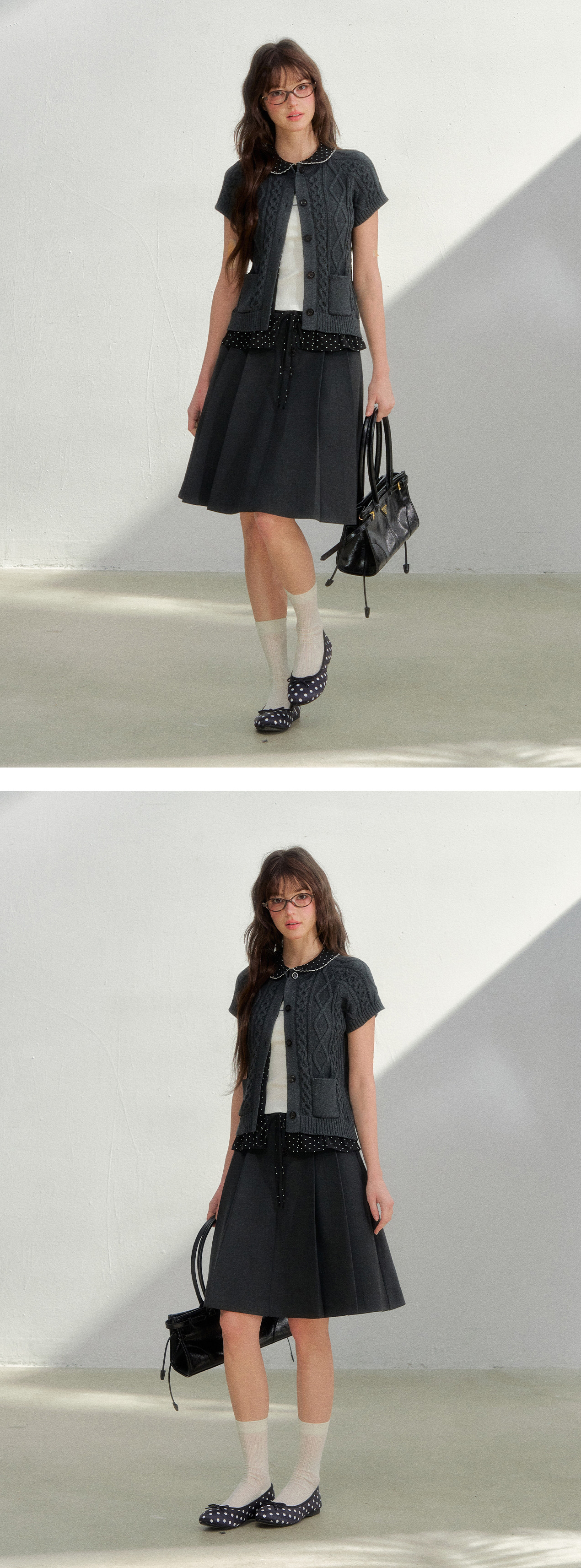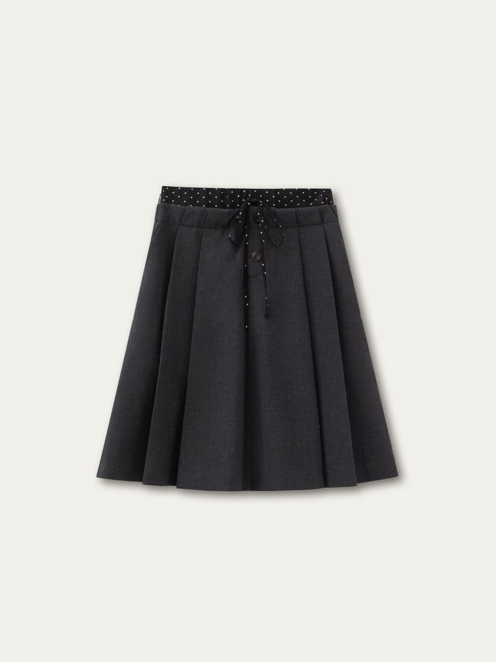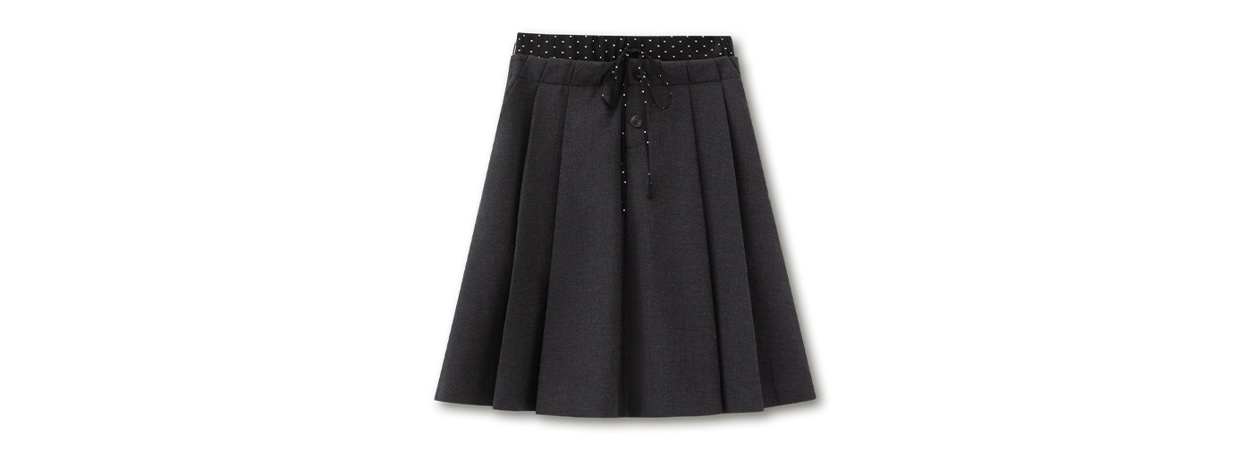 딥한 애쉬-차콜 톤에 도트 웨이스트가 살짝 보이는 레이어드 디테일로, 룩이 단번에 ‘무드 있게’ 정리되는 스커트예요. 걸을 때마다 퍼지는 플리츠 A라인이 하체 라인을 자연스럽게 커버해줘요.