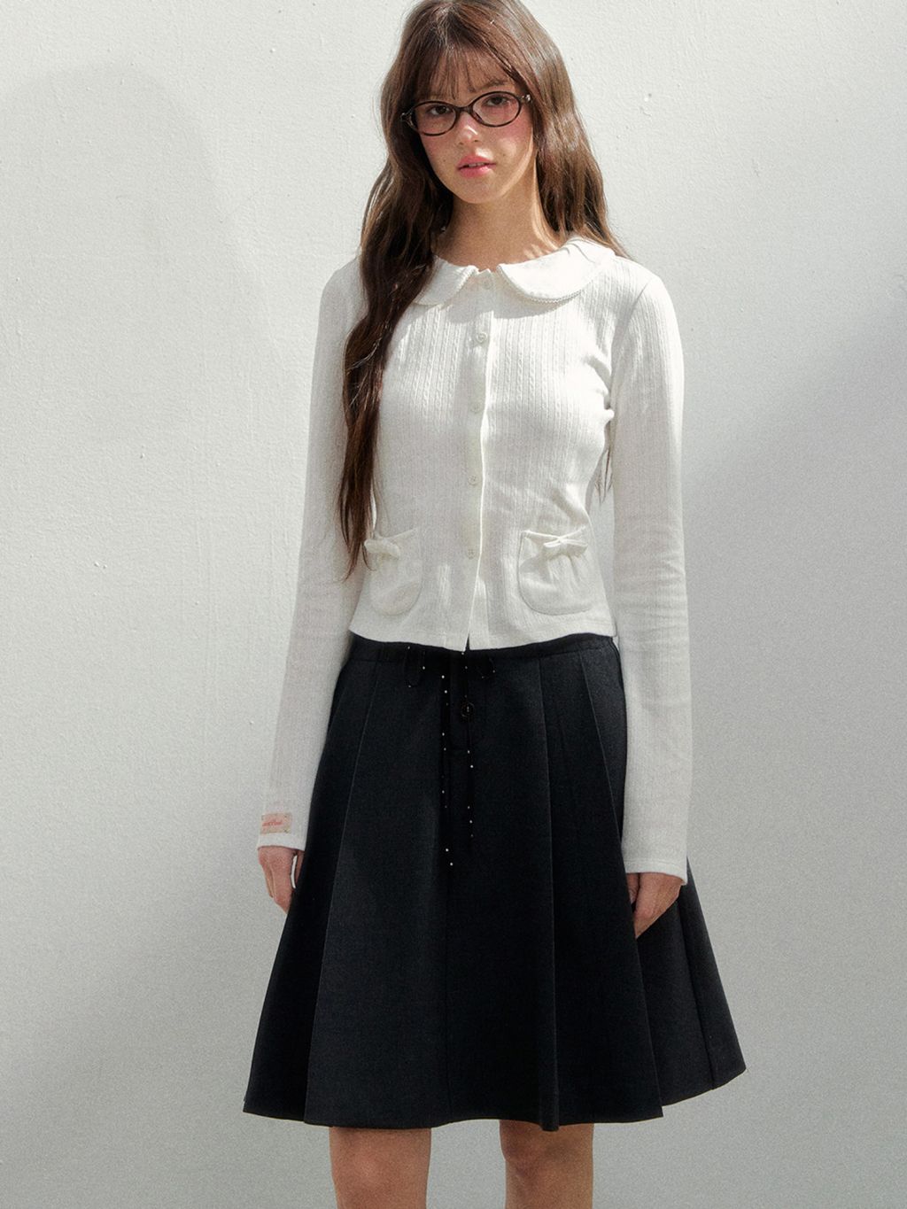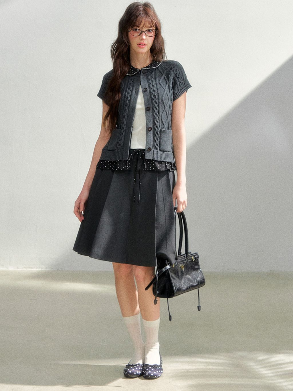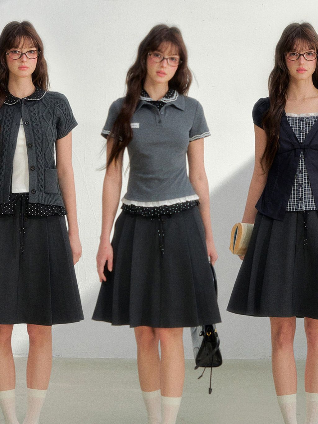 딥한 애쉬-차콜 톤에 도트 웨이스트가 살짝 보이는 레이어드 디테일로, 룩이 단번에 ‘무드 있게’ 정리되는 스커트예요. 걸을 때마다 퍼지는 플리츠 A라인이 하체 라인을 자연스럽게 커버해줘요.