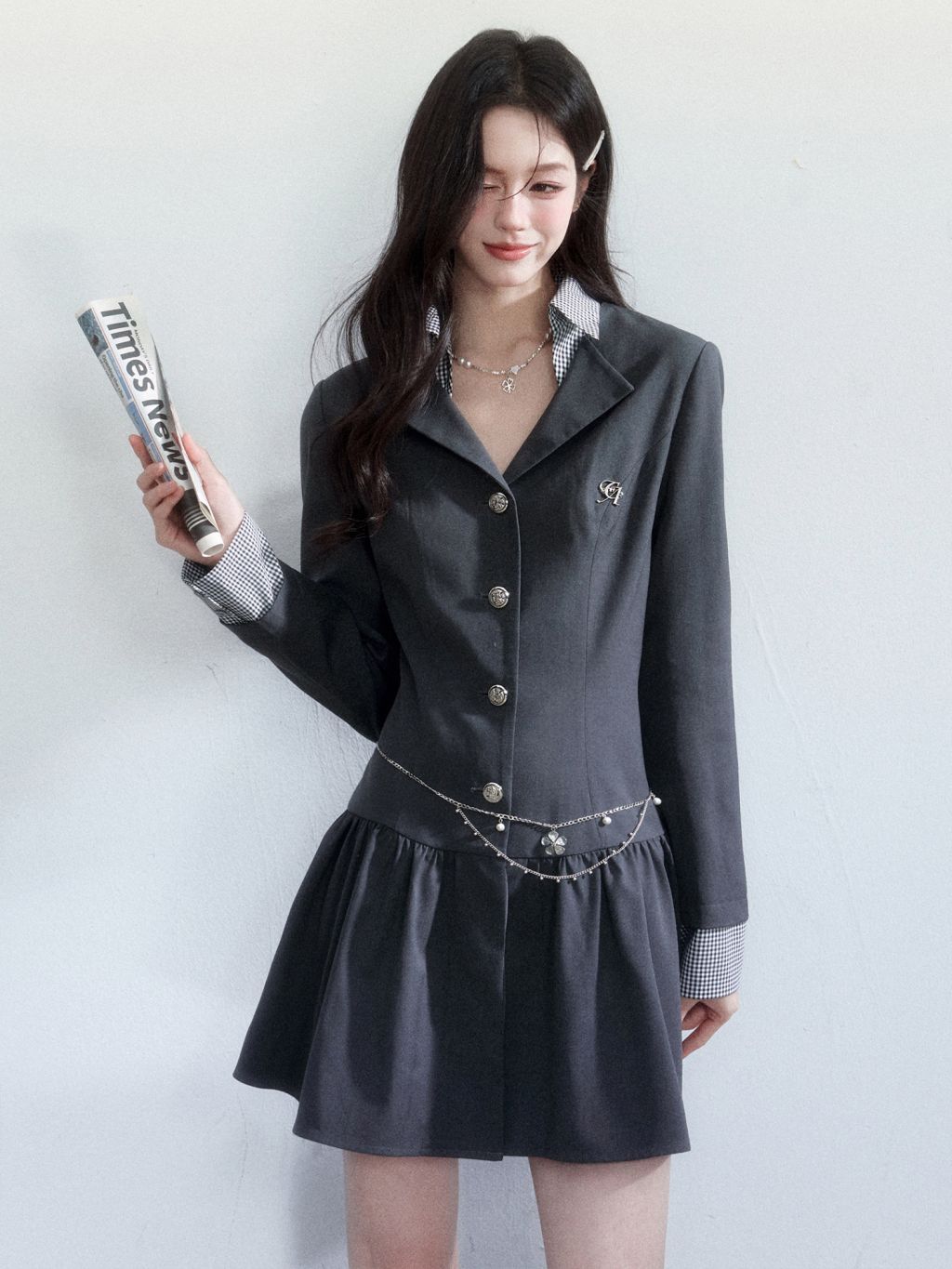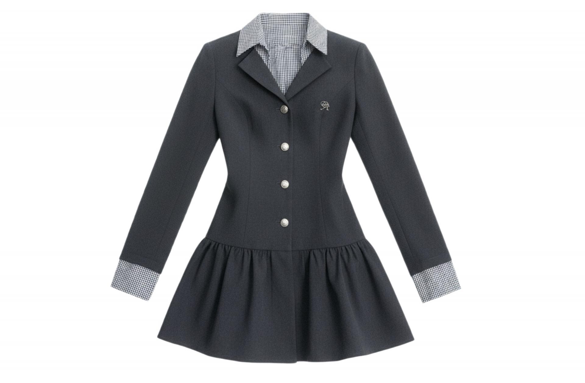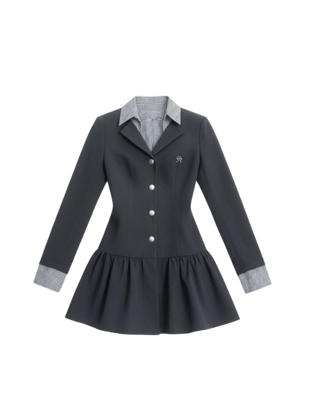블레이저처럼 단정한 테일러드 바디에, 깅엄 체크 카라·커프스로 프레피 무드를 얹은 미니 드레스입니다. 허리는 슬림하게 잡고 스커트는 자연스럽게 퍼져, 깔끔하게 꾸민 날 실루엣이 특히 예쁘게 살아납니다.