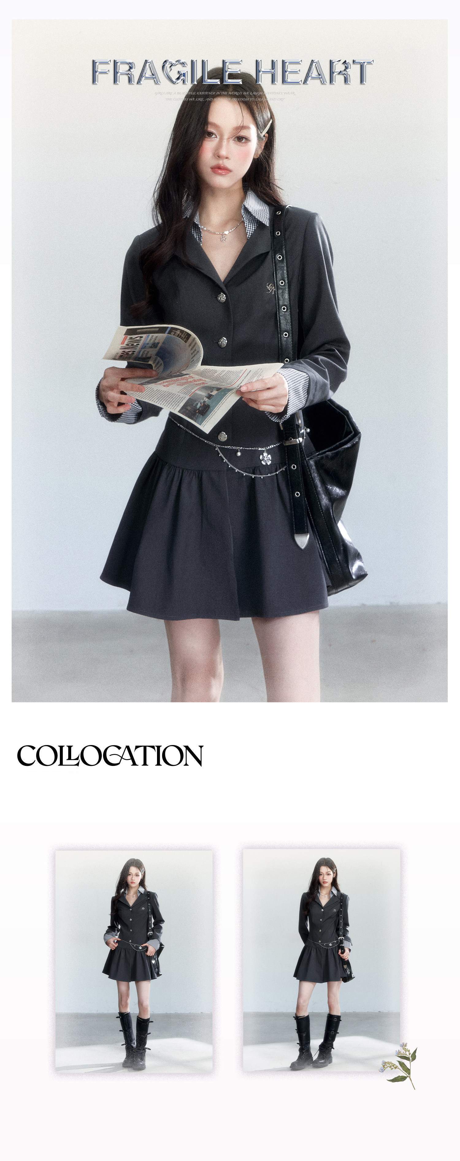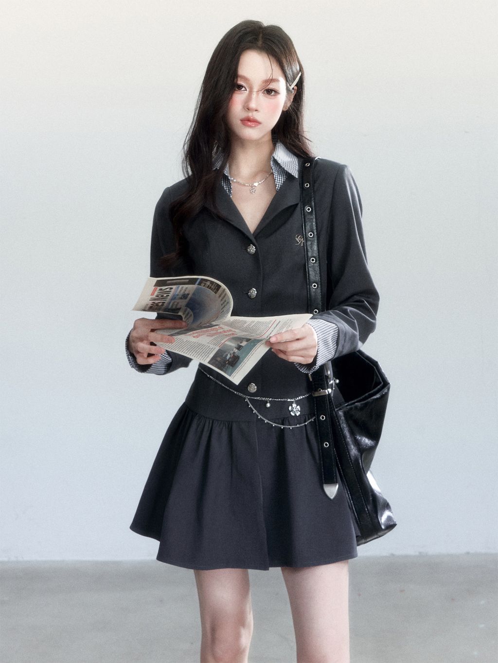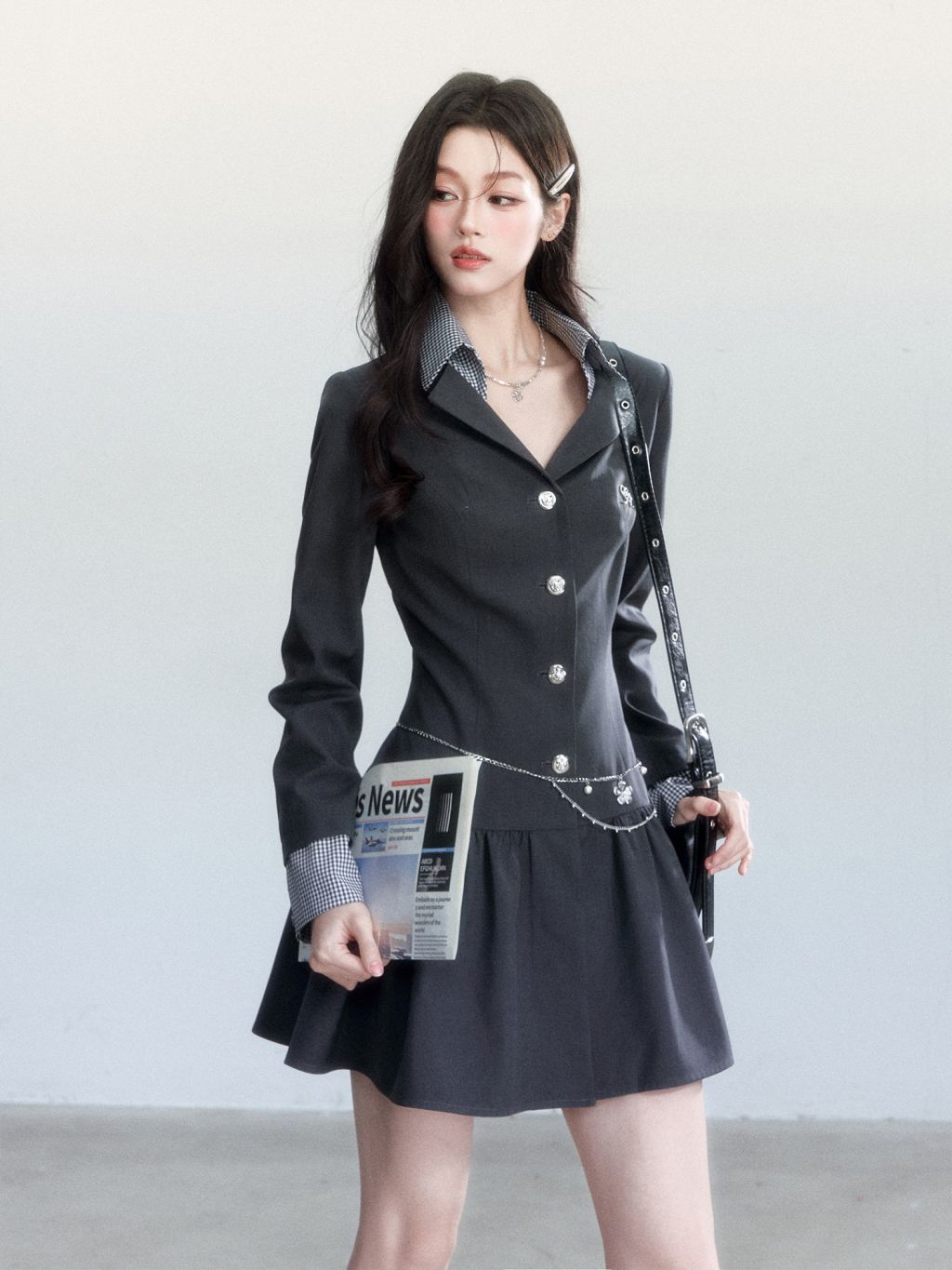 블레이저처럼 단정한 테일러드 바디에, 깅엄 체크 카라·커프스로 프레피 무드를 얹은 미니 드레스입니다. 허리는 슬림하게 잡고 스커트는 자연스럽게 퍼져, 깔끔하게 꾸민 날 실루엣이 특히 예쁘게 살아납니다.
