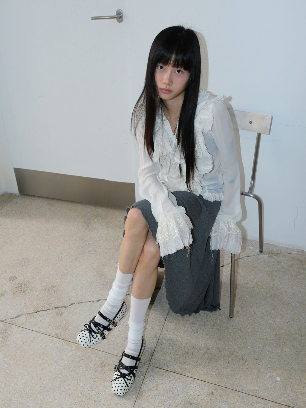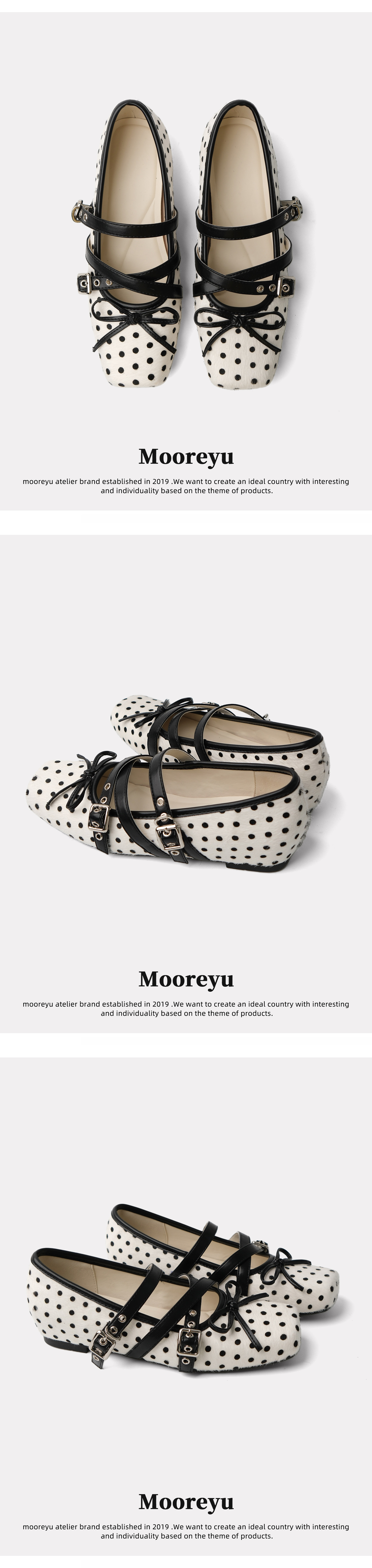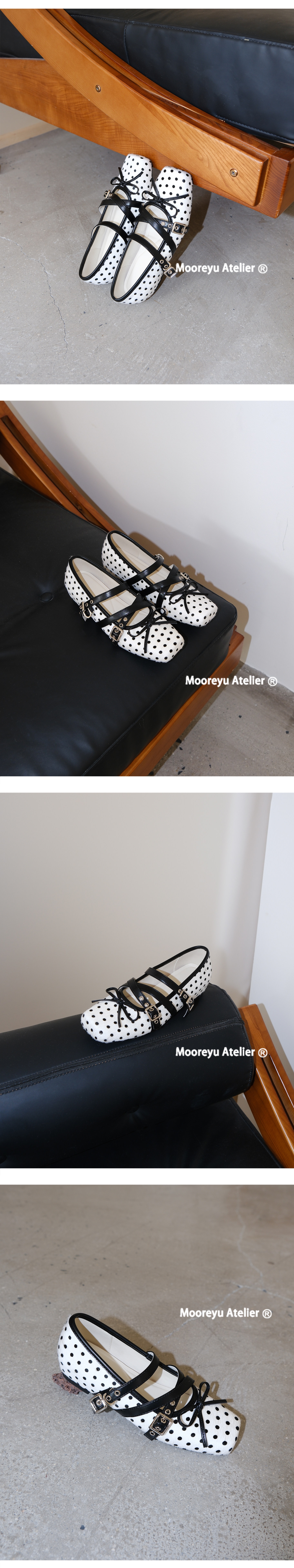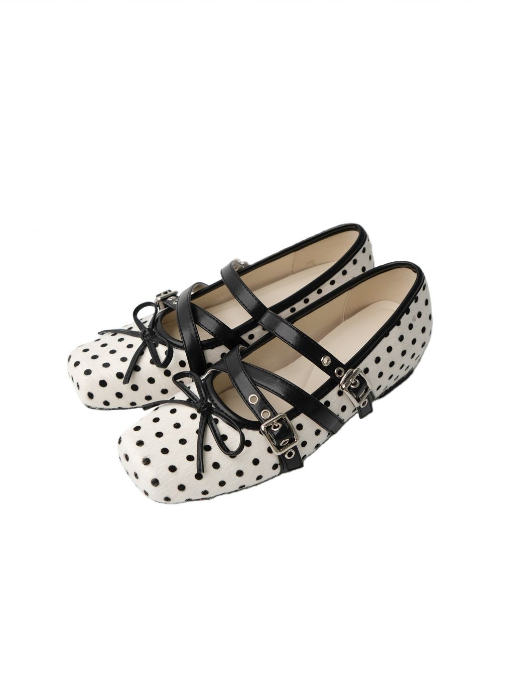 블랙&화이트 도트의 ‘레트로 무드’에 하네스 스트랩 디테일을 더해, 귀엽기만 하지 않은 쿨한 포인트가 살아나는 플랫입니다. 포니헤어 텍스처와 메탈 버클이 룩의 완성도를 한 번에 끌어올립니다.