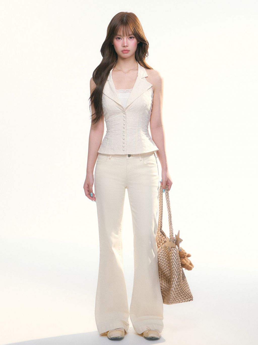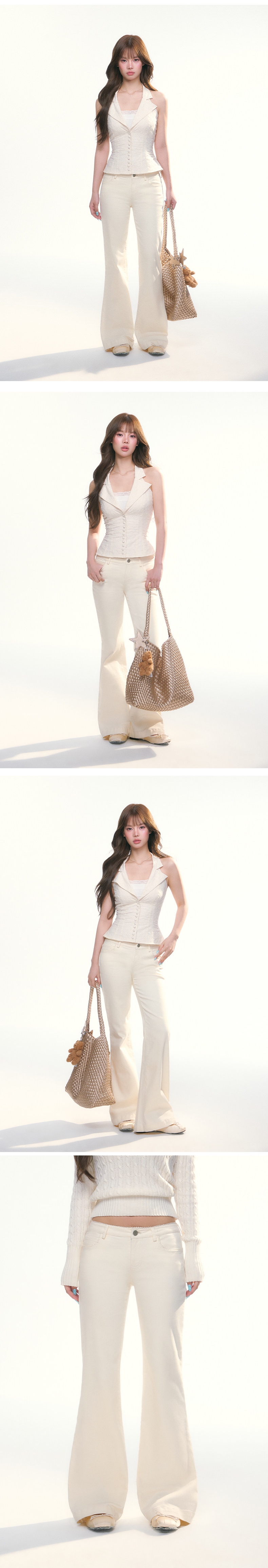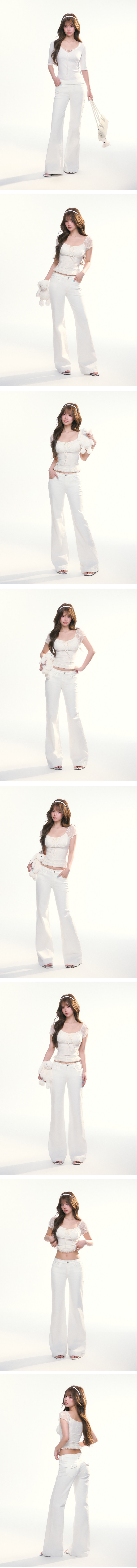 - 허벅지부터 무릎까지는 슬림하게 잡아주고, 밑단은 자연스럽게 퍼지는 부츠컷 실루엣으로 다리가 길어 보이게 연출합니다.