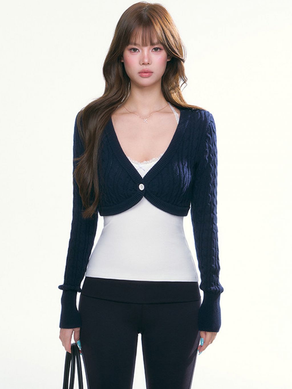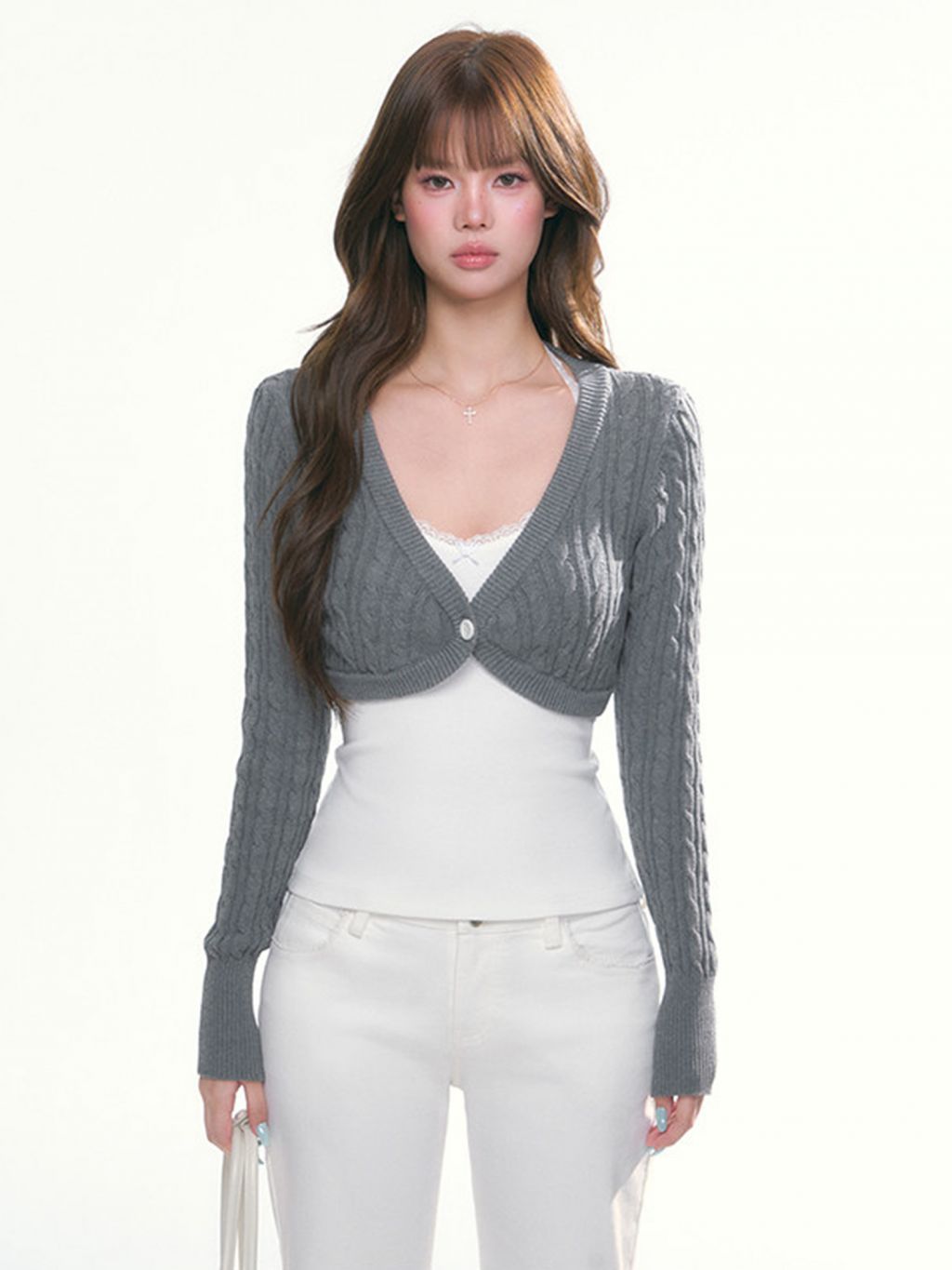깊게 열린 브이넥과 짧게 떨어지는 볼레로 실루엣이 만나, 레이어드만으로도 여리하고 감각적인 분위기를 완성해주는 니트 가디건입니다. 케이블 텍스처가 더해져 심플한 이너 위에도 룩의 포인트가 확실하게 살아나는 아이템입니다.