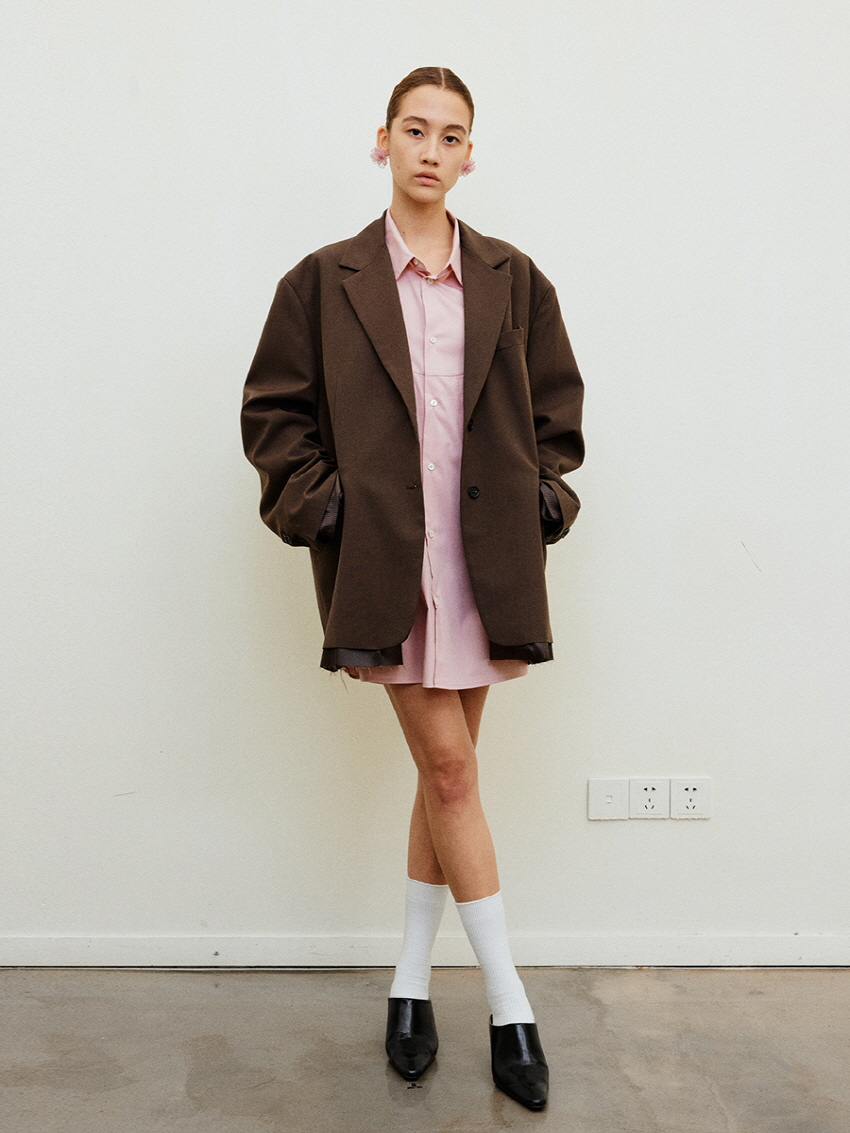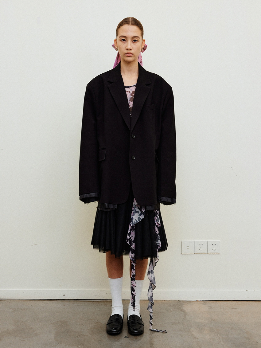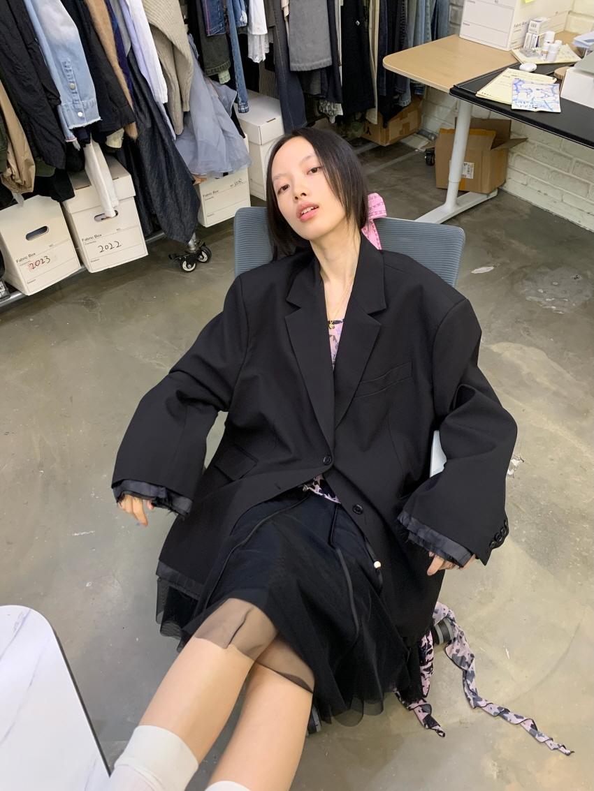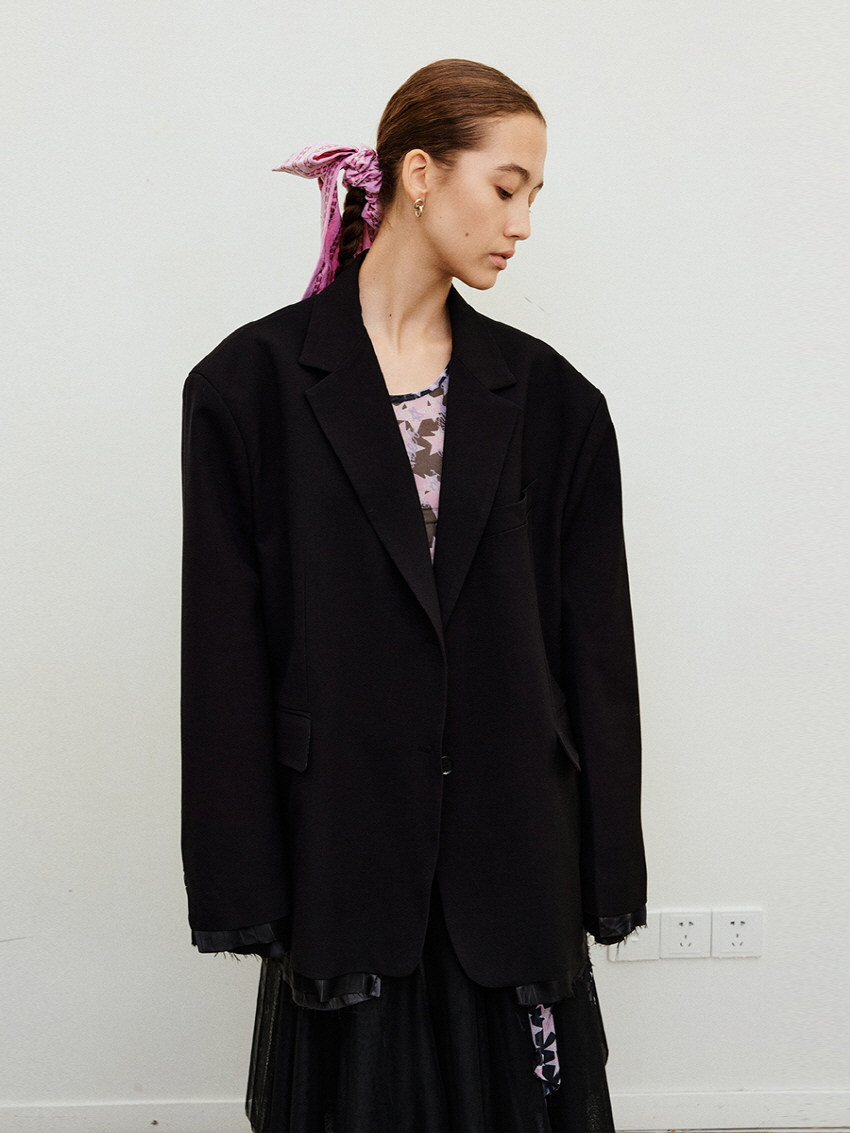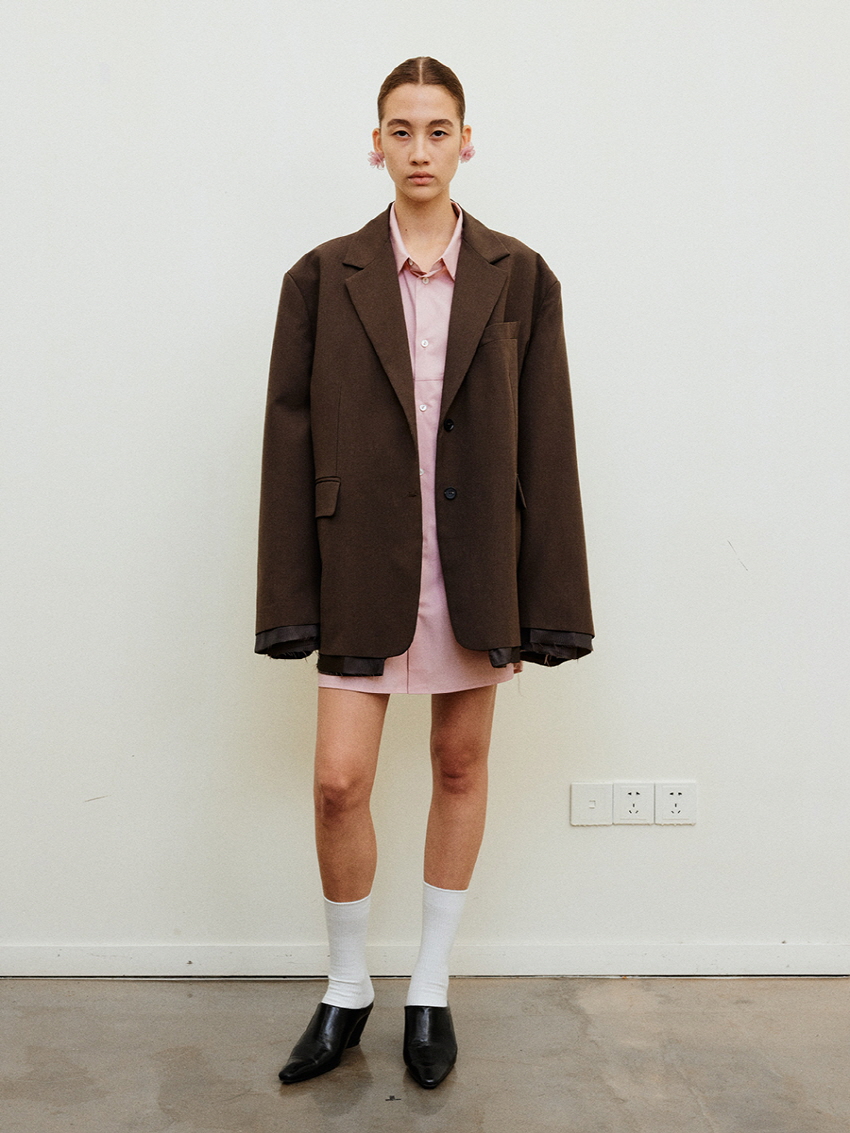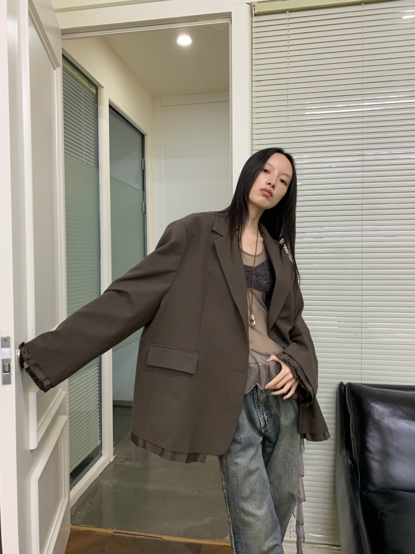 루즈 핏의 트림 레이어드 디테일이 유니크한 블레이져입니다.