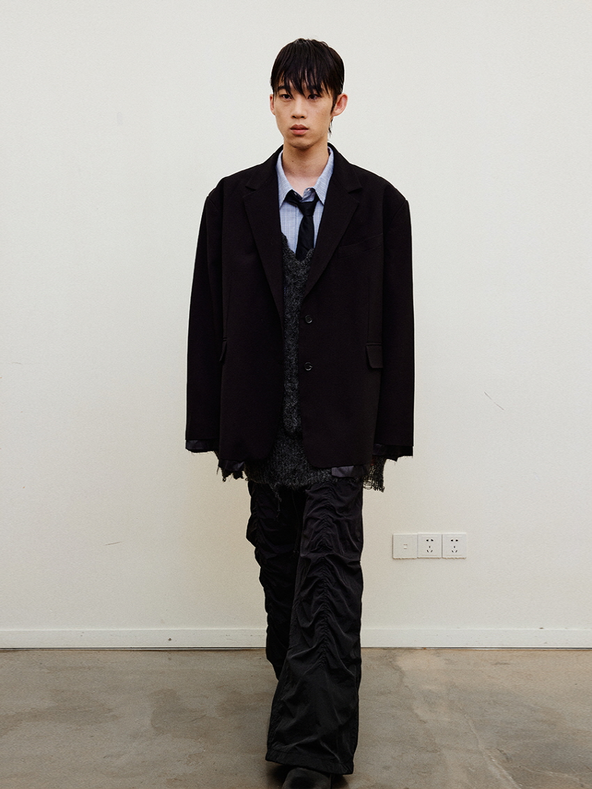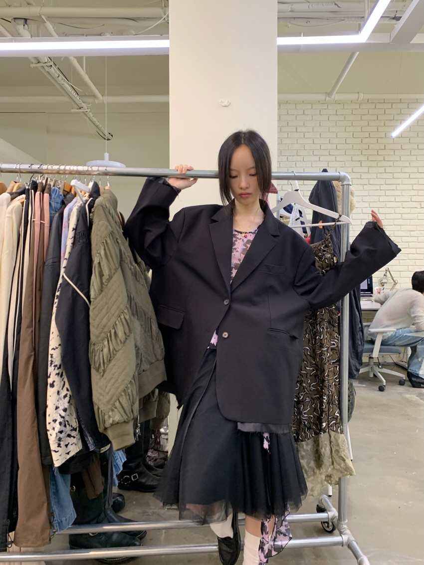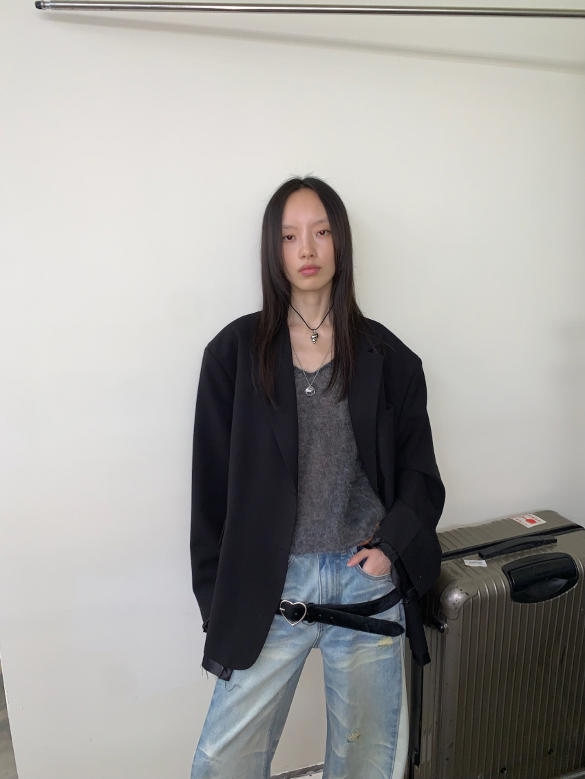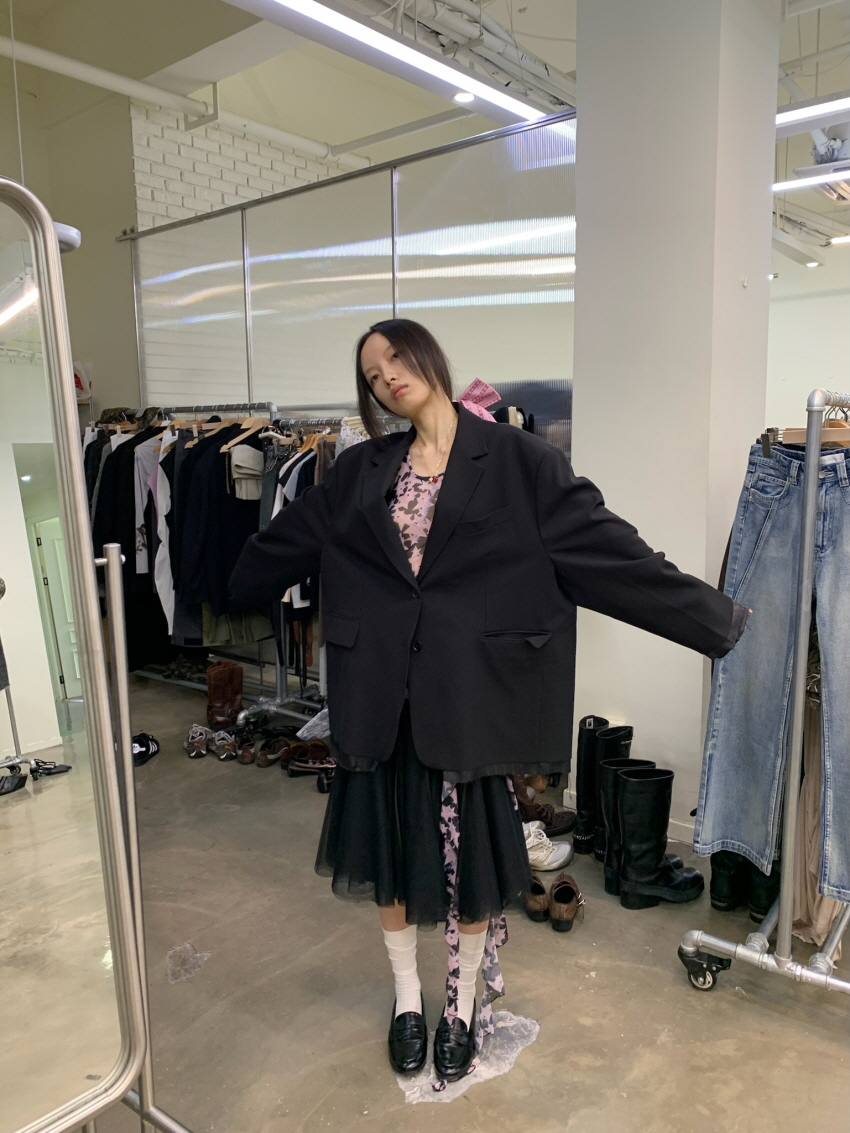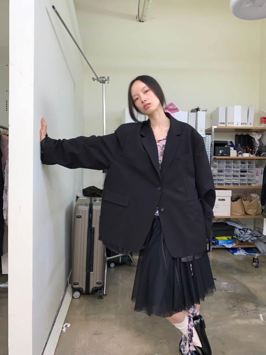 루즈 핏의 트림 레이어드 디테일이 유니크한 블레이져입니다.