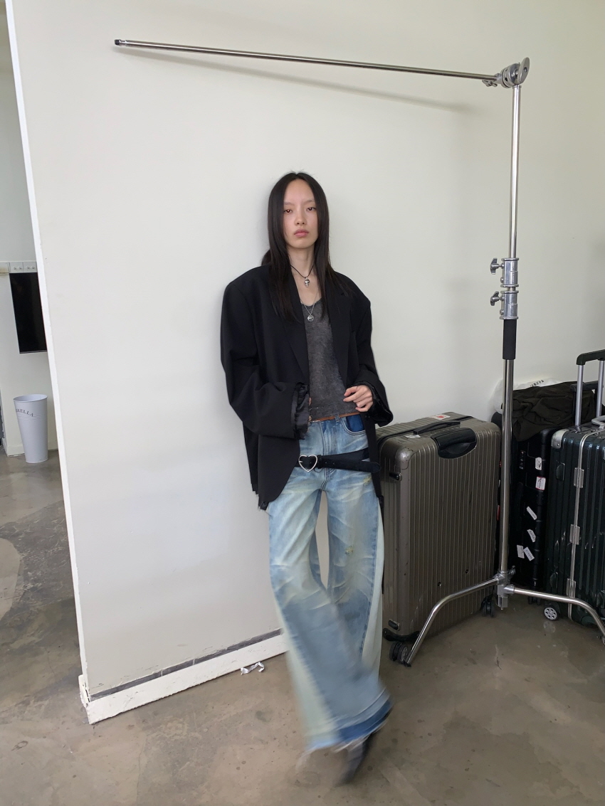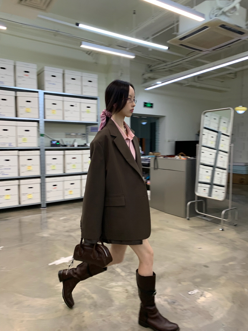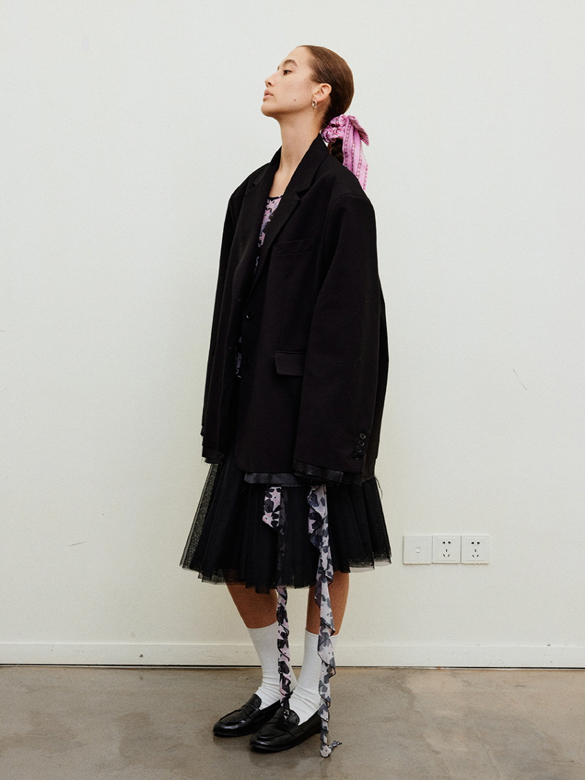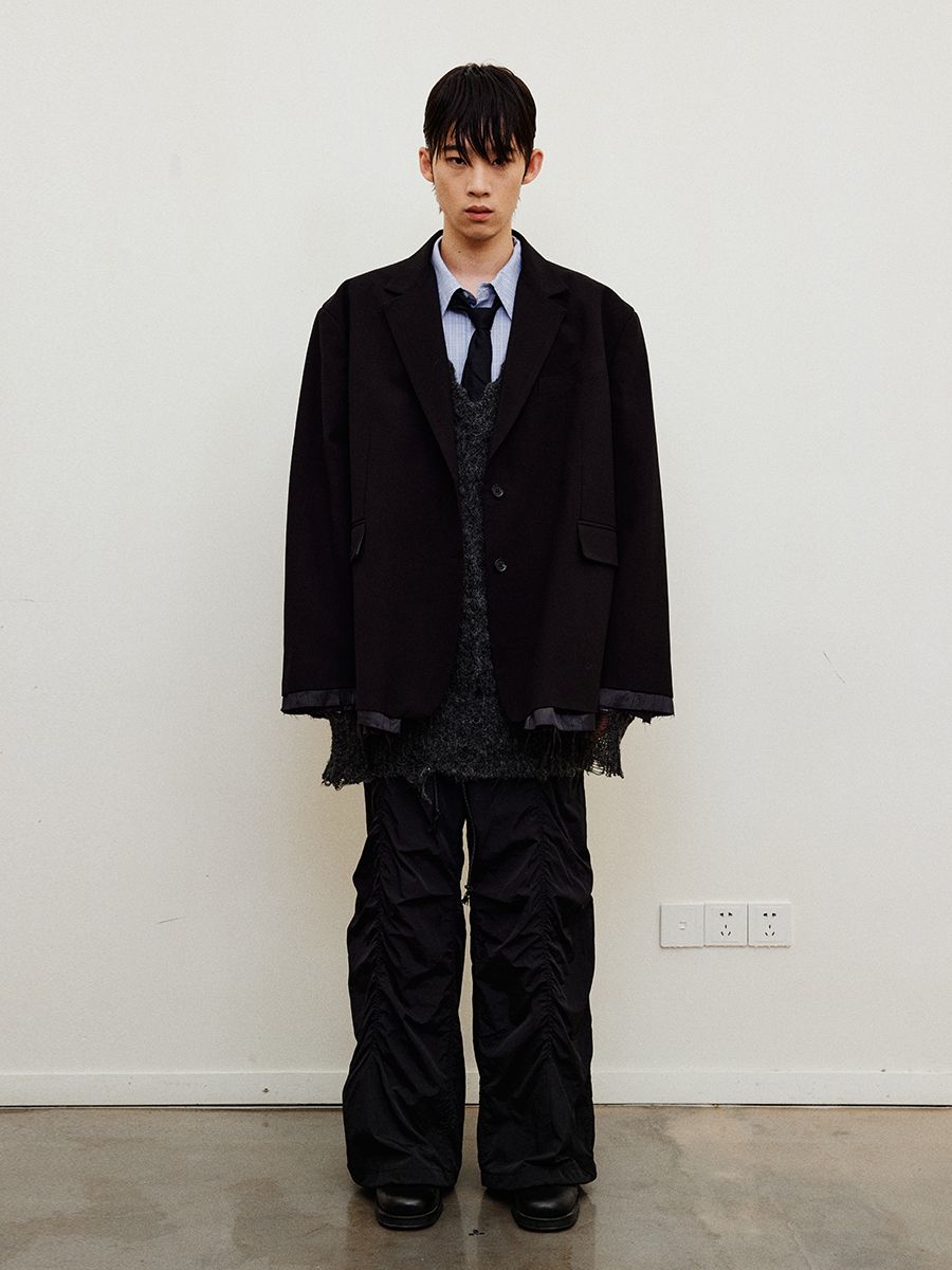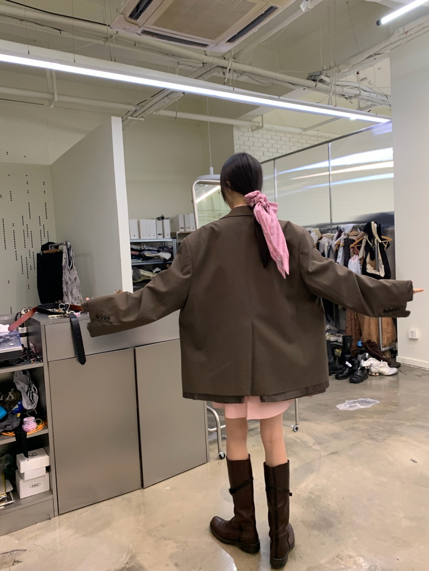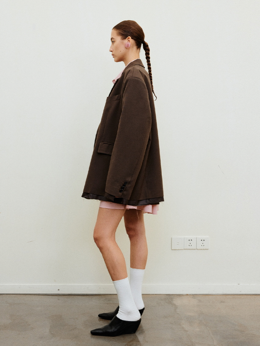 루즈 핏의 트림 레이어드 디테일이 유니크한 블레이져입니다.