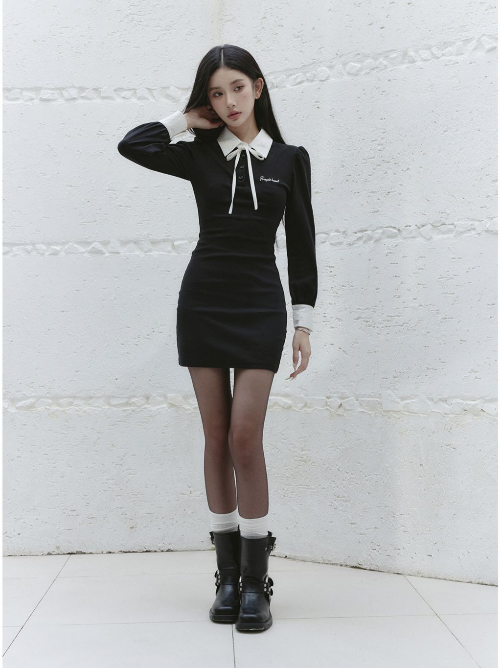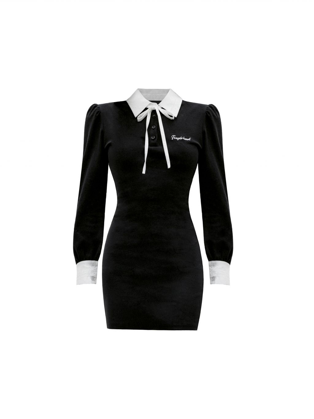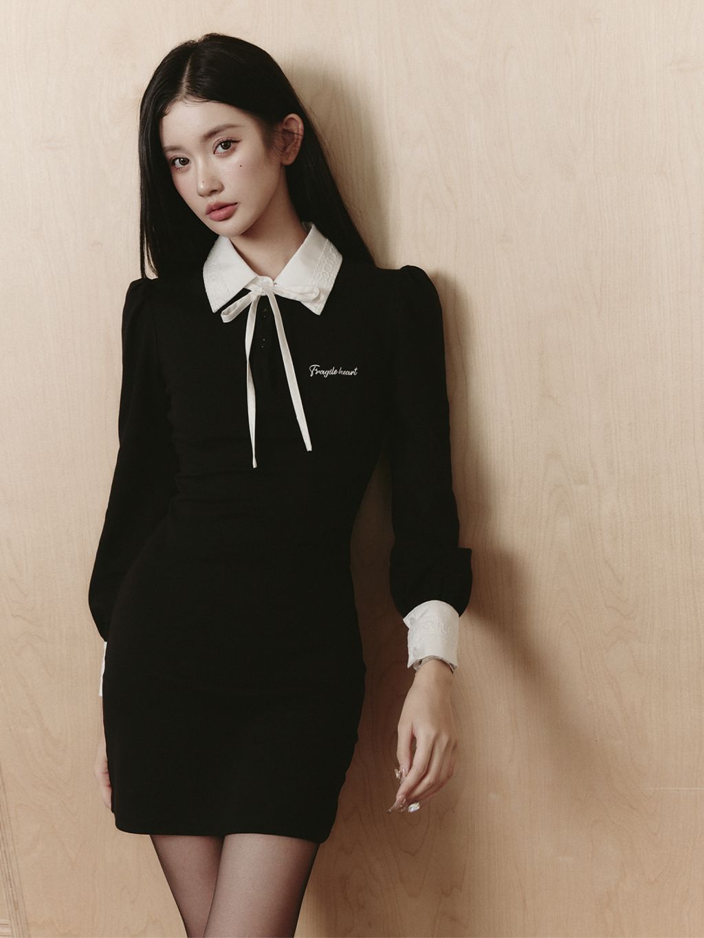 전체적으로 슬림한 라인의 리본 셔츠 블랙 드레스입니다.