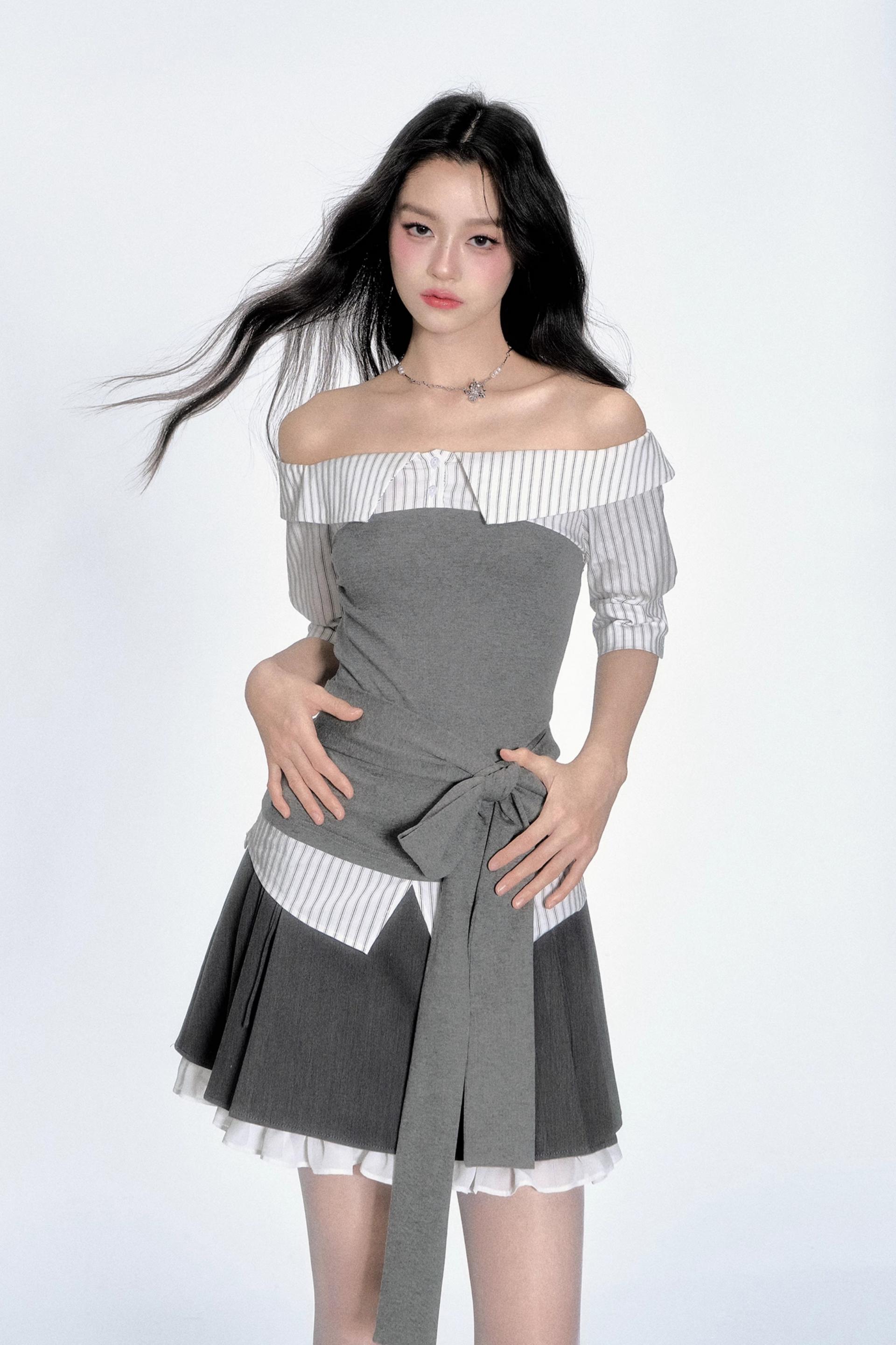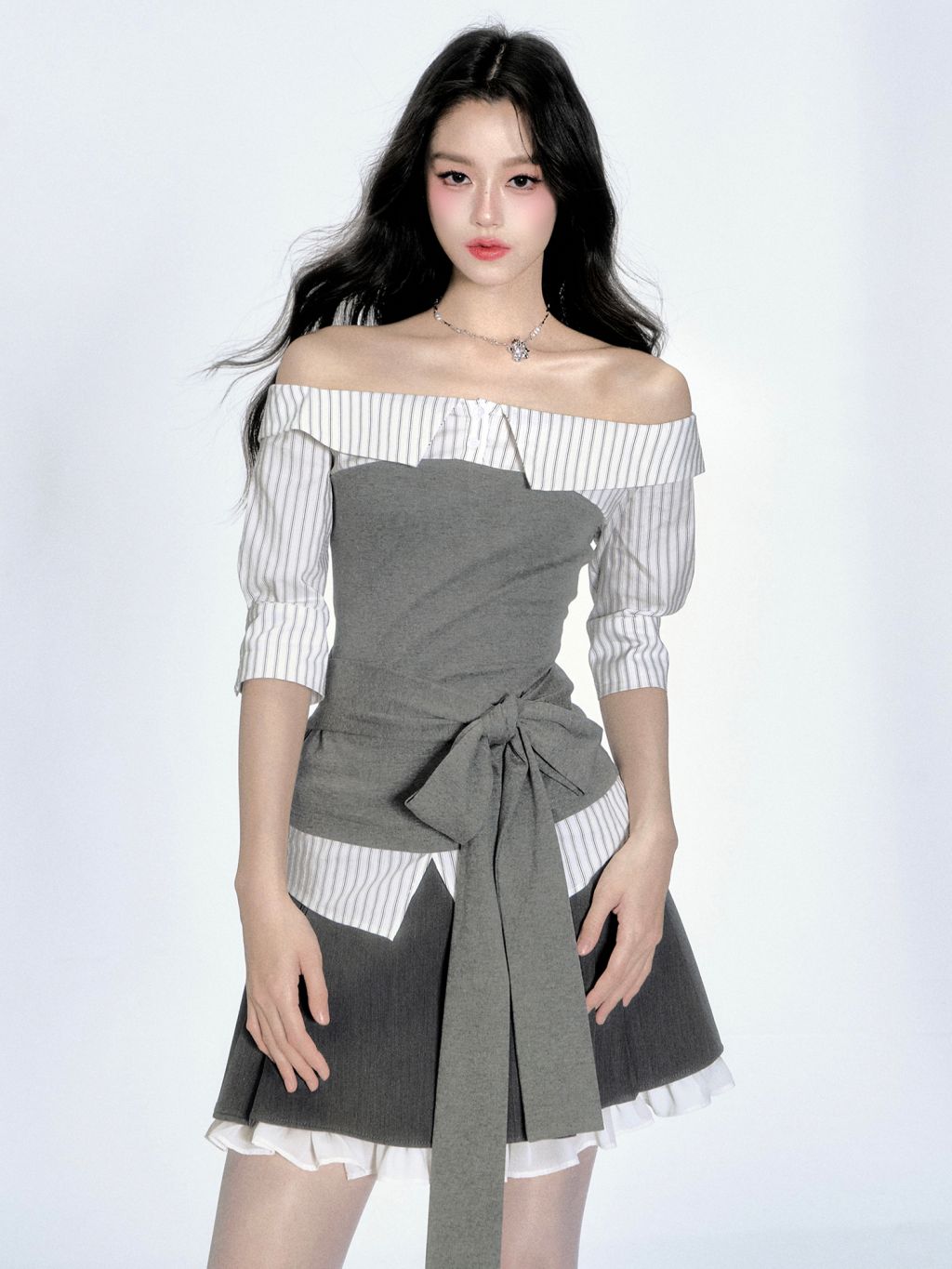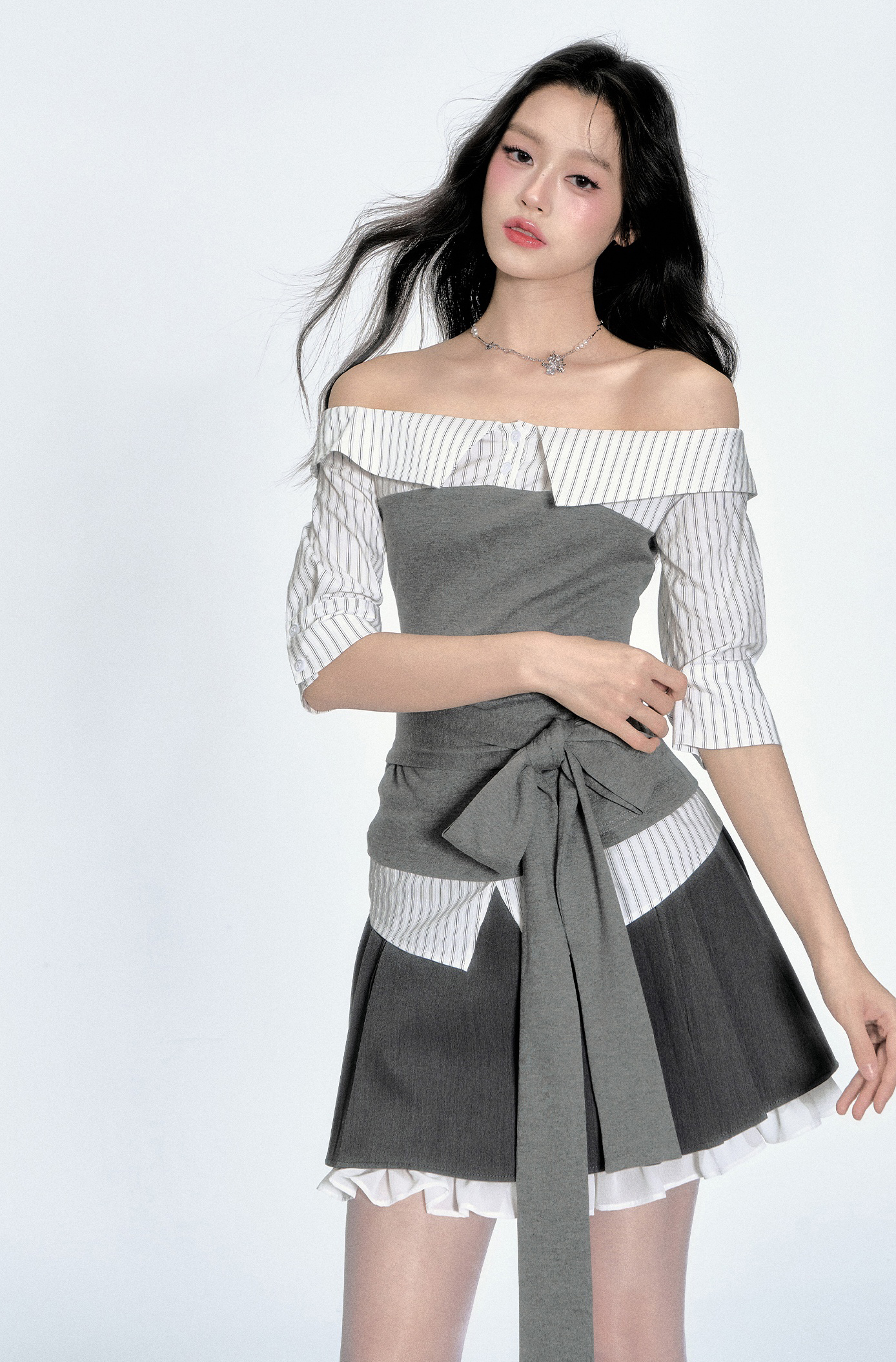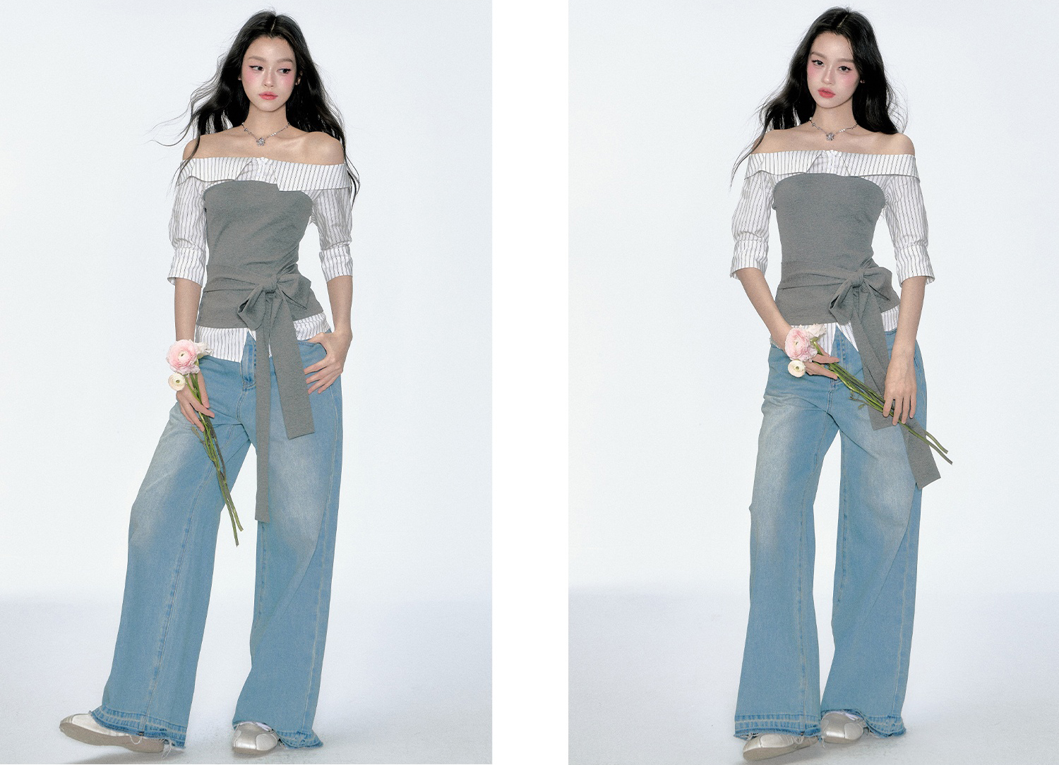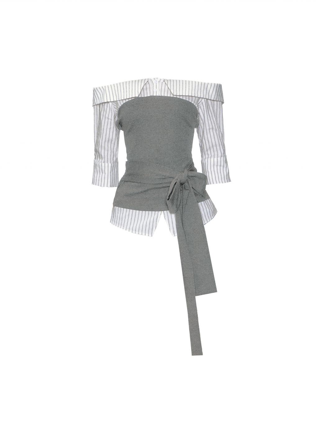 셔츠와 톱을 겹쳐 입은 듯한 디자인에 오프숄더 포인트를 더해, 우아하면서도 키치한 스타일을 연출하며 사이드 리본으로 허리 실루엣을 잡아주어 페미닌한 무드까지 살린 아이템입니다.
