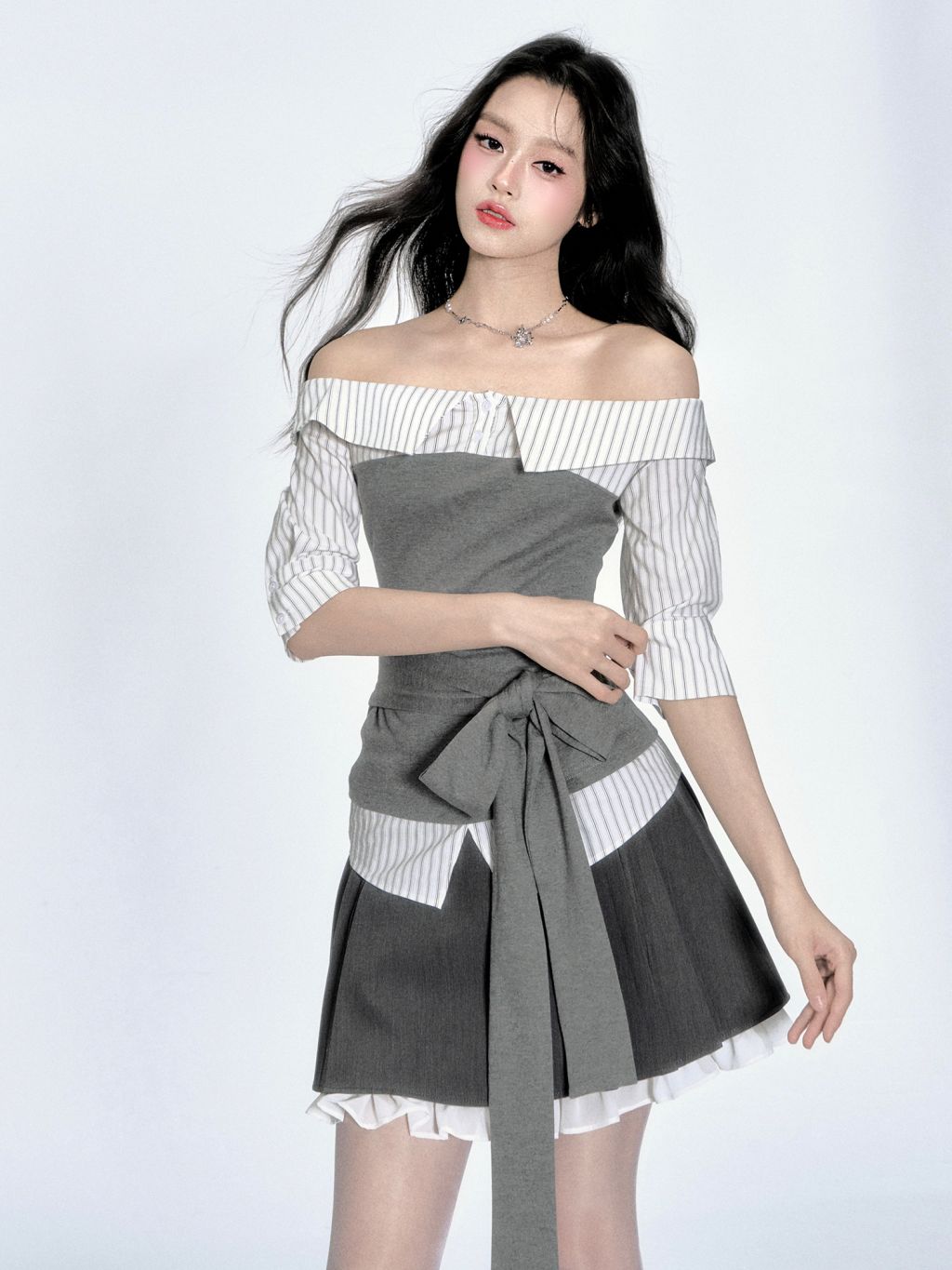 - 넓게 파인 오프숄더 네크라인으로 데콜테 라인을 드러내며 여리한 분위기 연출