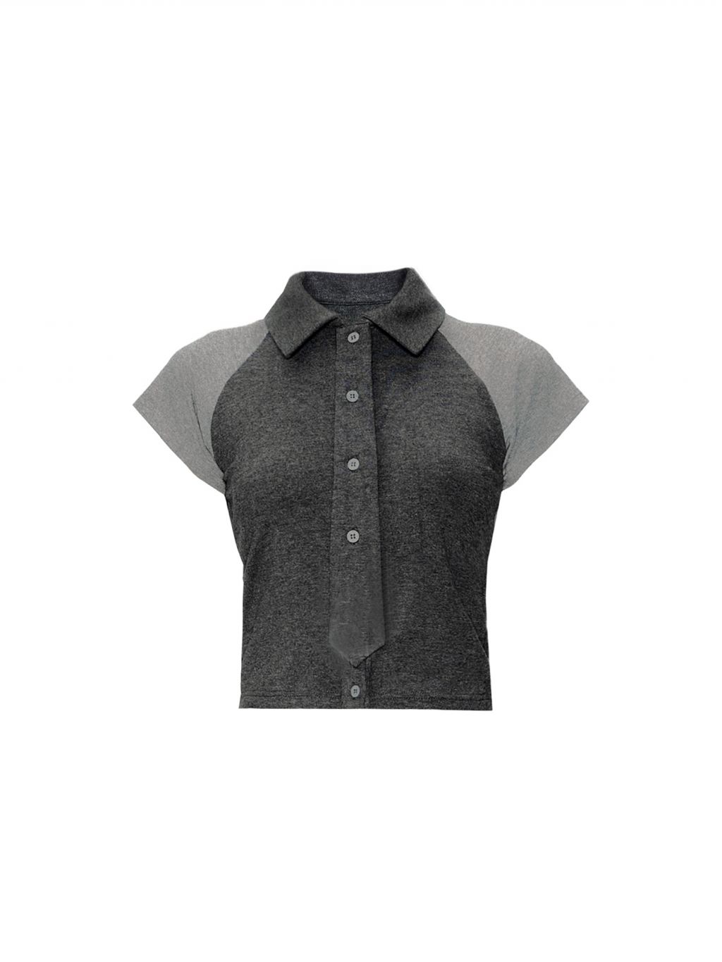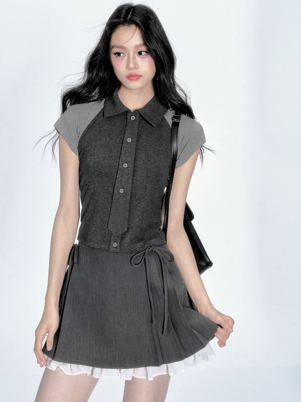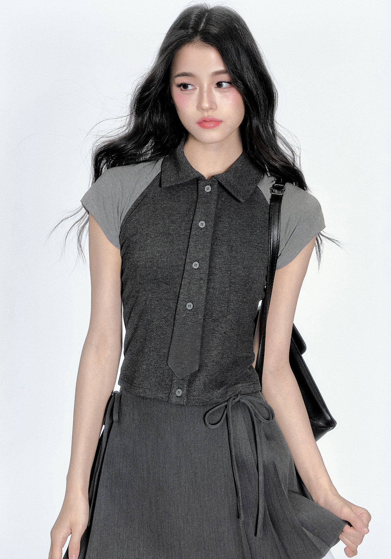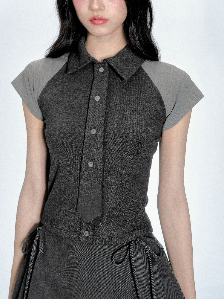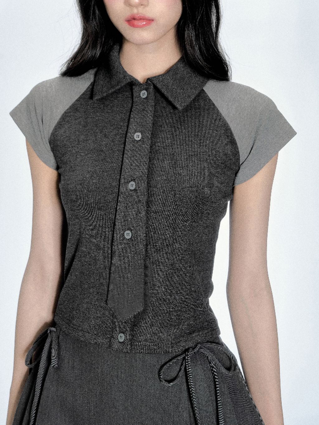 단정한 듯 유니크한 무드를 연출하는 디텐션 클럽 무드의 타이 셔츠 탑으로 그레이 배색과 니트 소재의 조합이 시크하면서도 러블리한 매력을 더해주며 미니 타이 디테일이 룩에 포인트를 더합니다.